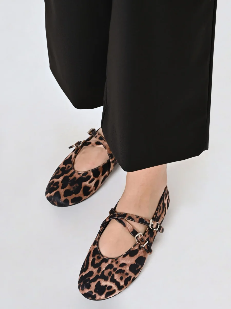 Ballerine in tessuto con stampa animalier dal carattere deciso e femminile. Il modello è completato da doppi cinturini con fibbie regolabili, per una calzata sicura e decorativa. La suola in gomma garantisce comfort e aderenza, rendendole ideali per l’uso quotidiano. Perfette per aggiungere un tocco grintoso a look casual o per sdrammatizzare outfit più eleganti.