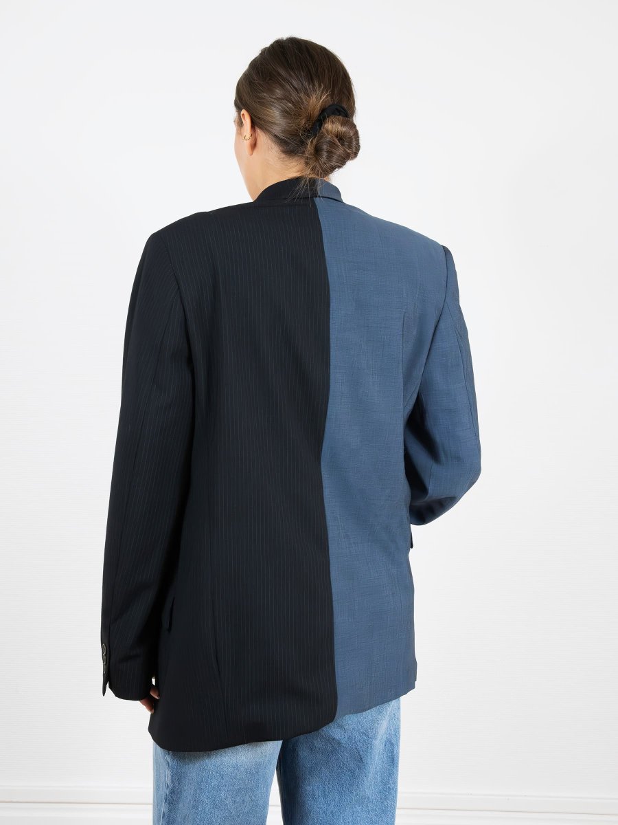 Blazer bi-matière à la coupe loose, multiples poches extérieures et intérieures.