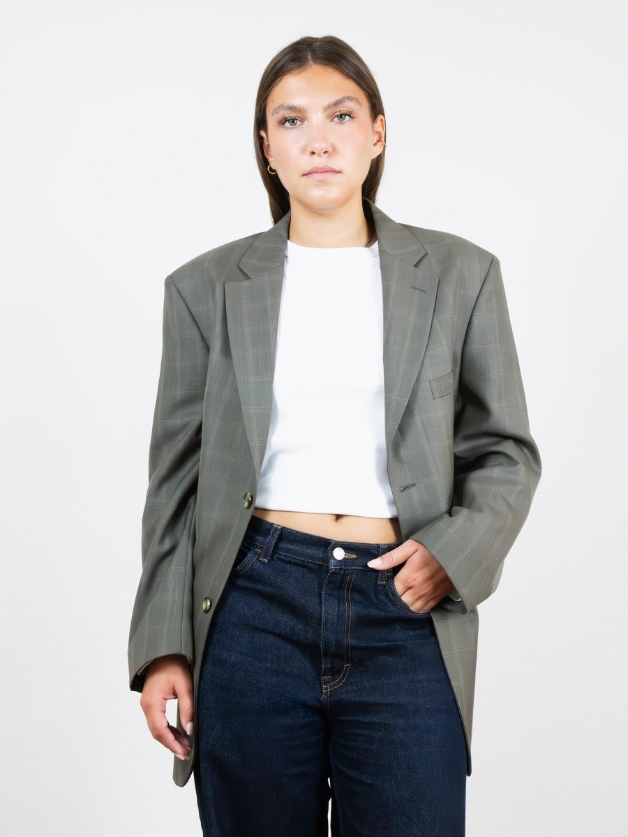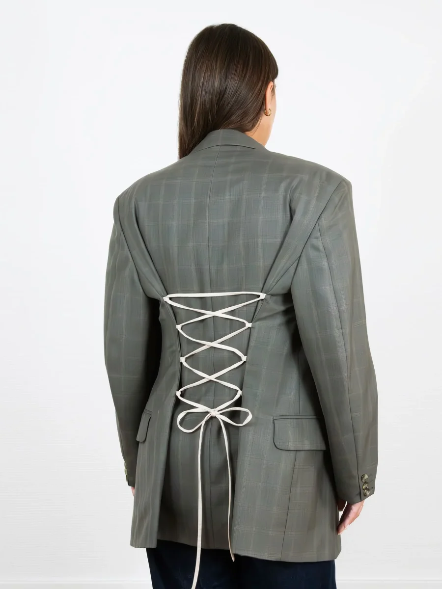 Blazer à la coupe cintrée ajustable avec le laçage corset au dos. Gris motif et lacet beige.