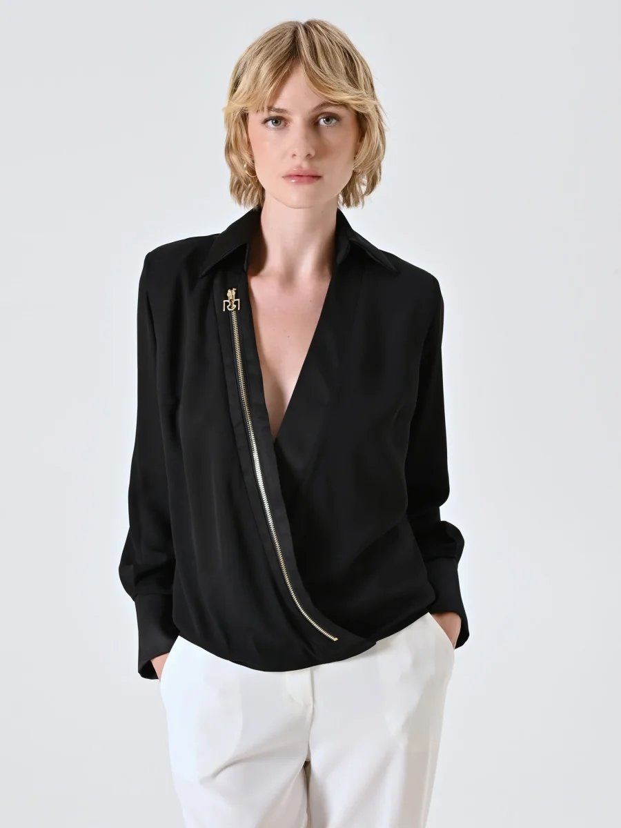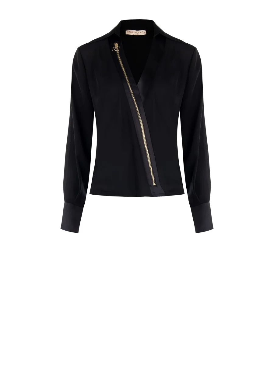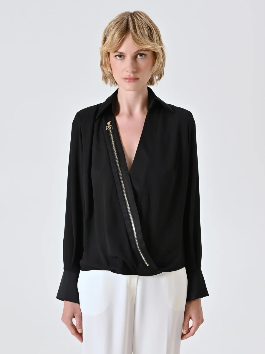 Realizzata con una combinazione di crepe georgette e raso, la Blusa Camicia Nera con Zip Dorata presenta una struttura leggera e fluida con colletto e polsini in raso a contrasto. Lo scollo incrociato è valorizzato da una zip dorata decorativa con cursore RR, che aggiunge un tocco luminoso e distintivo al design.