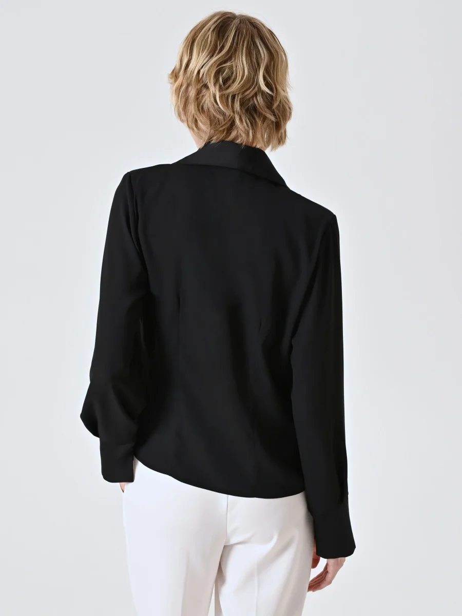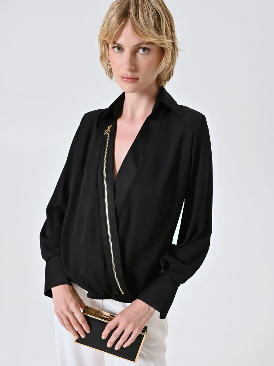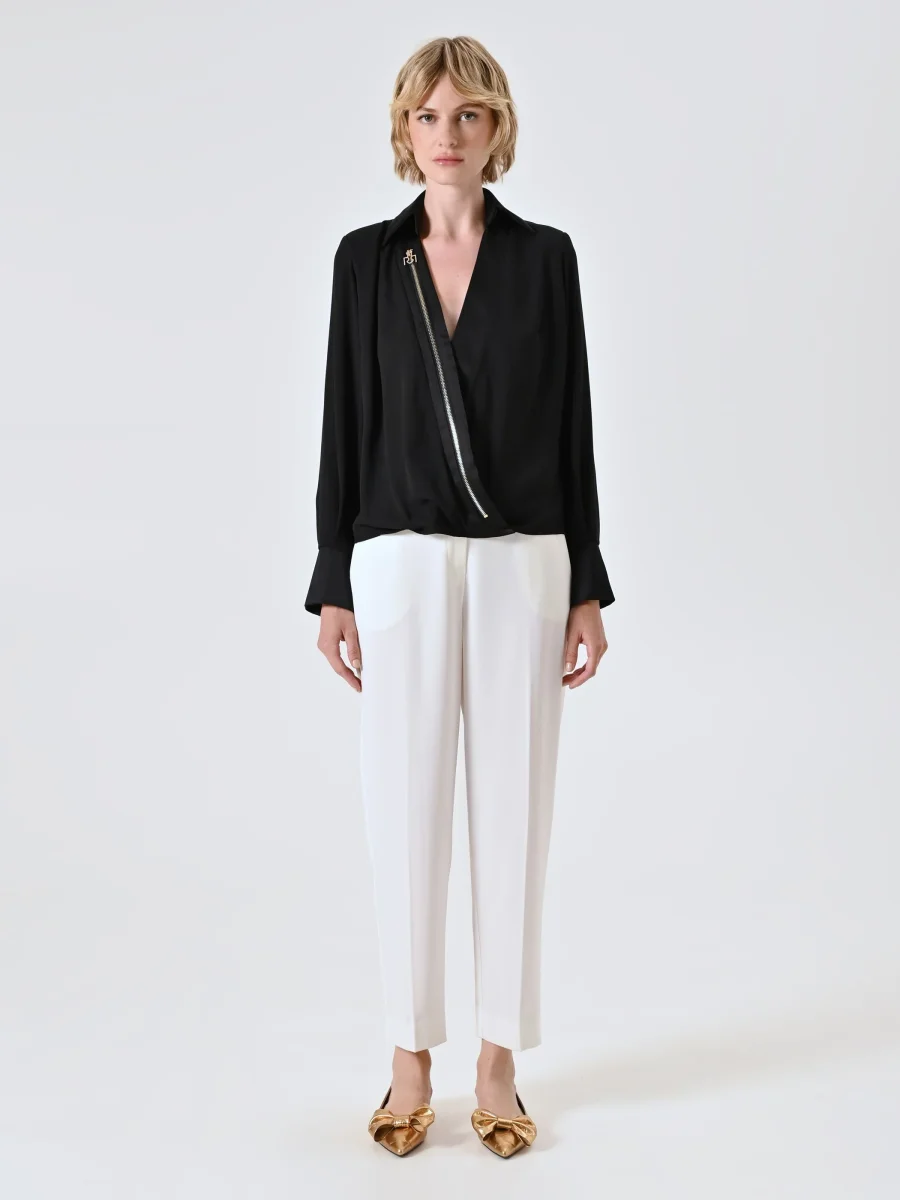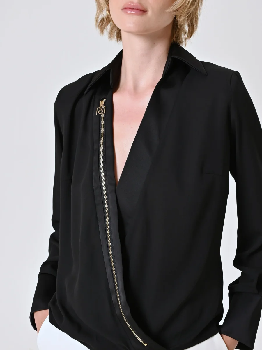 Realizzata con una combinazione di crepe georgette e raso, la Blusa Camicia Nera con Zip Dorata presenta una struttura leggera e fluida con colletto e polsini in raso a contrasto. Lo scollo incrociato è valorizzato da una zip dorata decorativa con cursore RR, che aggiunge un tocco luminoso e distintivo al design.