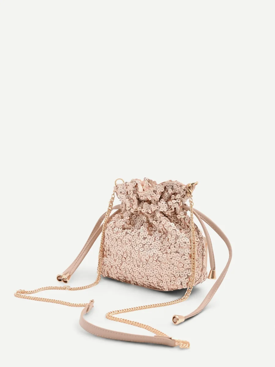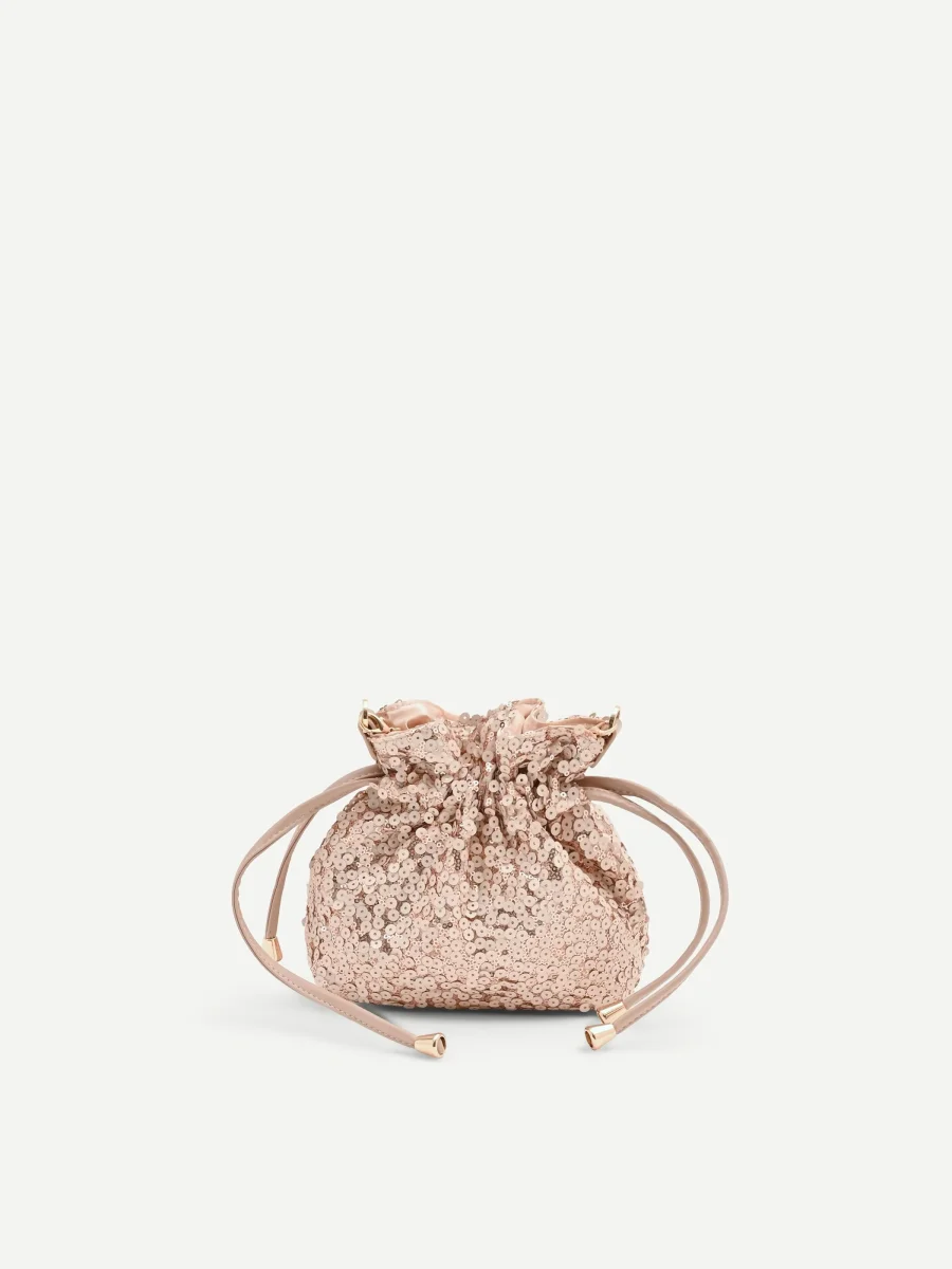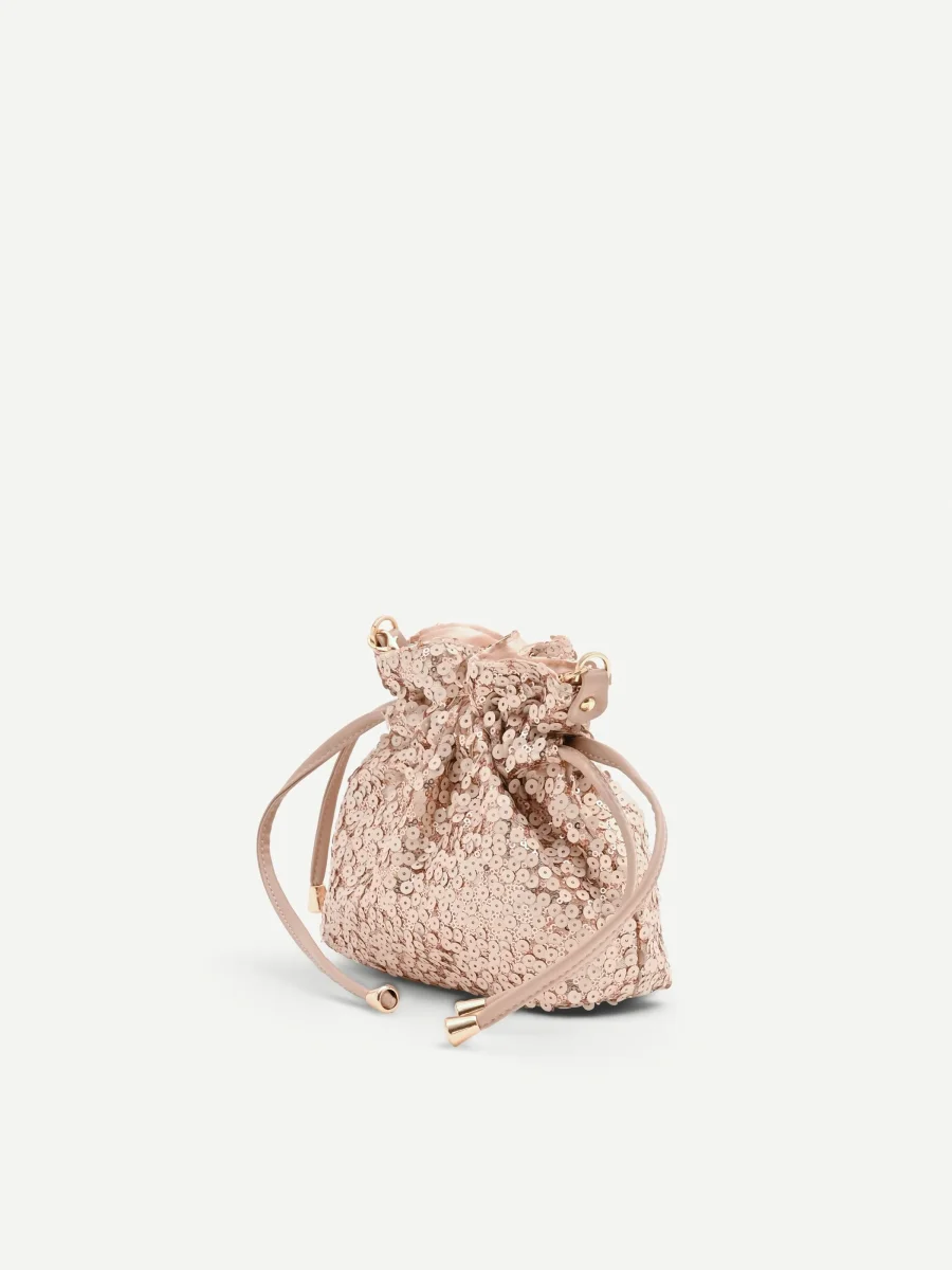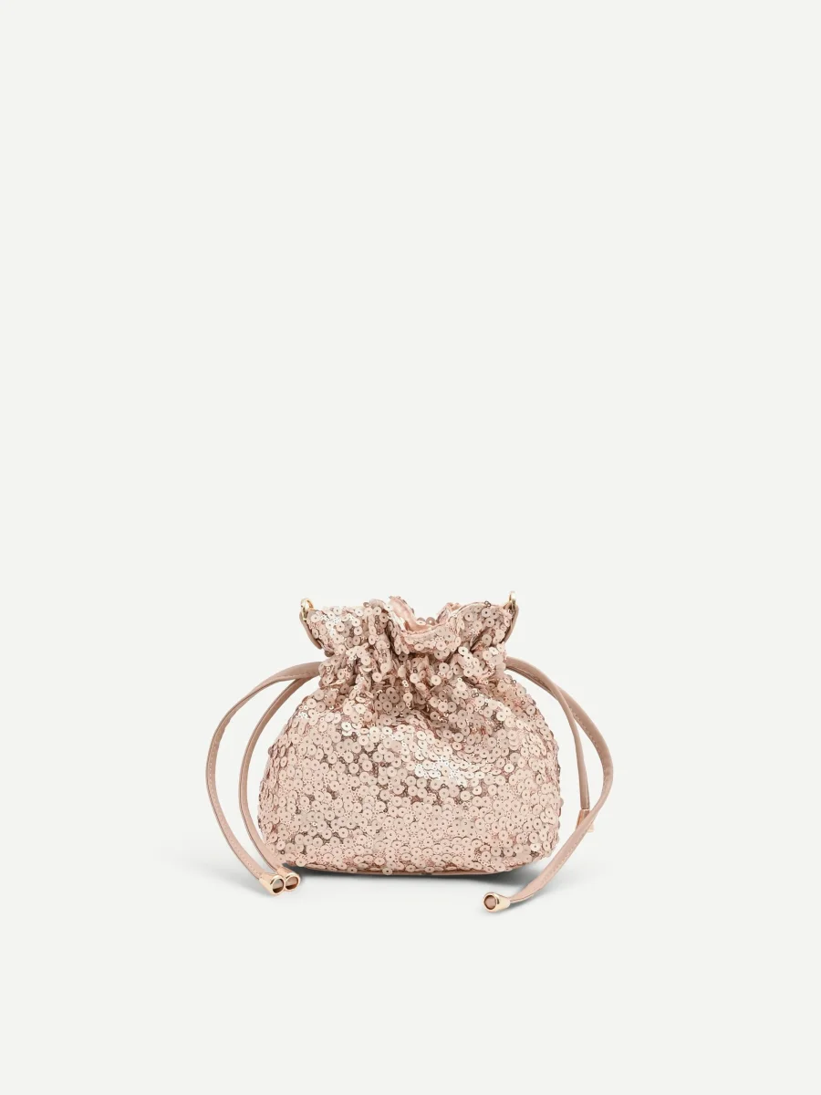 La sua silhouette morbida è interamente rivestita da un manto di paillettes tonde e luminose, che creano giochi di riflessi cangianti sui toni del rosa. Un design contemporaneo che unisce praticità e un tocco di ricercatezza, perfetto per chi non vuole rinunciare a un accessorio d’impatto. La chiusura combina la sicurezza di un bottone automatico con l’eleganza di una coulisse, formata da doppi laccetti in tessuto liscio. I terminali metallici color oro che rifiniscono i laccetti sono un dettaglio di stile che impreziosisce ulteriormente il modello.