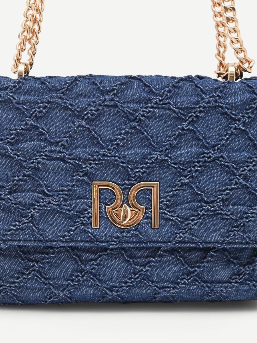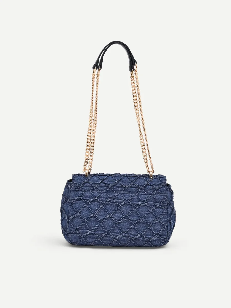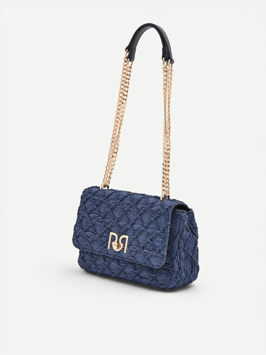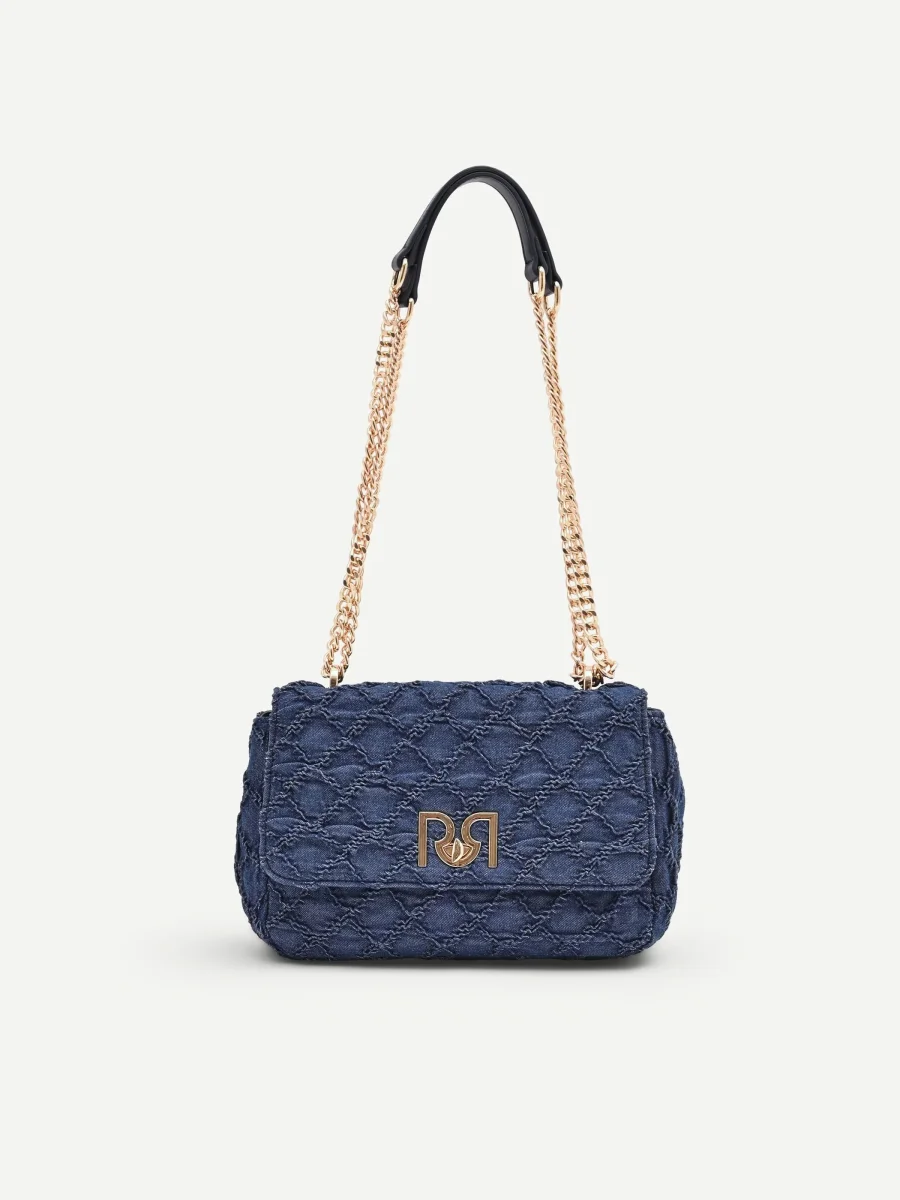 Un dialogo tra texture e dettagli luminosi definisce il carattere della borsa a tracolla in tessuto jeans blu, un accessorio versatile pensato per la donna contemporanea.