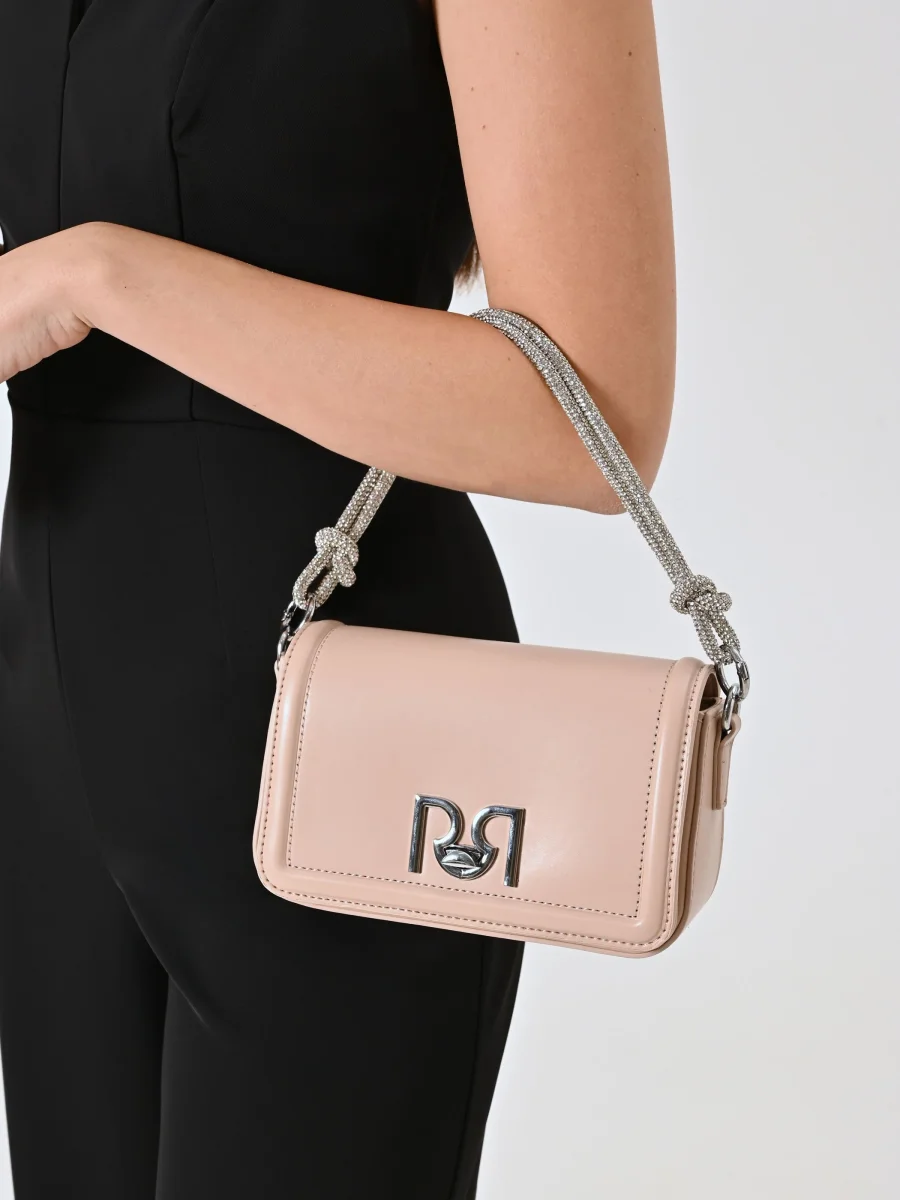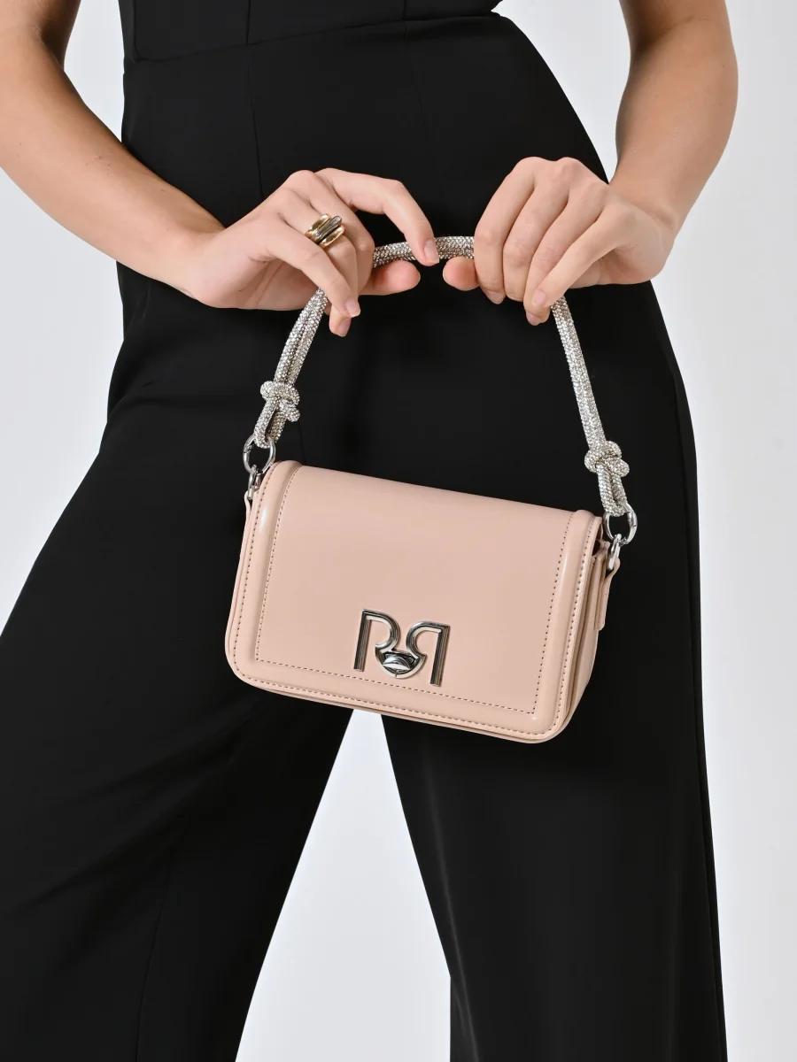 Borsa compatta con pattina rigida e chiusura magnetica, arricchita dal logo RR in metallo dorato sul davanti. Il manico corto in tubolare metallico con strass allover e nodo dona un tocco brillante e sofisticato. Perfetta per aggiungere un dettaglio luminoso ai look da sera o da occasione. Tracolla removibile. Interno foderato con tasche. Chiusura mezzaluna. Accessori dorati. Misure: 20x11x6 cm.