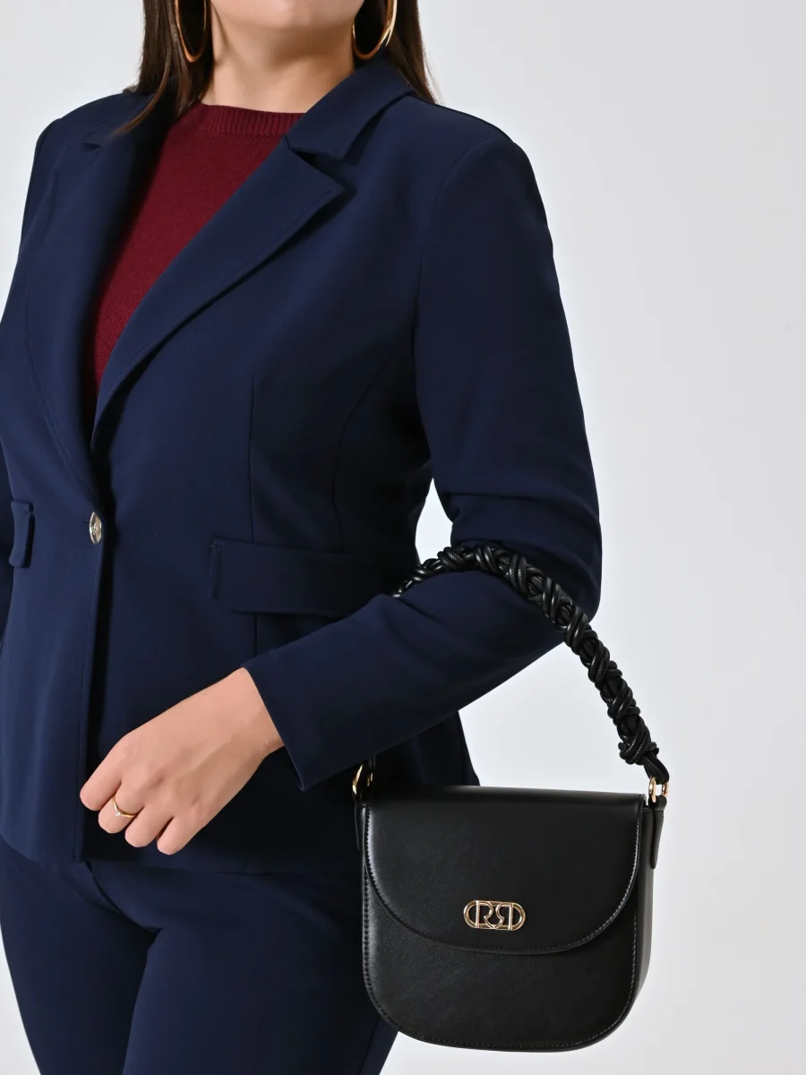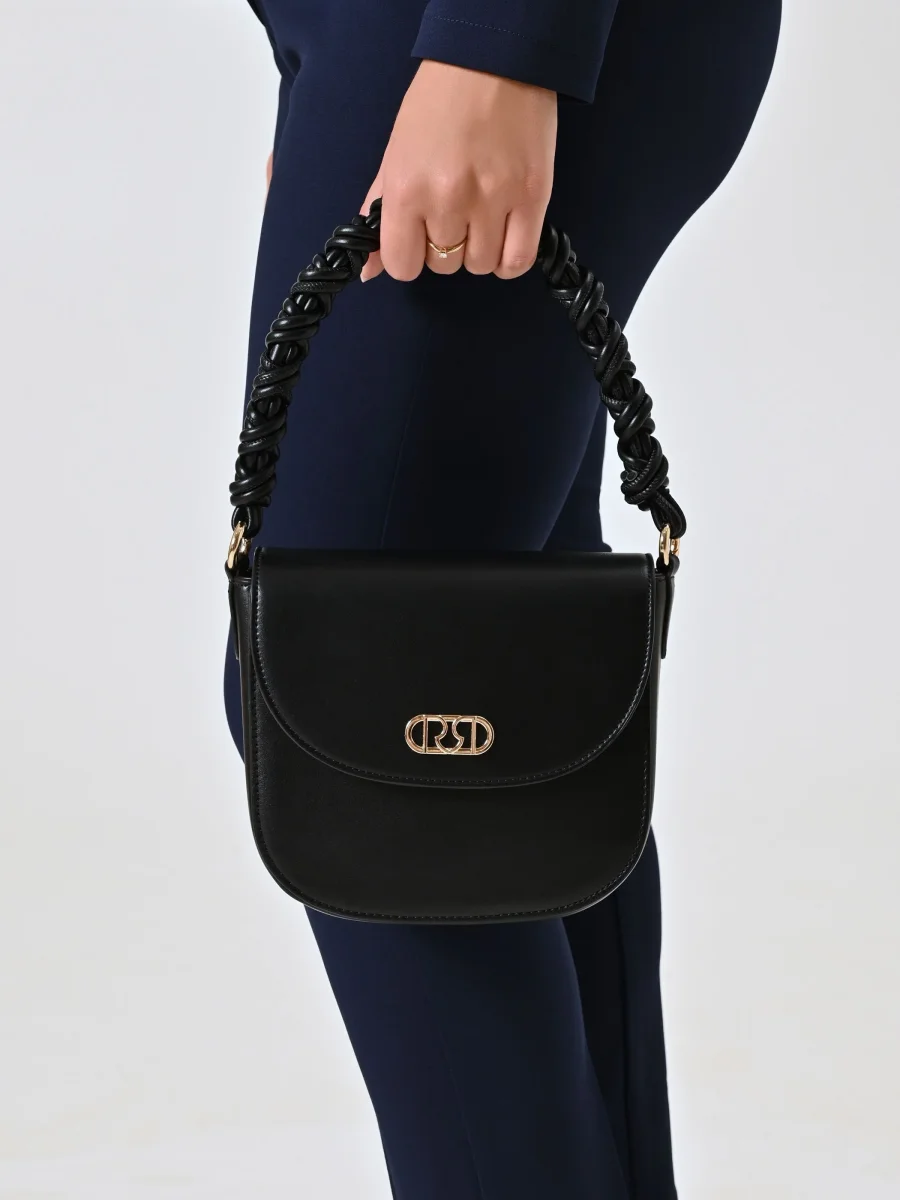 Borsa dallo stile ricercato, realizzata in materiale effetto pelle con finitura opaca. Il design compatto è impreziosito dal manico arricciato intrecciato, che dona un tocco originale e sofisticato. La pattina frontale con logo metallico decorativo si chiude con un pratico bottone automatico. Un accessorio versatile e chic, perfetto per completare look da giorno o da sera con un dettaglio distintivo. Ulteriore tracolla disponibile. Misure 19x17x7,5 cm.