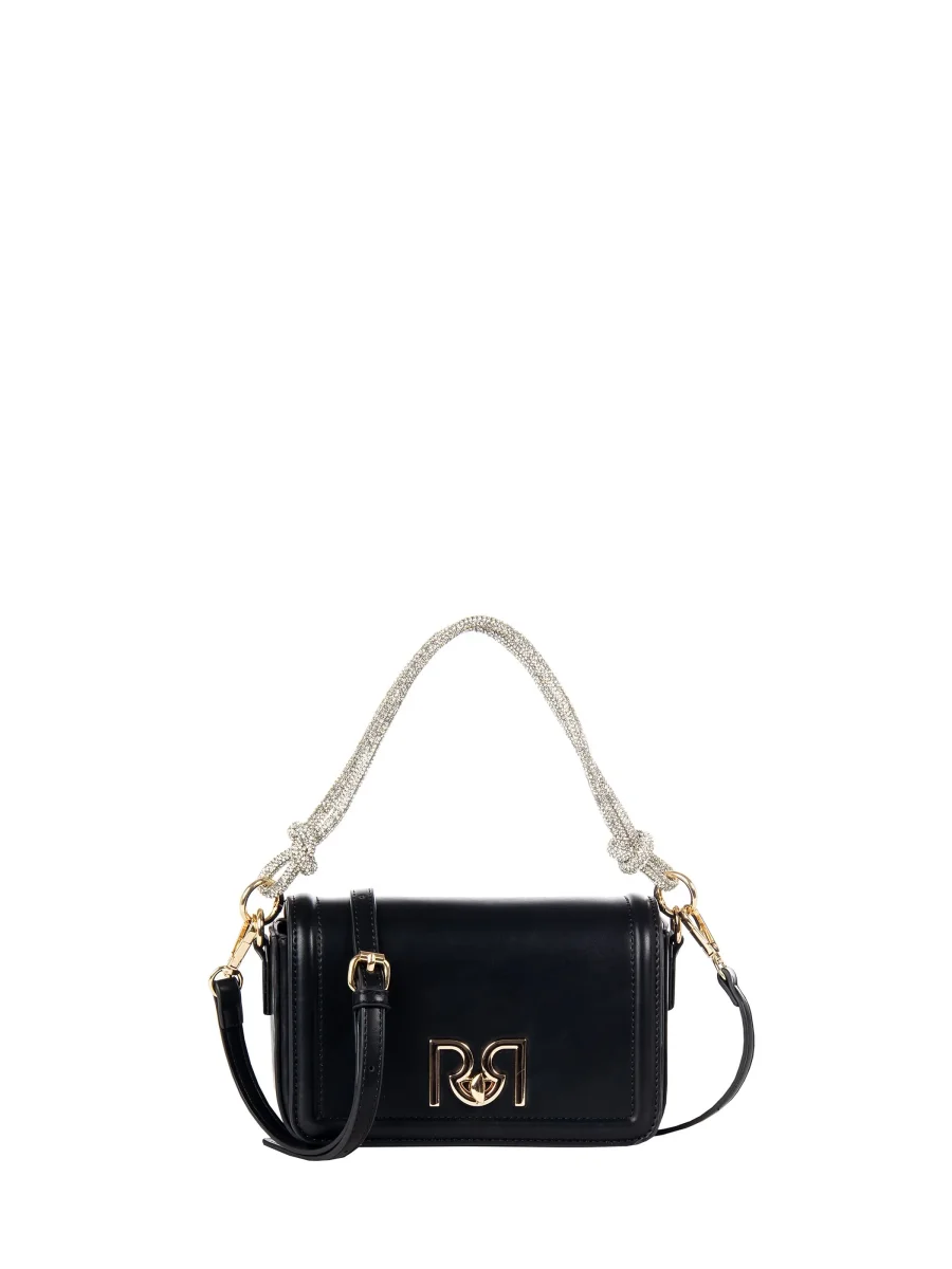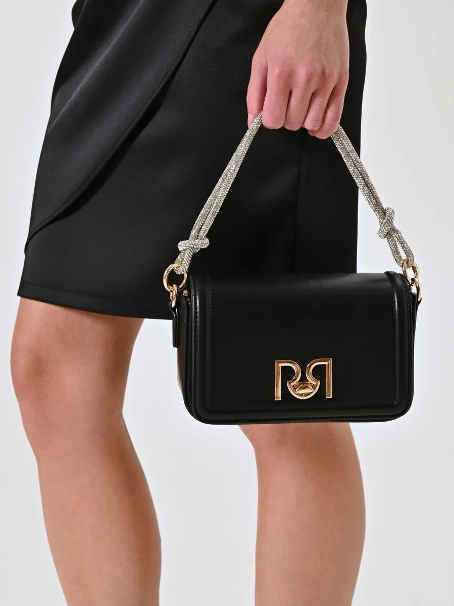 Borsa compatta con pattina rigida e chiusura magnetica, arricchita dal logo RR in metallo dorato sul davanti. Il manico corto in tubolare metallico con strass allover e nodo dona un tocco brillante e sofisticato. Perfetta per aggiungere un dettaglio luminoso ai look da sera o da occasione. Tracolla removibile. Interno foderato con tasche. Chiusura mezzaluna. Accessori dorati. Misure: 20x11x6 cm.