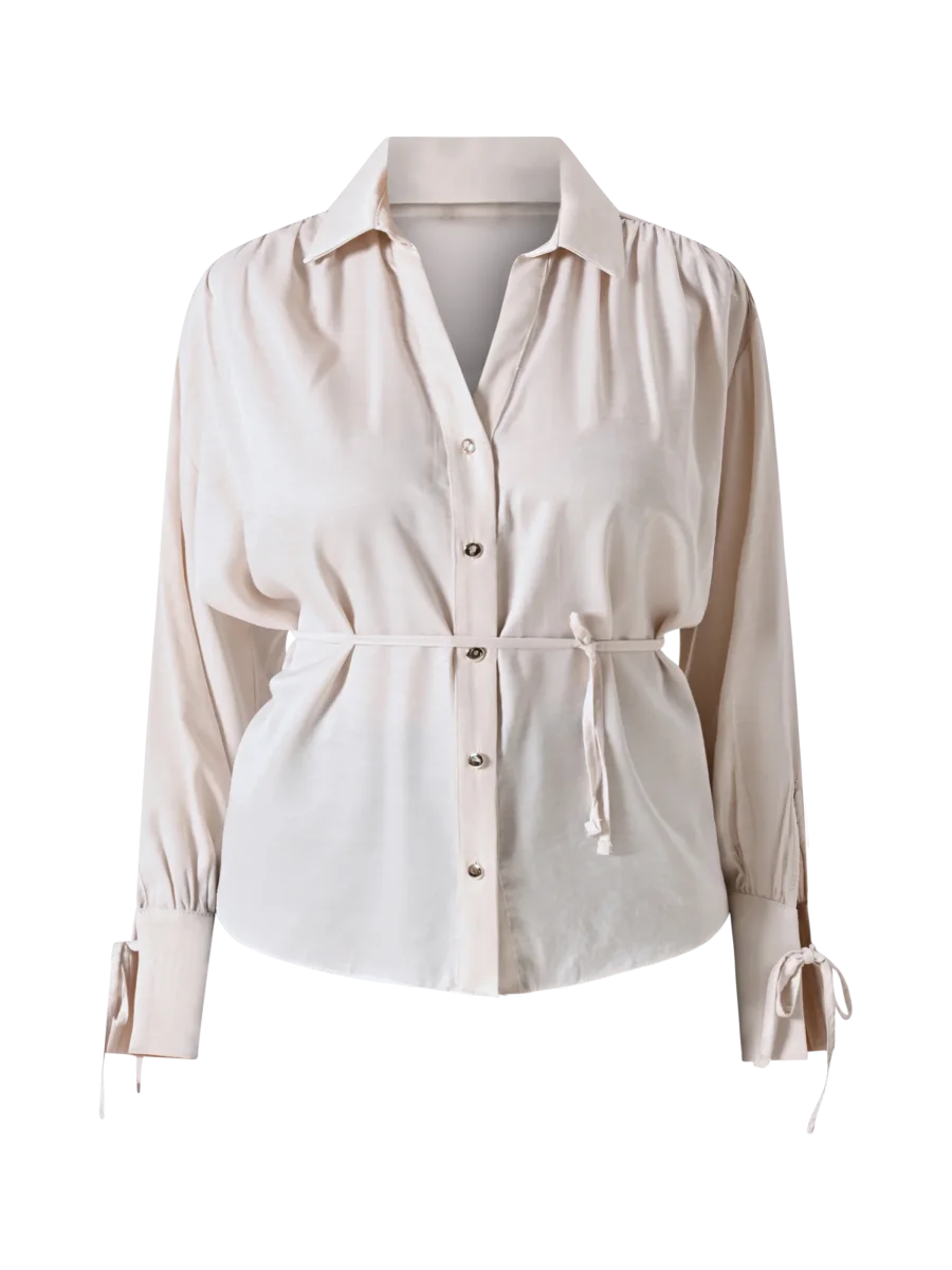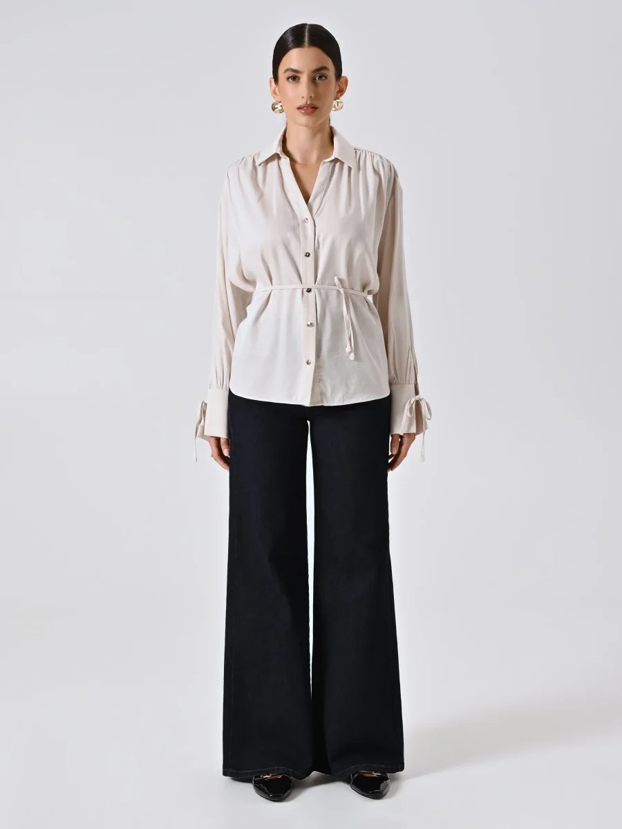 La Camicia Beige con Nastrini è un capo raffinato, pensato per valorizzare con discrezione ogni look da giorno.