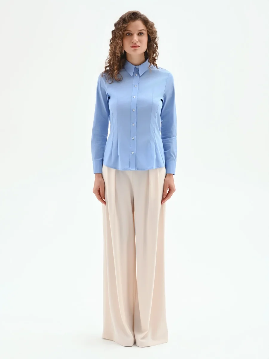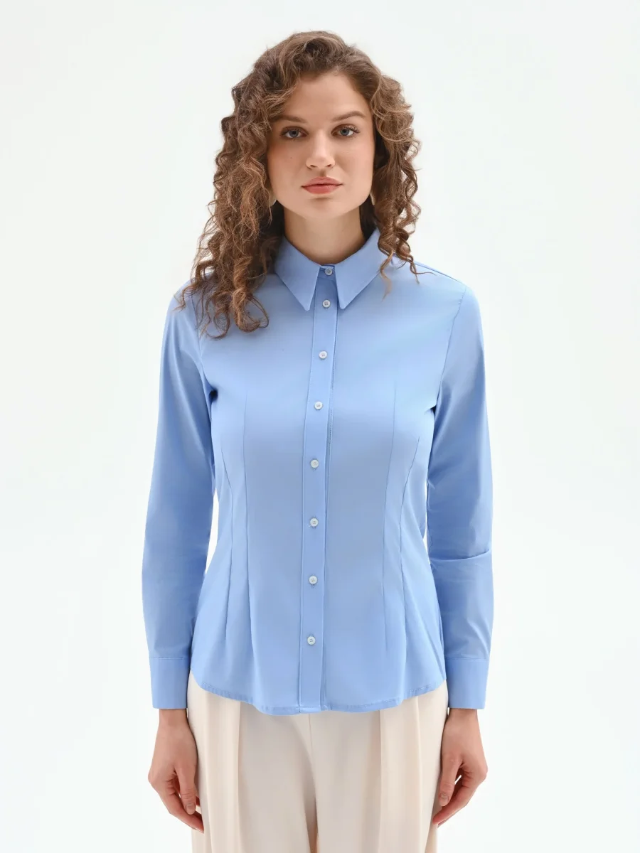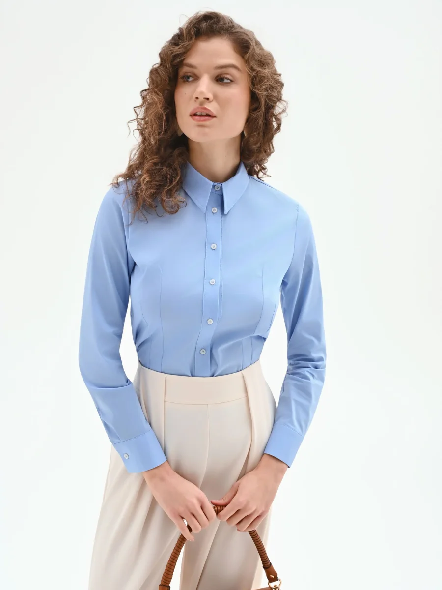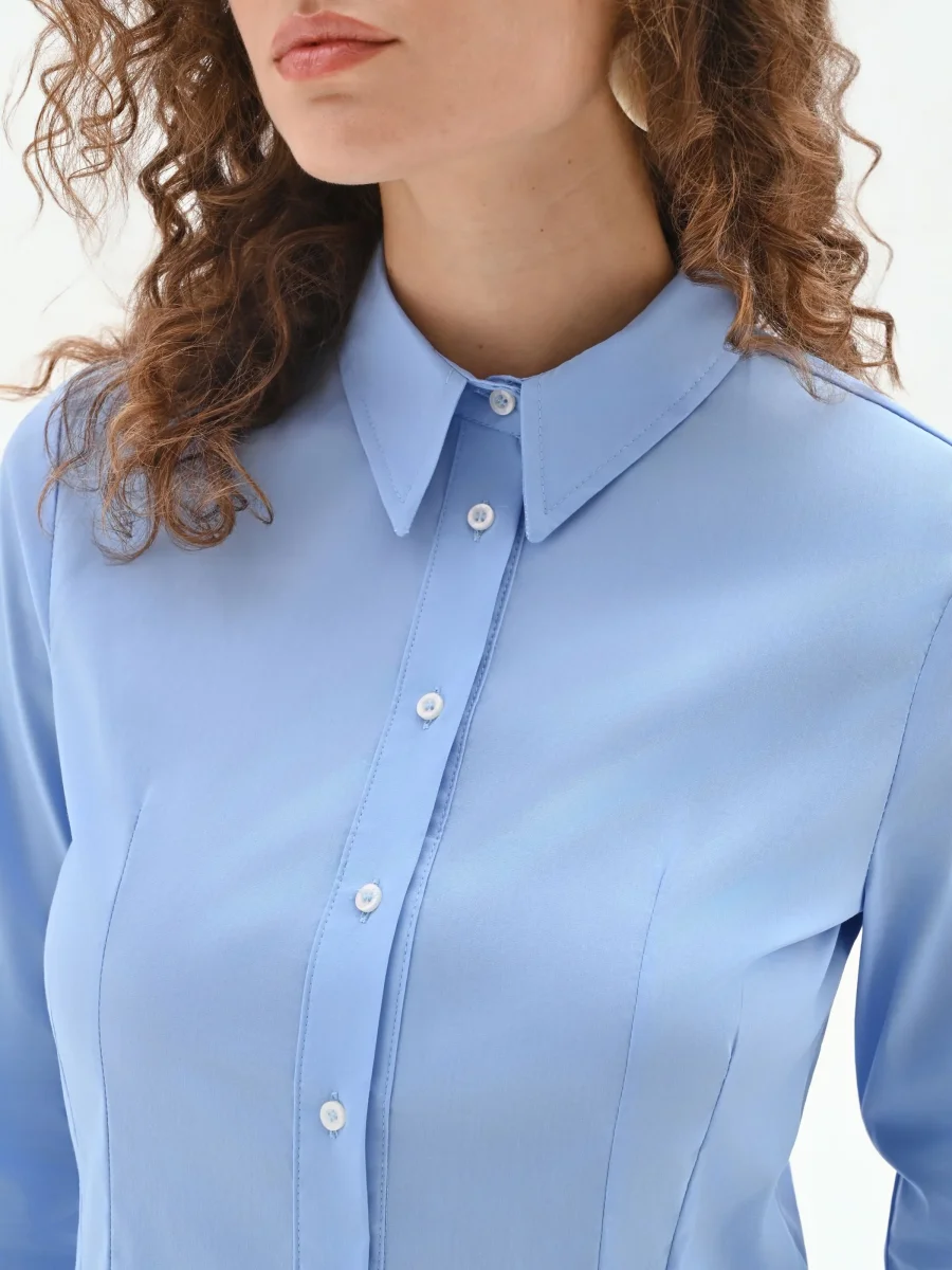 Realizzata in cotone, la sua vestibilità è studiata per valorizzare la silhouette: il taglio sciancrato è infatti accentuato dalle cuciture verticali frontali che disegnano e sottolineano il punto vita. Il colletto classico a punta, le maniche lunghe con polsino e la chiusura con bottoni a vista ne confermano l’ispirazione intramontabile, ma con una cura del dettaglio che fa la differenza.