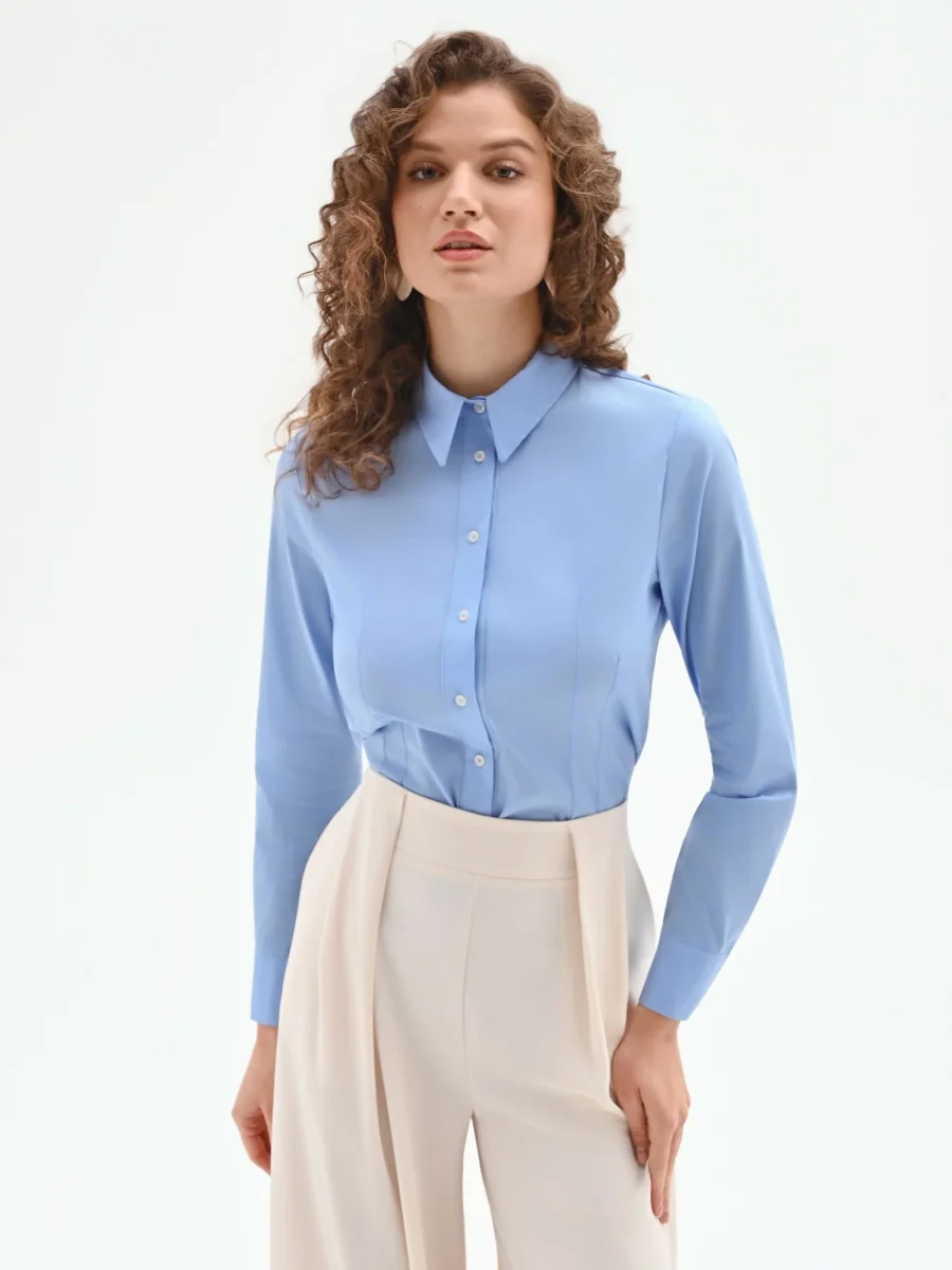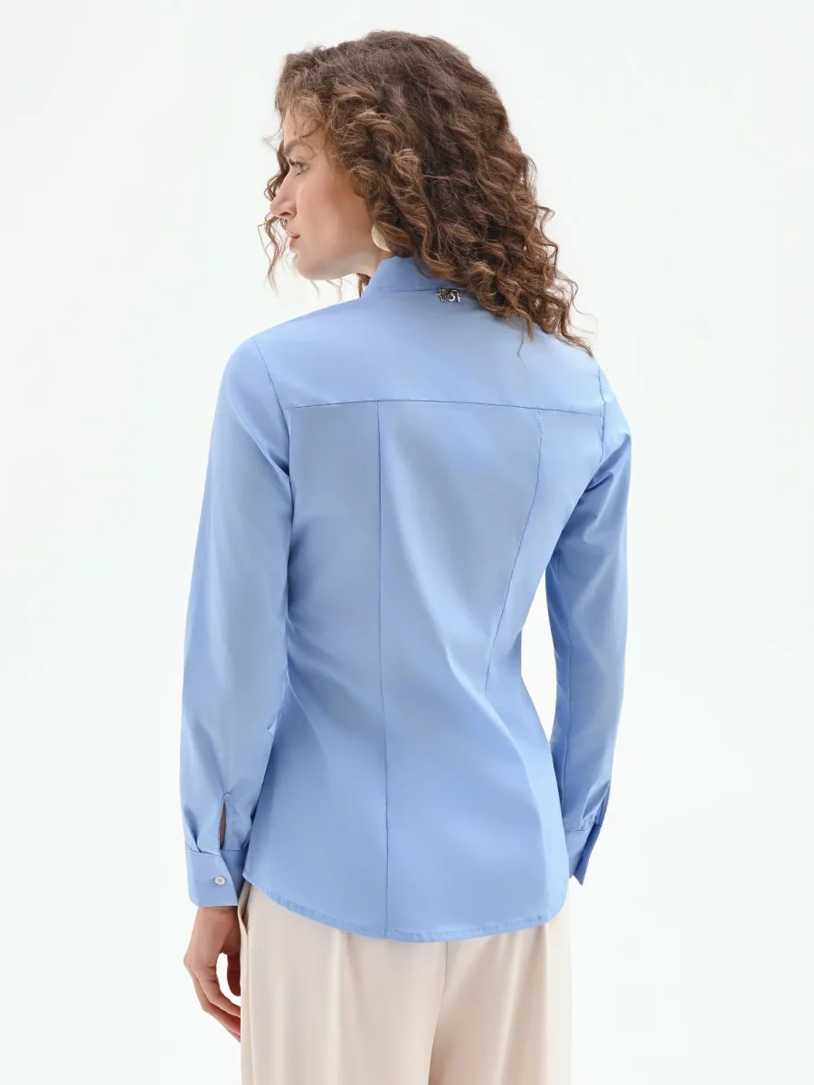 Una nota di azzurro cielo definisce la personalità di questa camicia dal design essenziale, un classico del guardaroba femminile reinterpretato secondo i codici stilistici Rinascimento. La sua linea pulita la rende un capo chiave, capace di risolvere con eleganza le esigenze di stile di tutti i giorni, dal lavoro al tempo libero.