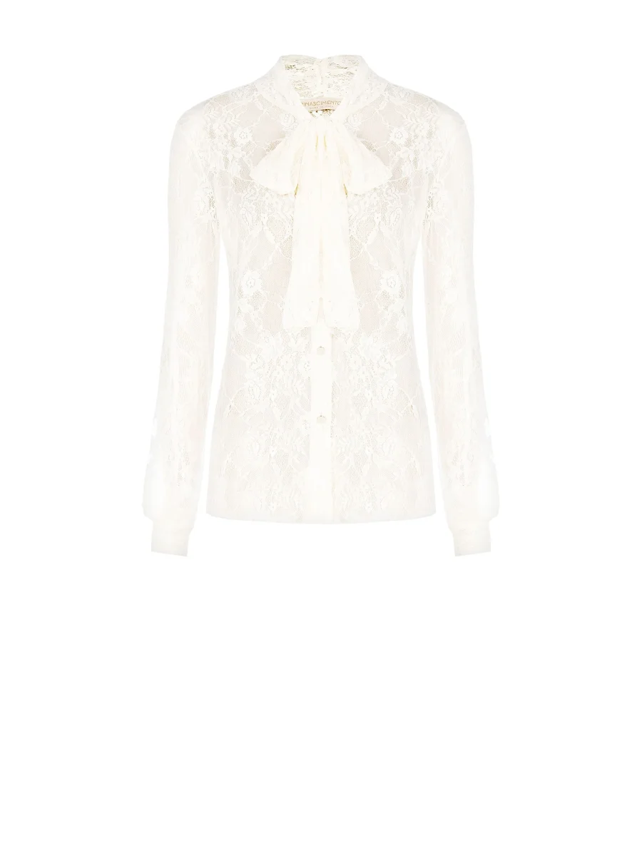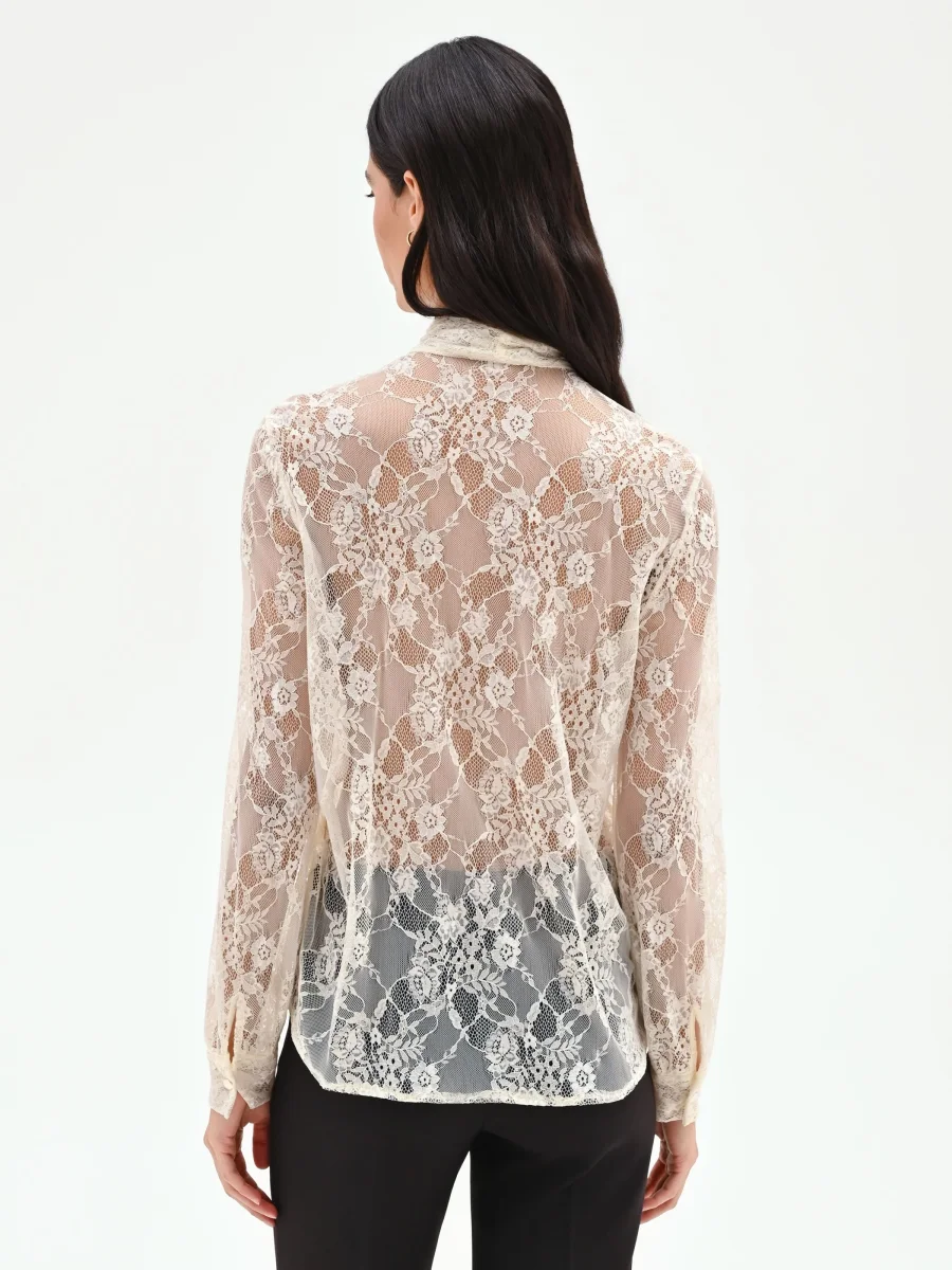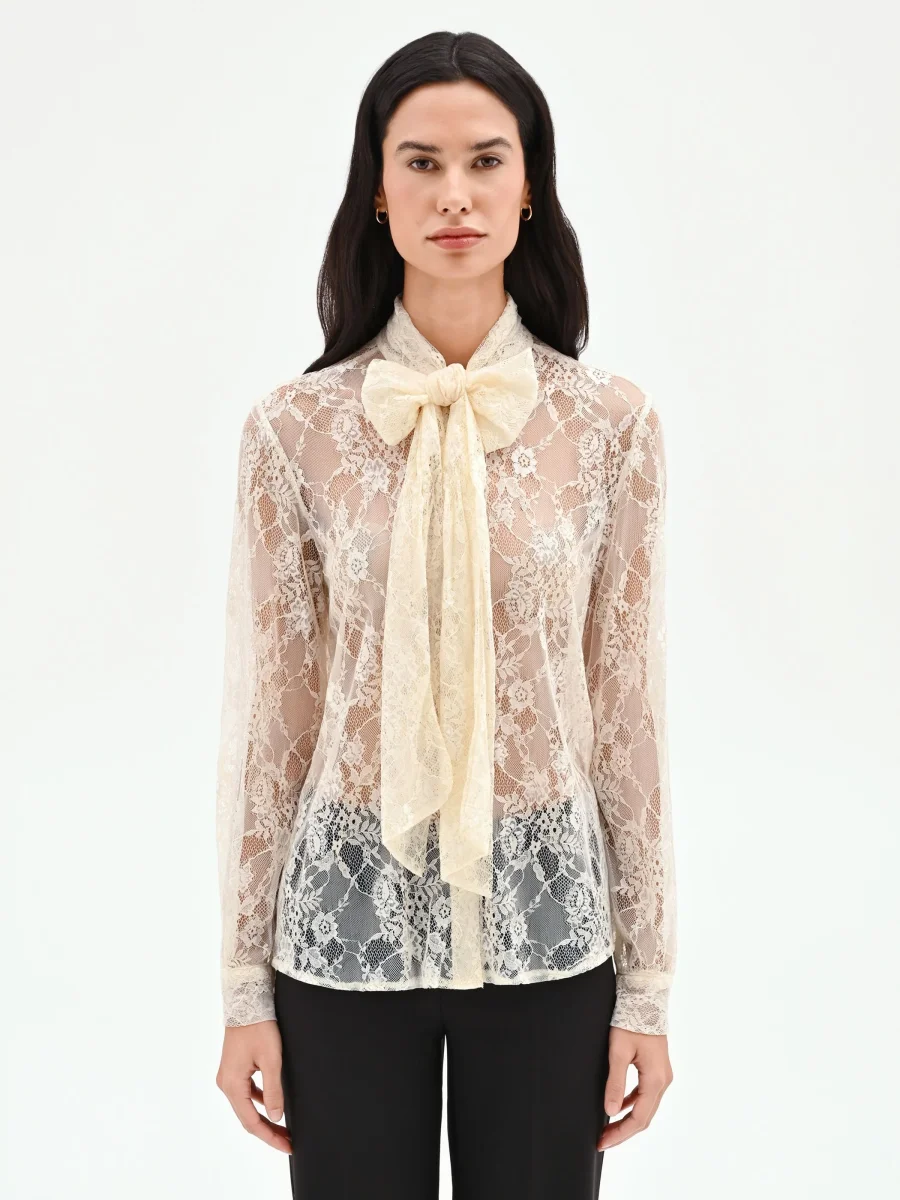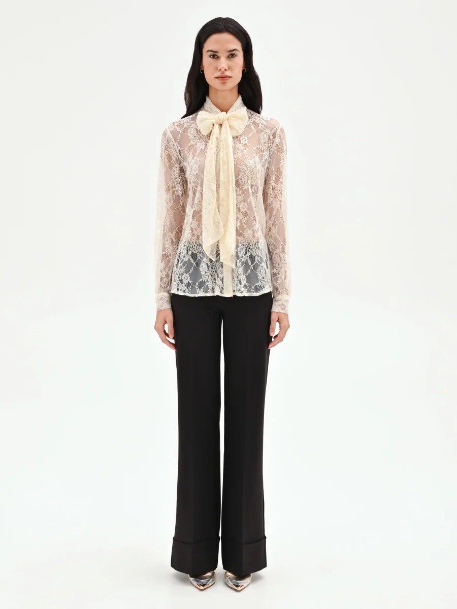 Il suo design è definito dal collo alto che si chiude sul davanti grazie a morbidi nastri, da annodare in un voluminoso fiocco lavallière che diventa il punto focale del look. La linea dritta del capo scivola con leggerezza sulla silhouette, creando un raffinato gioco di semi-trasparenze che suggerisce una sensualità discreta e mai ostentata. Le maniche lunghe sono rifinite con un orlo pulito, mantenendo l’equilibrio e l’armonia del modello.