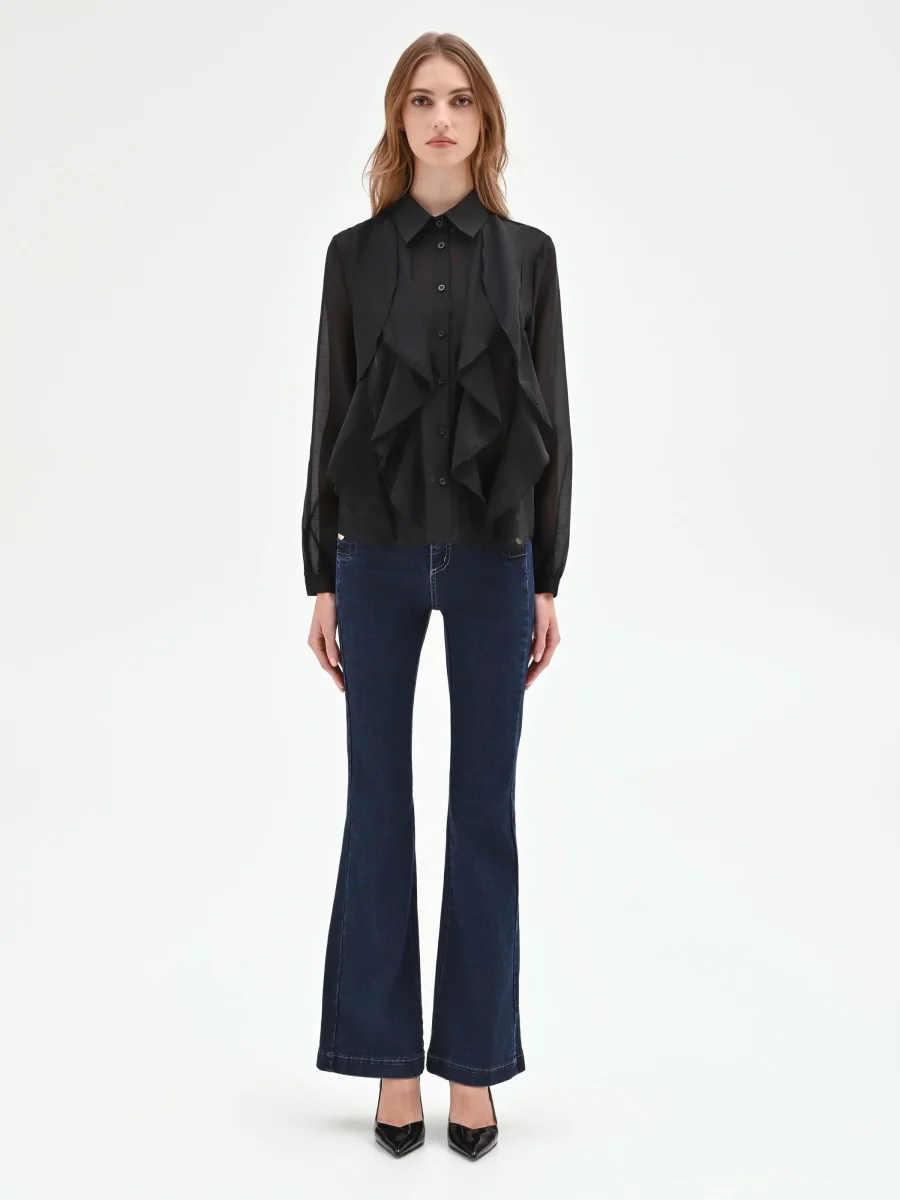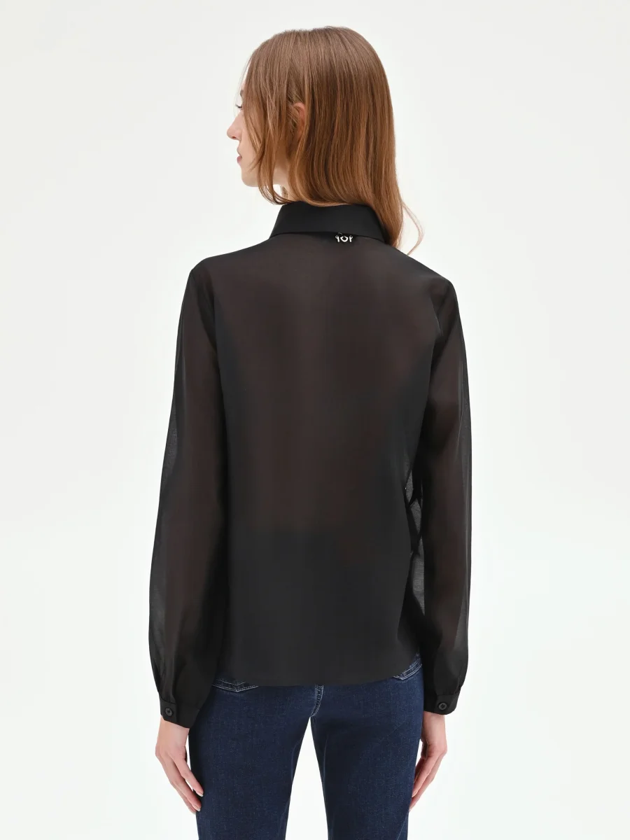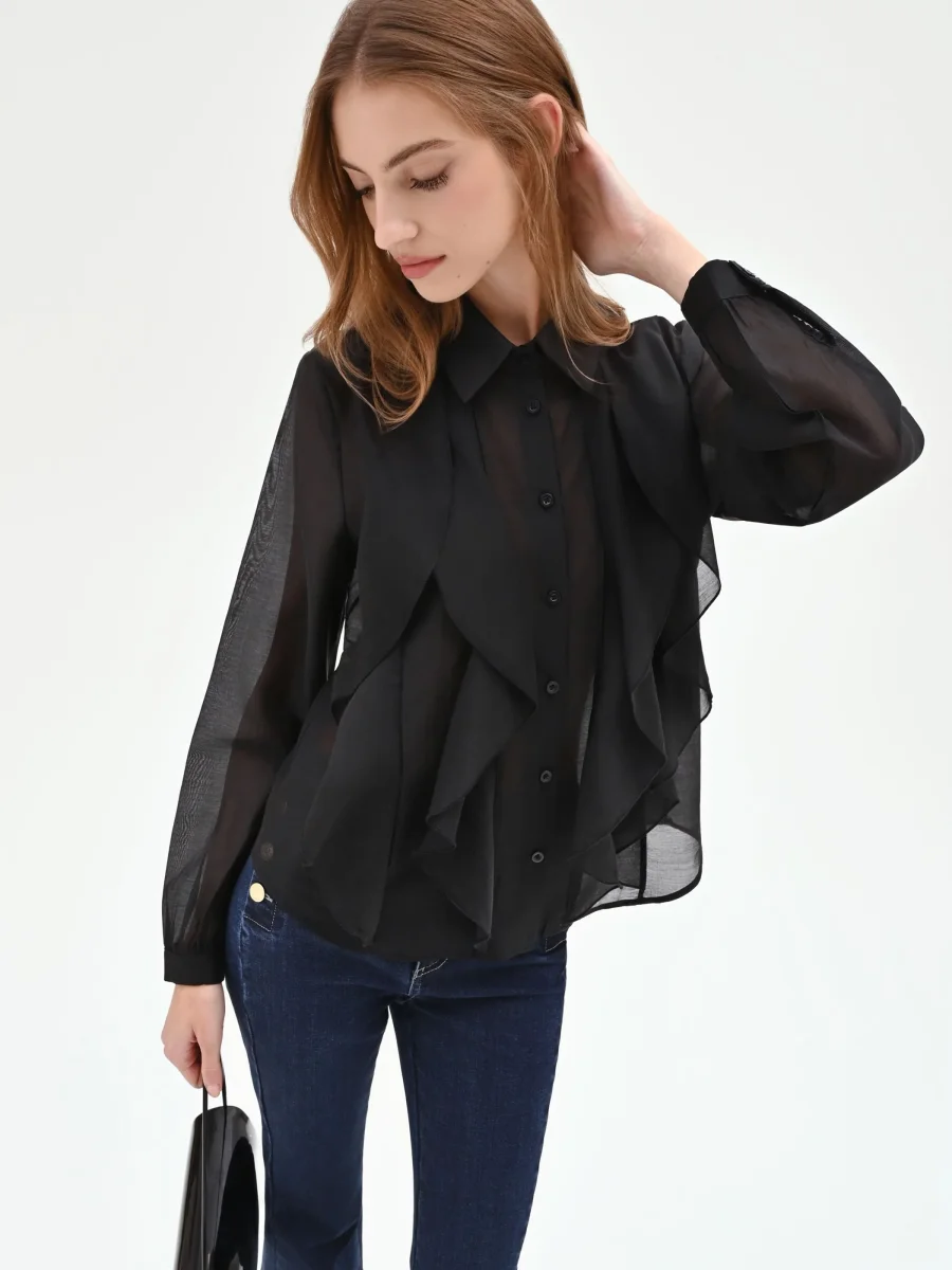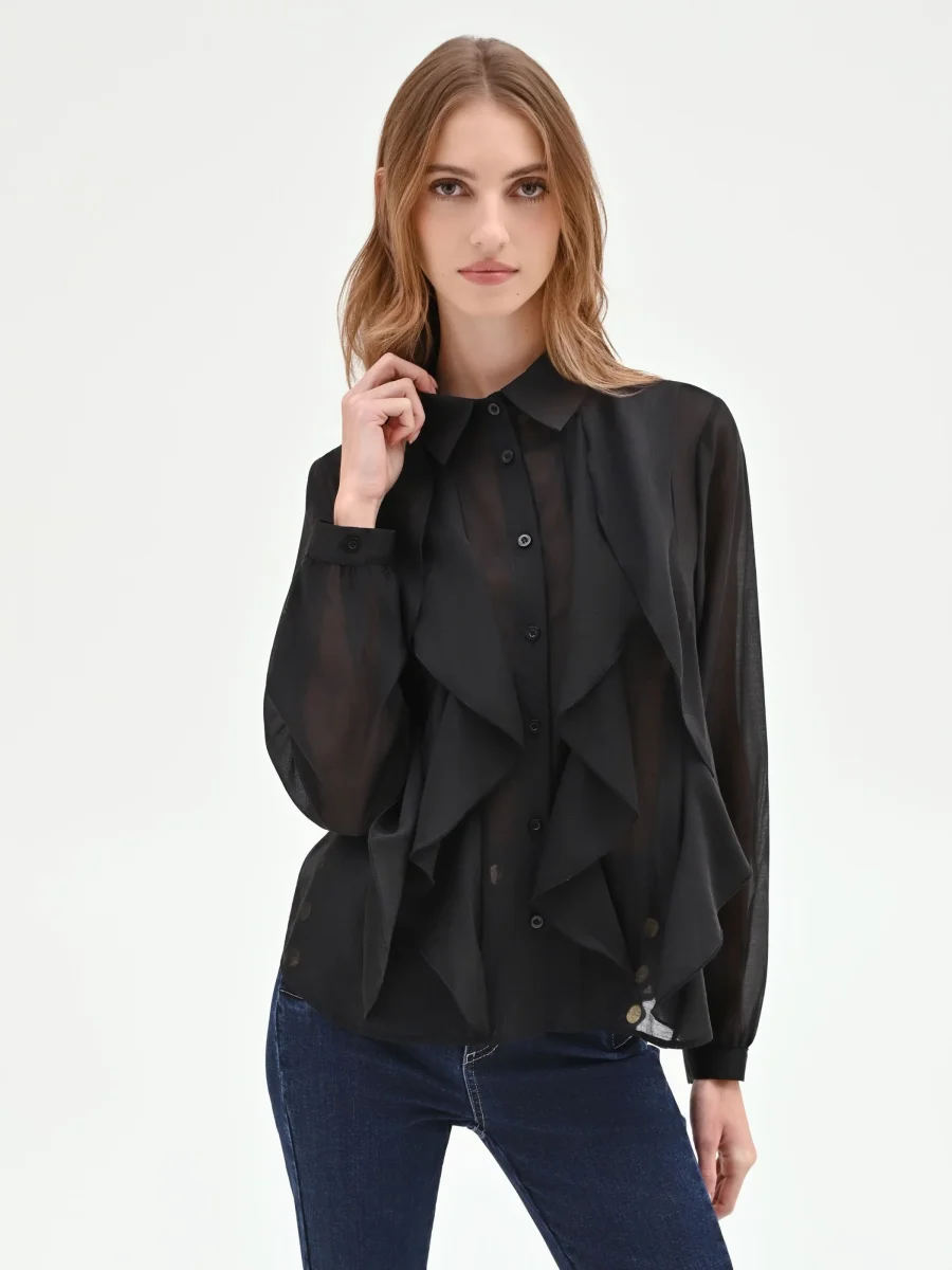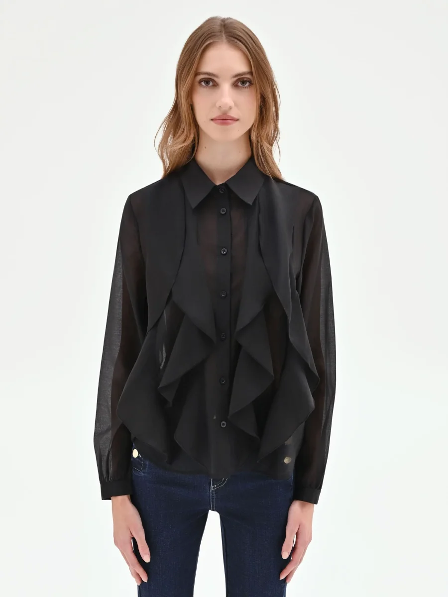 La femminilità si esprime attraverso un gioco di volumi e delicate trasparenze nella camicia nera con rouches verticali, un capo essenziale del guardaroba che unisce eleganza e versatilità.