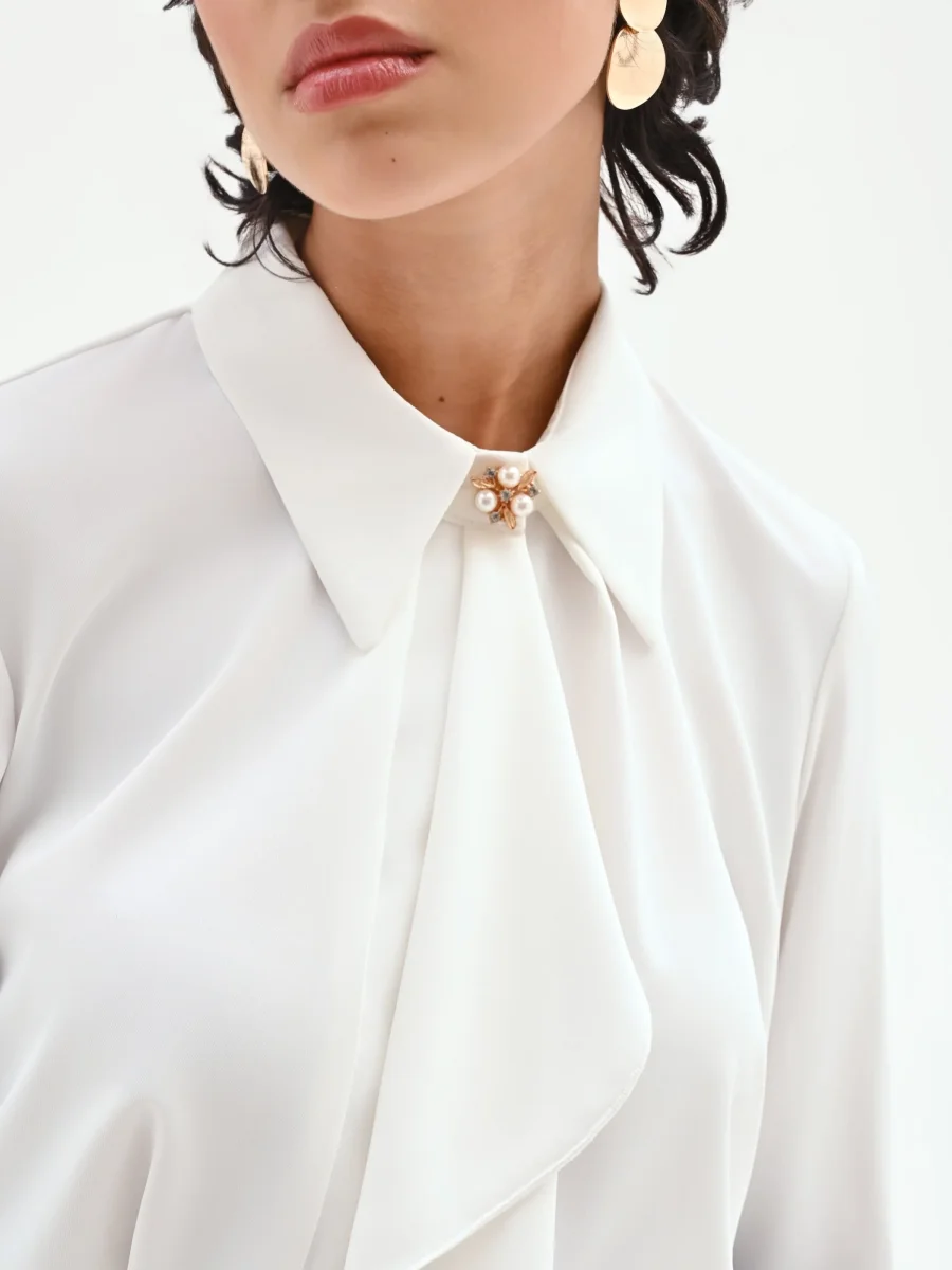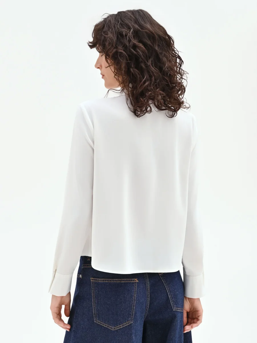 Il fascino discreto di un capo essenziale incontra un dettaglio romantico e inaspettato in questa camicia color panna bianco, un vero e proprio pass-partout per il guardaroba femminile.