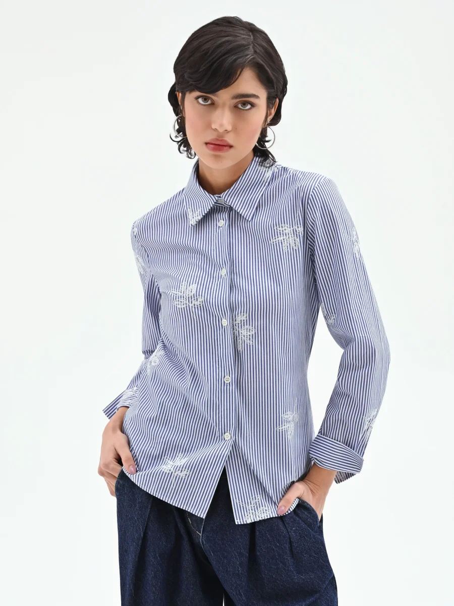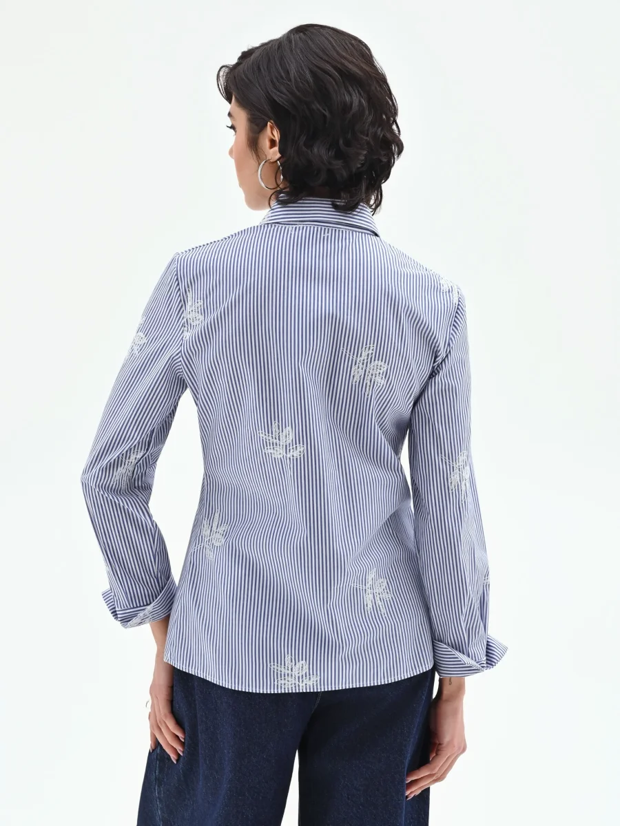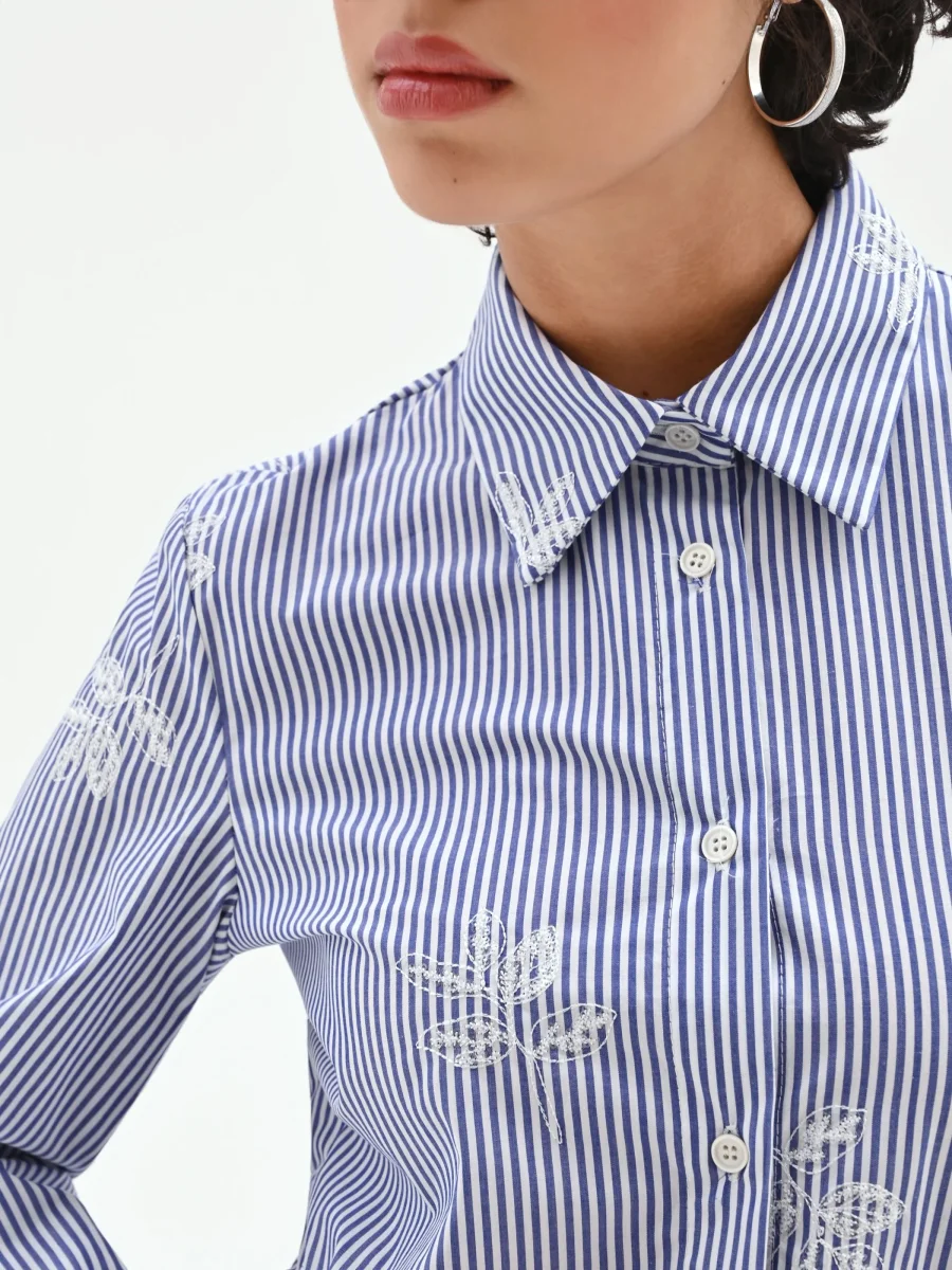 Un classico del guardaroba maschile reinterpretato con grazia e leggerezza. La camicia popeline a righe blu con ricami è la scelta ideale per chi cerca un capo versatile capace di unire rigore geometrico e dettagli romantici.