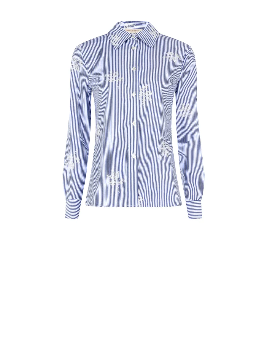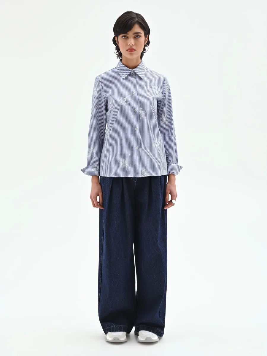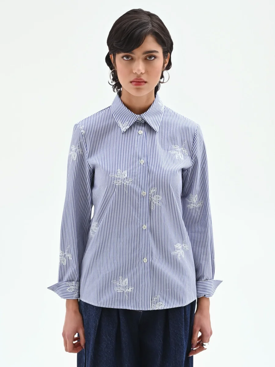 Un classico del guardaroba maschile reinterpretato con grazia e leggerezza. La camicia popeline a righe blu con ricami è la scelta ideale per chi cerca un capo versatile capace di unire rigore geometrico e dettagli romantici.