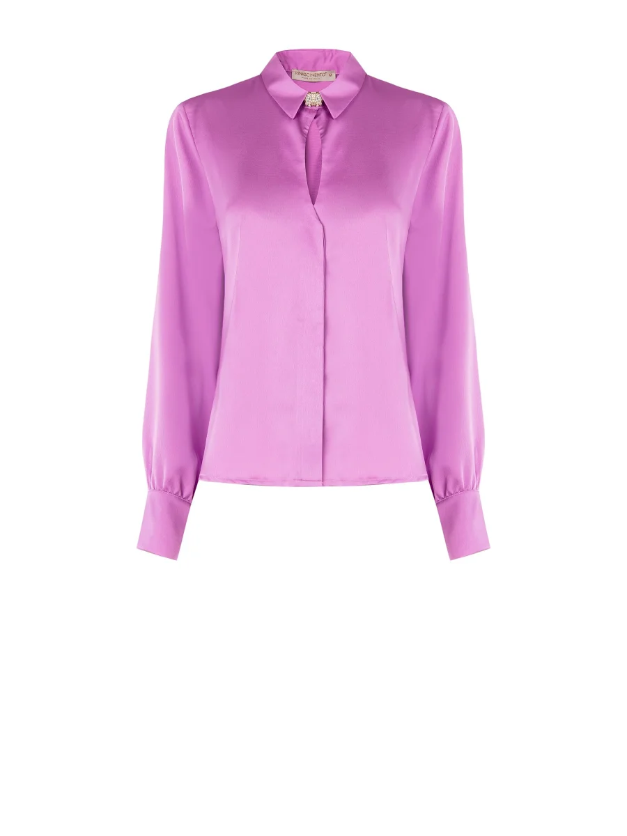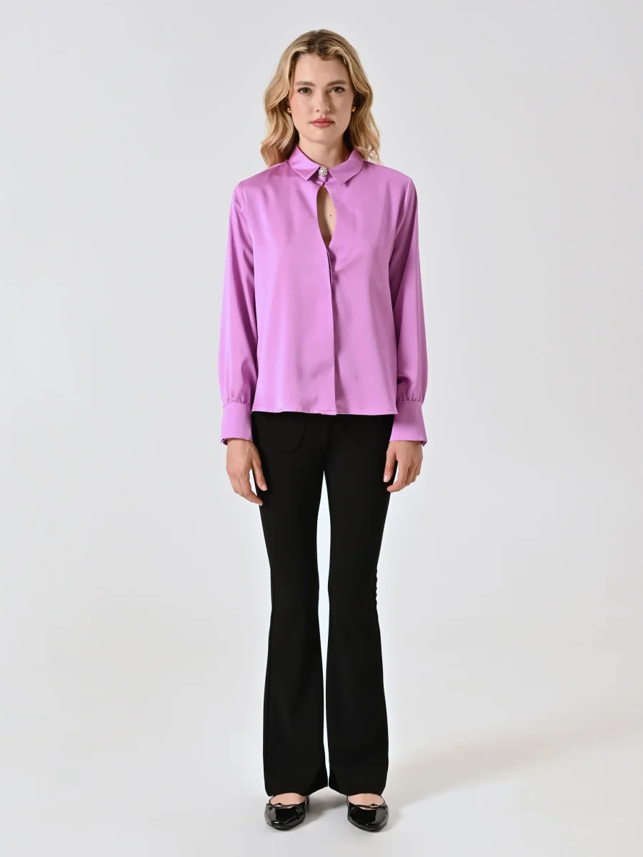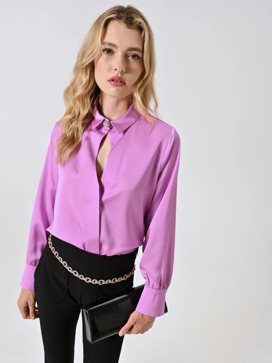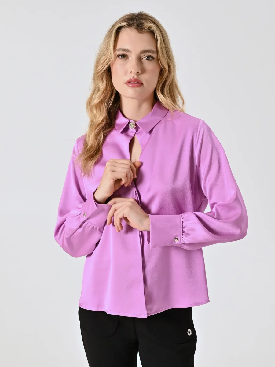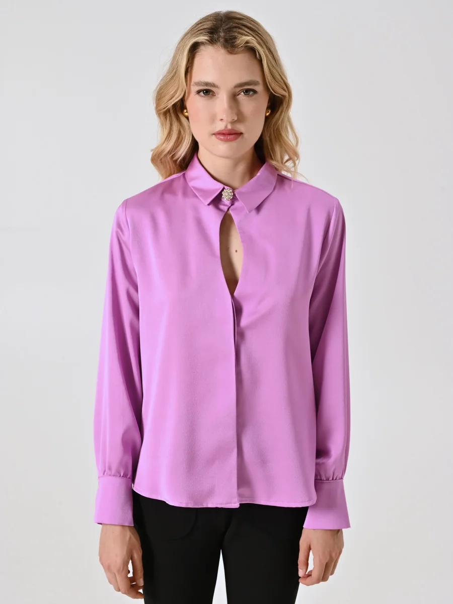 Realizzata in enver satin, la Camicia Rosa Orchidea presenta colletto e polsini dal taglio classico, un delicato dettaglio cut out e un decoro gioiello removibile che impreziosisce lo scollo. La chiusura con abbottonatura nascosta valorizza il design essenziale e curato.