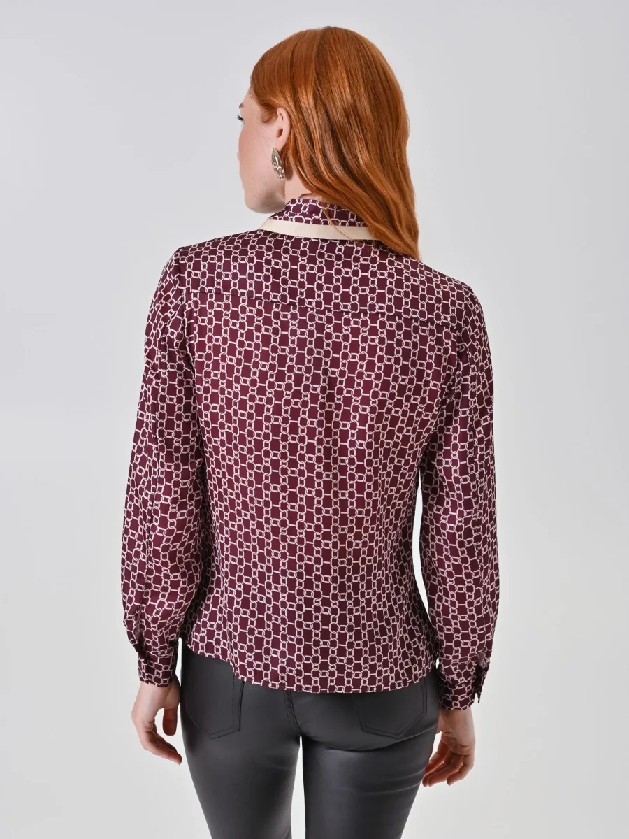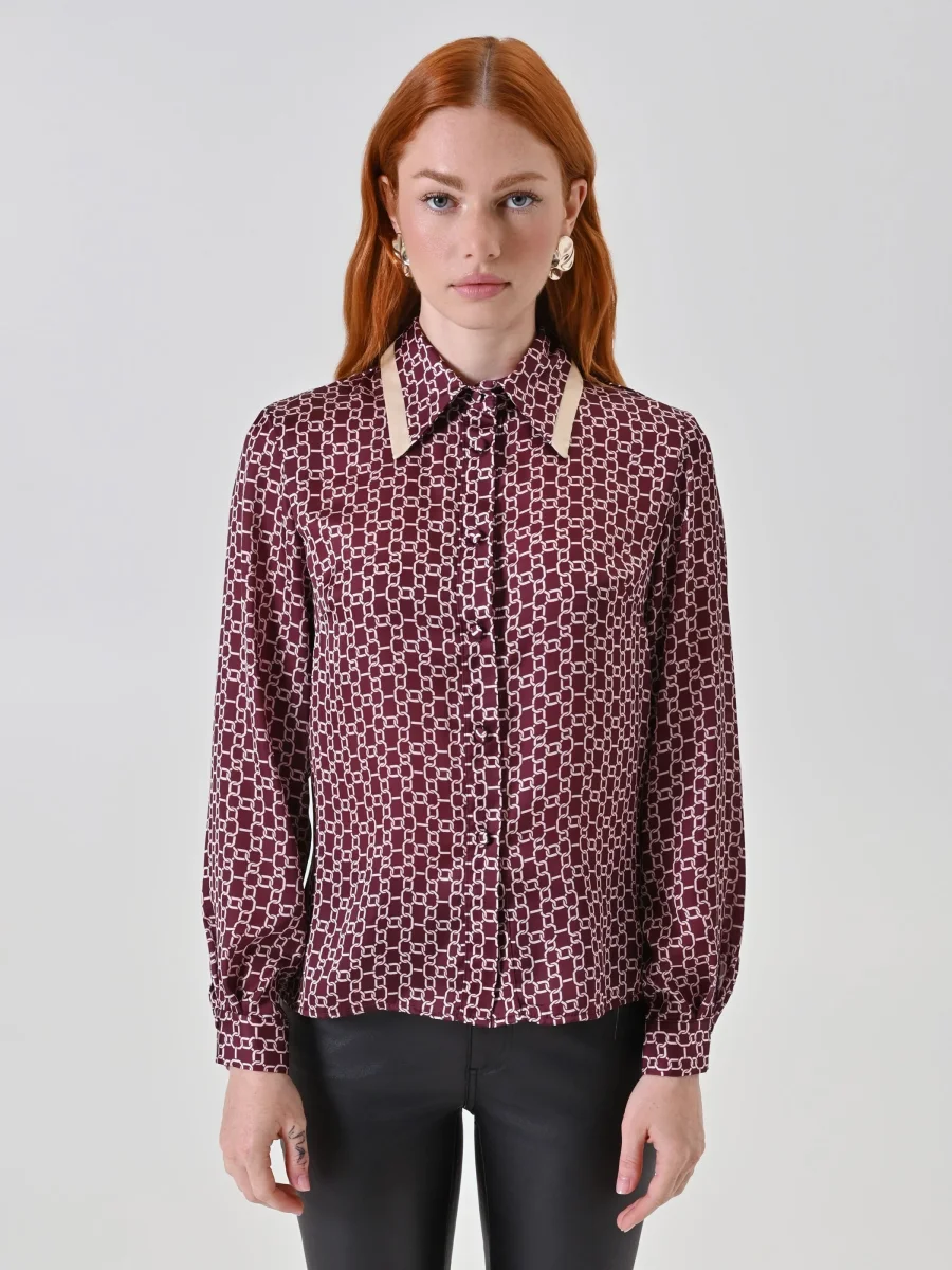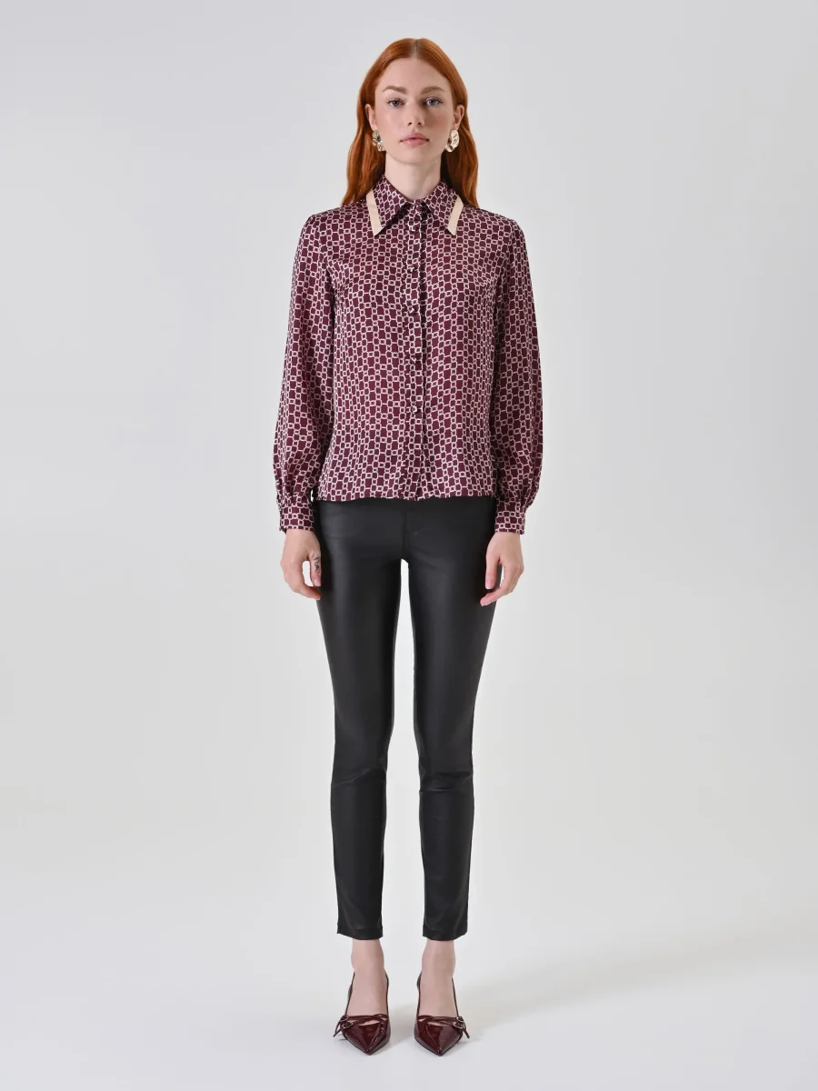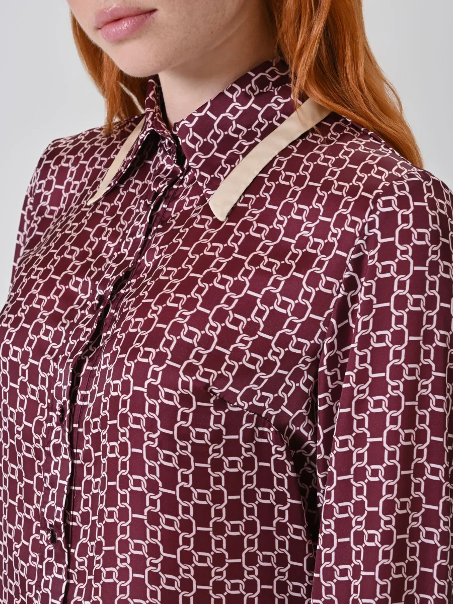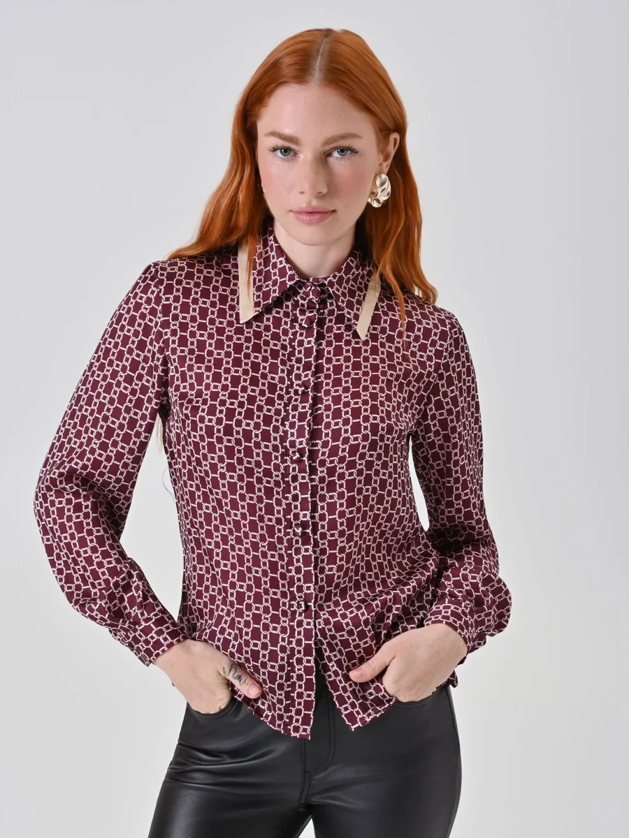 Il fascino intramontabile della stampa a catena incontra la fluidità del raso in questa camicia color rosso bordeaux, un capo che cattura l’essenza glamour e decisa. Pensata per una donna che ama distinguersi, esprime una forte personalità attraverso il motivo geometrico all-over, un intreccio di maglie stilizzate color crema che risaltano sulla base intensa del tessuto.