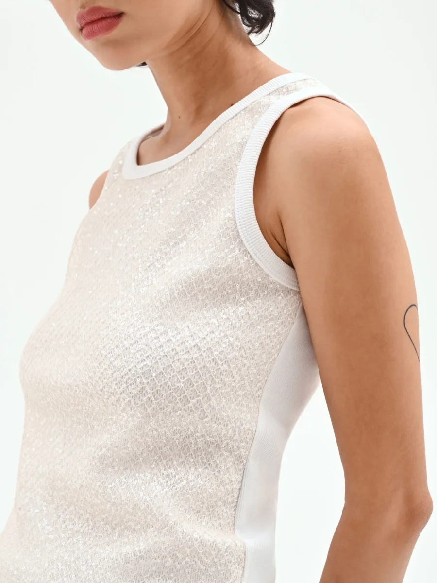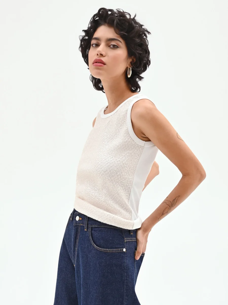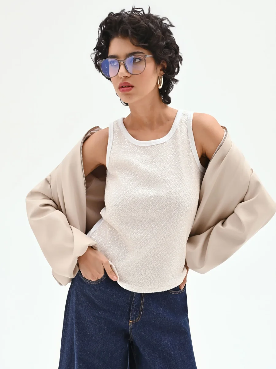 Una texture luminosa e un design essenziale si incontrano nella canotta panna bianco, un capo che interpreta la femminilità contemporanea con un tocco glam. La sua superficie è interamente ricoperta da piccole paillettes tono su tono, che creano un delicato gioco di riflessi e donano un aspetto ricercato all’outfit, pur mantenendo una grande versatilità.