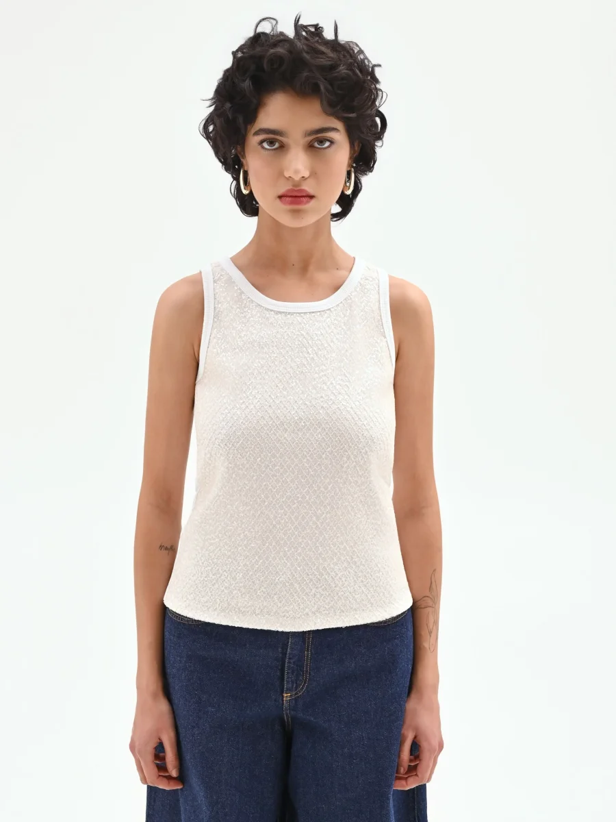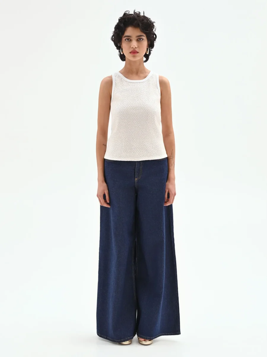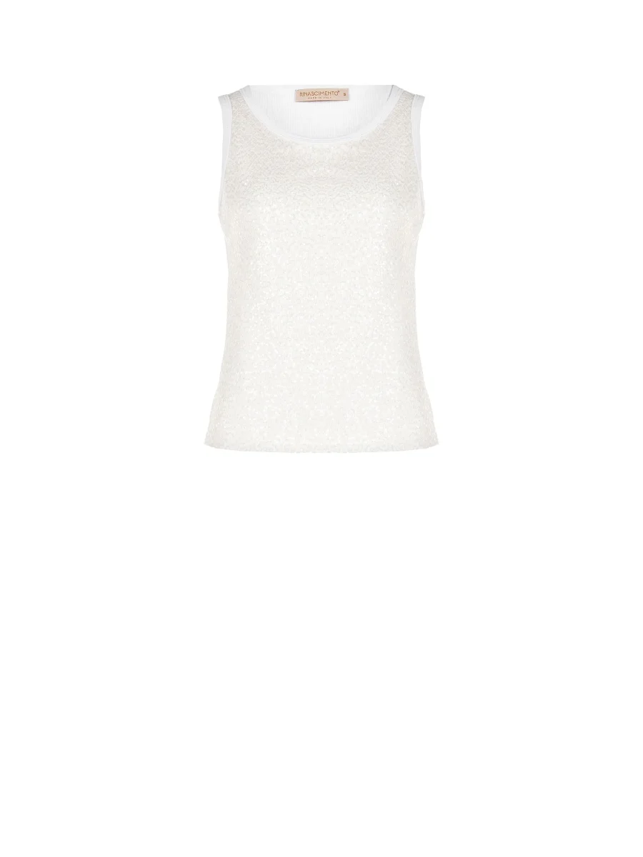 Una texture luminosa e un design essenziale si incontrano nella canotta panna bianco, un capo che interpreta la femminilità contemporanea con un tocco glam. La sua superficie è interamente ricoperta da piccole paillettes tono su tono, che creano un delicato gioco di riflessi e donano un aspetto ricercato all’outfit, pur mantenendo una grande versatilità.