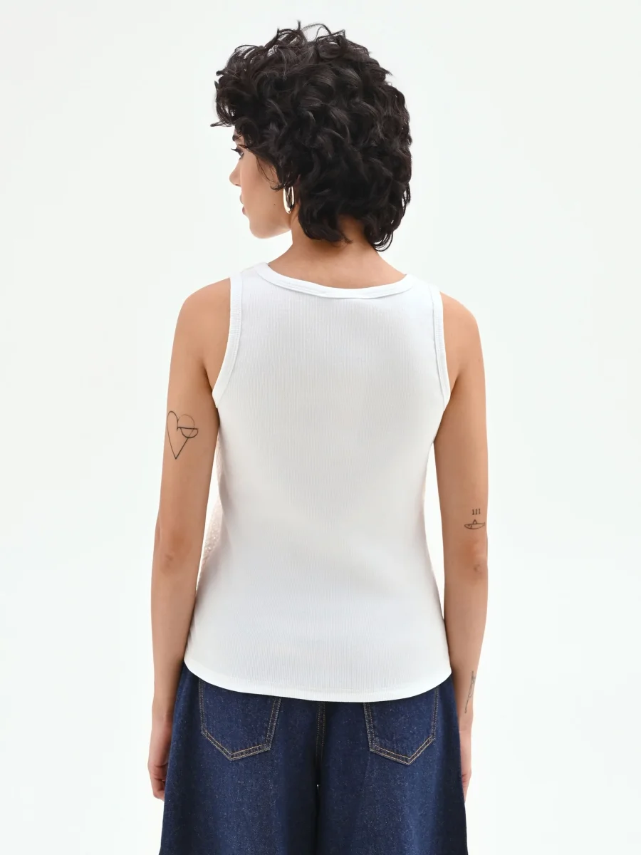 La silhouette è pulita e dritta, disegnata per offrire una vestibilità confortevole e facile da indossare. Il design presenta un girocollo e ampi giromanica, entrambi rifiniti con un fine bordo a costine che aggiunge un dettaglio curato e definisce le linee del top. Il fit morbido la rende perfetta per essere indossata in ogni momento della giornata.