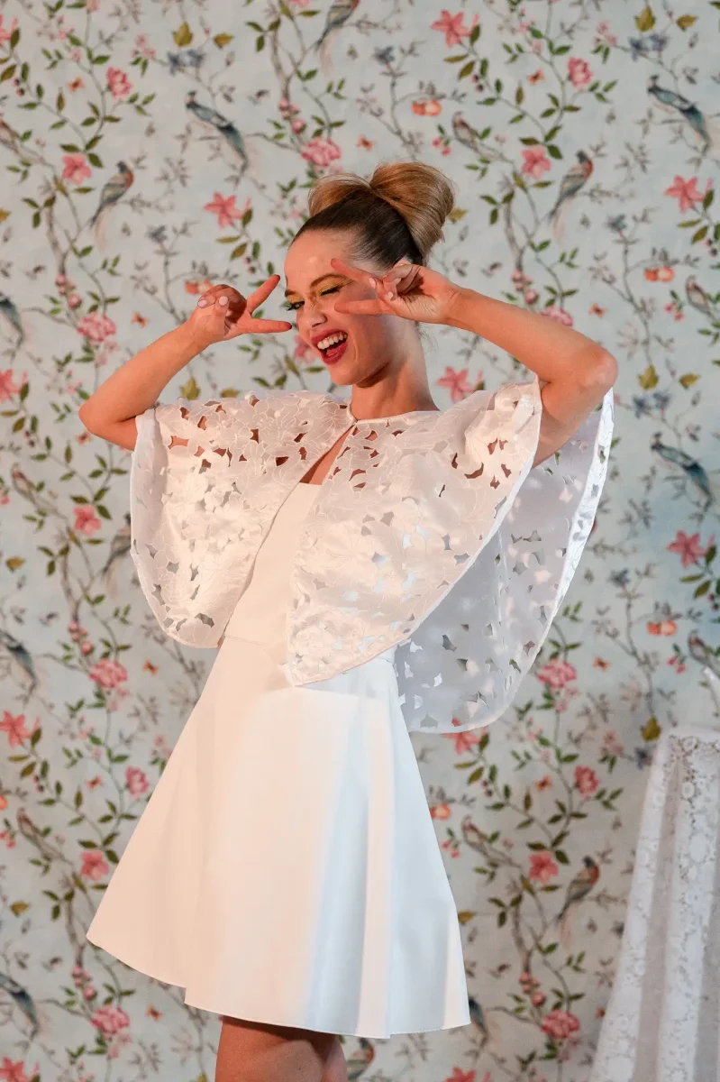 Ajoutez une touche espiègle et légère à votre grand jour avec cette cape délicate et pleine de caractère. Réalisée en polyester ajouré, cette petite cape apporte une touche couture et poétique à la silhouette. Sa coupe courte et ample crée un joli jeu de volumes, tandis que la transparence laisse subtilement apparaître la tenue en dessous.💗