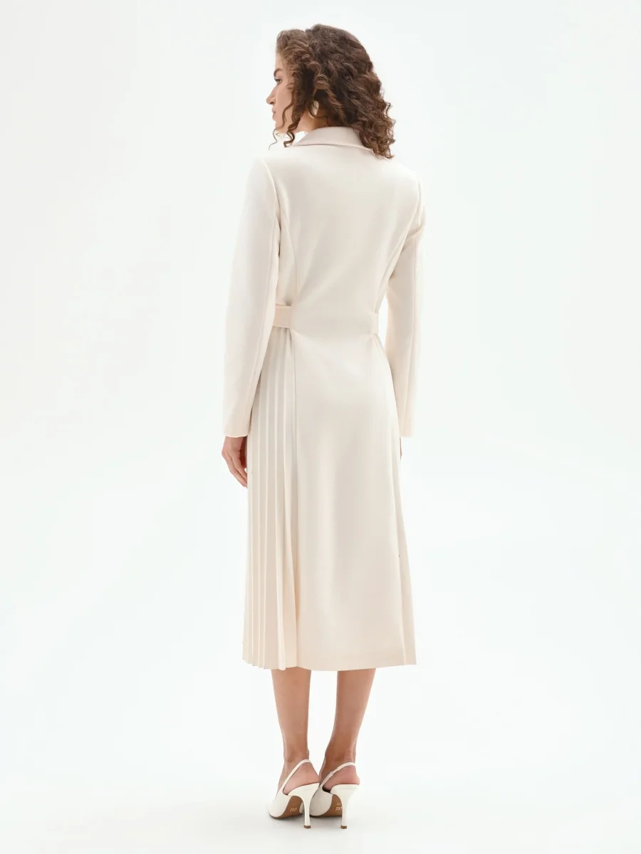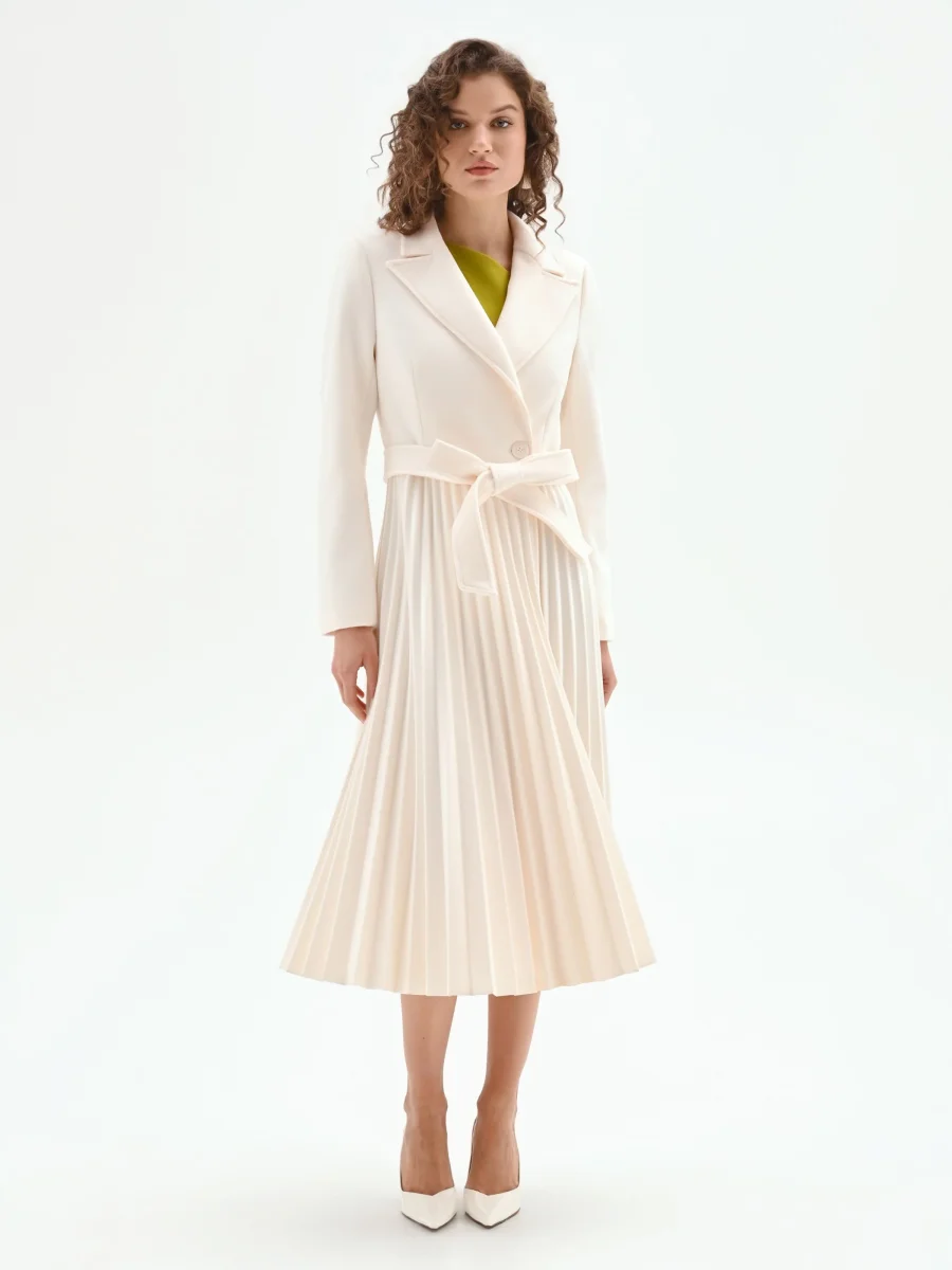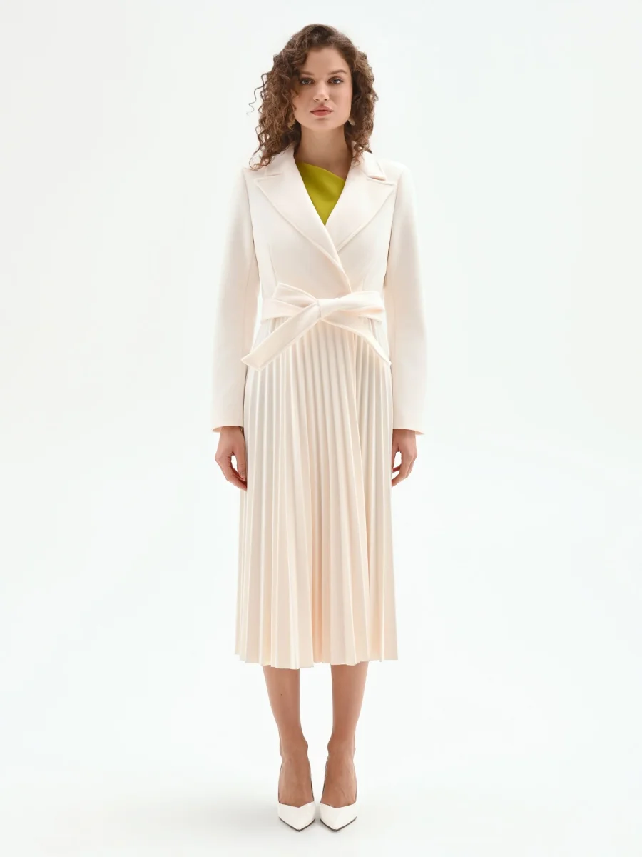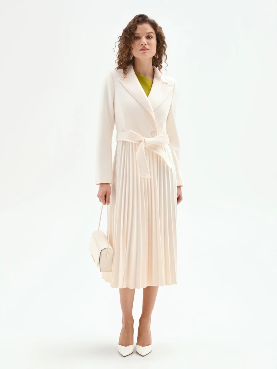 Un capospalla bianco che si indossa come un abito, grazie a una linea sofisticata che unisce la struttura del cappotto alla fluidità di una gonna. Realizzato in panno, il modello presenta una parte superiore pulita, con ampi revers a lancia che incorniciano il décolleté. La chiusura a portafoglio è sottolineata da una cintura coordinata da annodare in vita, che permette di personalizzare la vestibilità e accentuare la silhouette. Dal punto vita si apre un’ampia gonna interamente lavorata a plissé, che aggiunge movimento e un tocco di femminilità a ogni passo. Grazie alla sua natura versatile, questo cappotto si presta a molteplici interpretazioni: perfetto sopra a un look con jeans e maglia per un’eleganza quotidiana, si trasforma nel protagonista di un outfit per un’occasione speciale se indossato chiuso, come un vero e proprio abito.