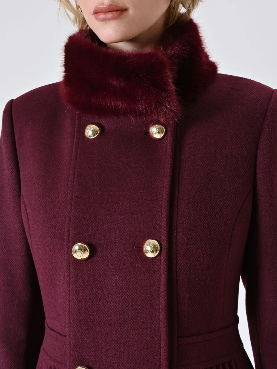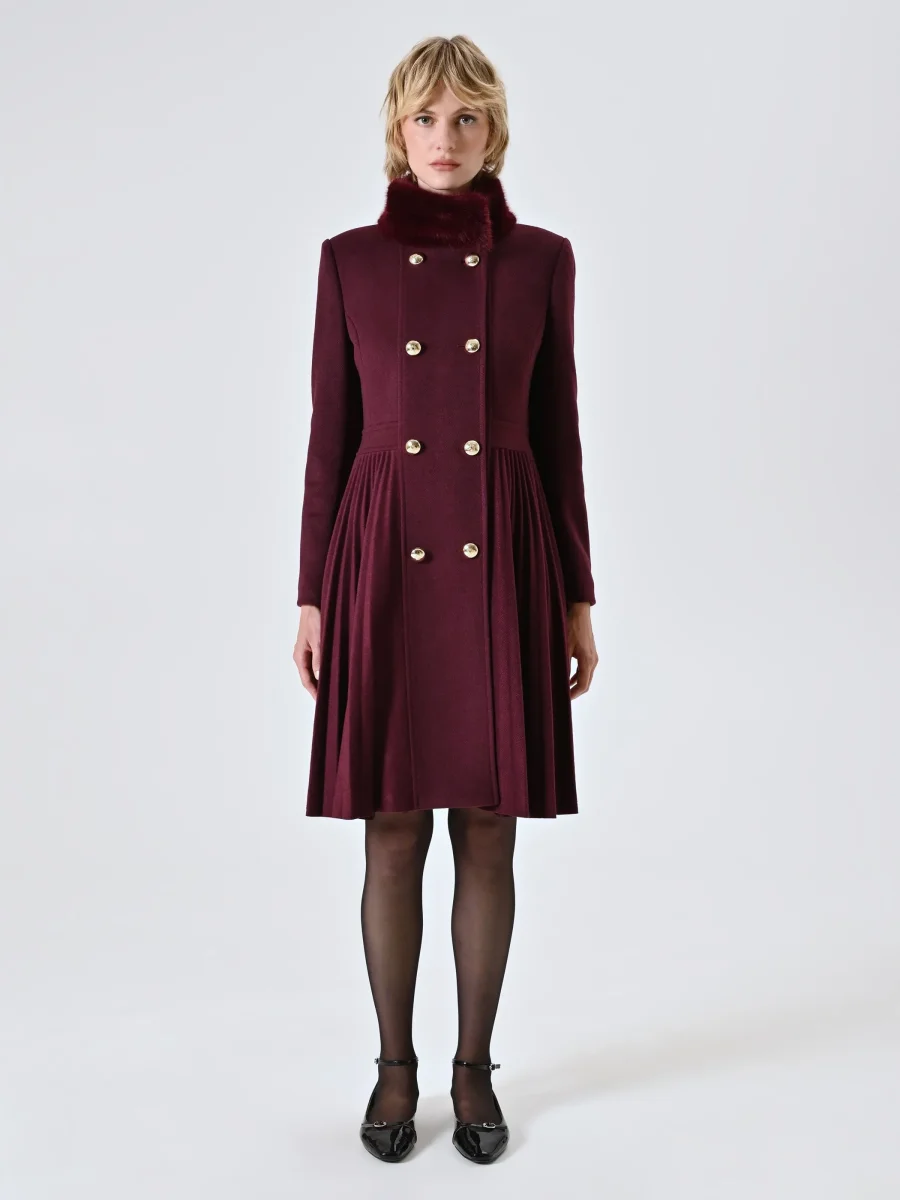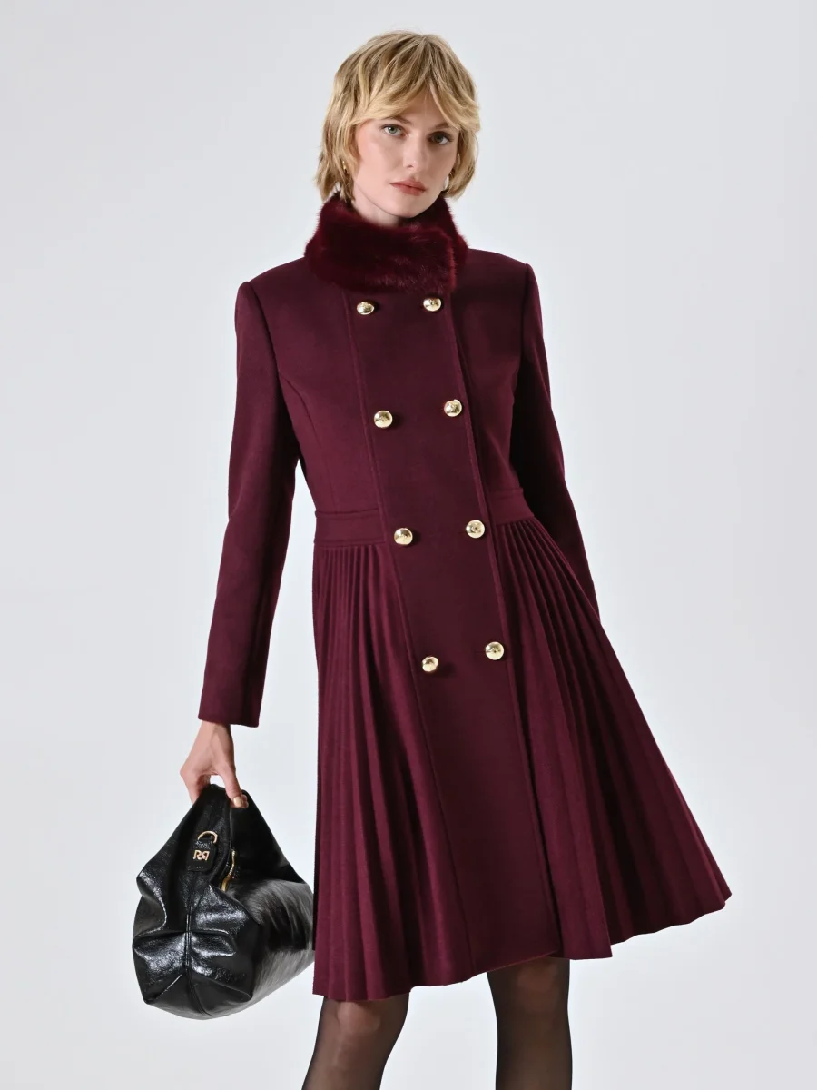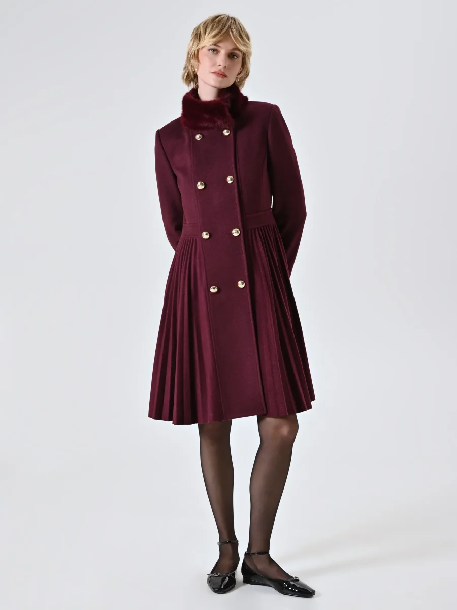 Cappotto Bordeaux Plissé con Collo in Pelliccia