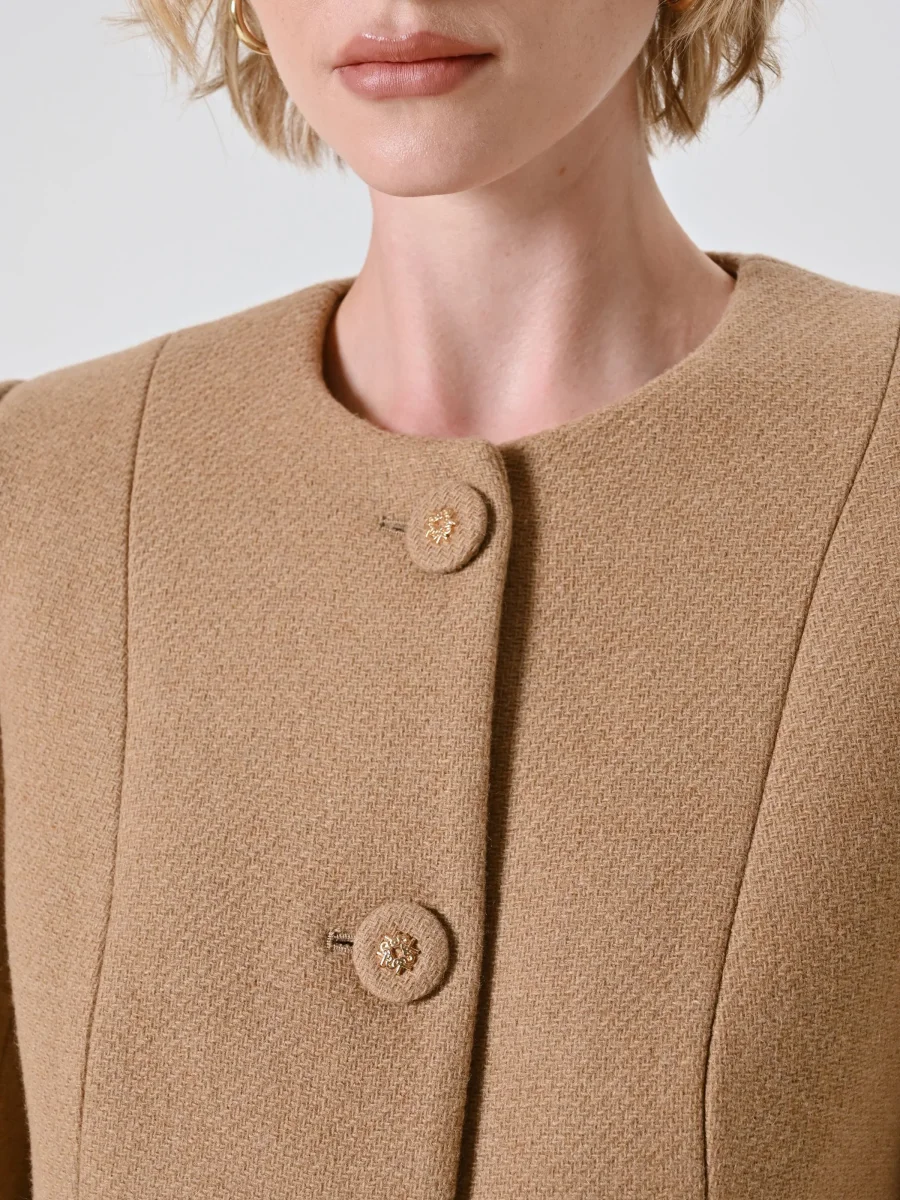 Realizzato in panno operato con disegno diagonale e tessuto parzialmente riciclato, il Cappotto Cammello con Sciarpa Removibile presenta una costruzione essenziale e femminile. È caratterizzato da una sciarpa nello stesso tessuto, rimovibile per cambiare stile con facilità. Il modello è senza collo, con bottoni a vista dal design ricercato, fodera interna, spalline strutturate e tasche alla francese che ne esaltano la funzionalità.