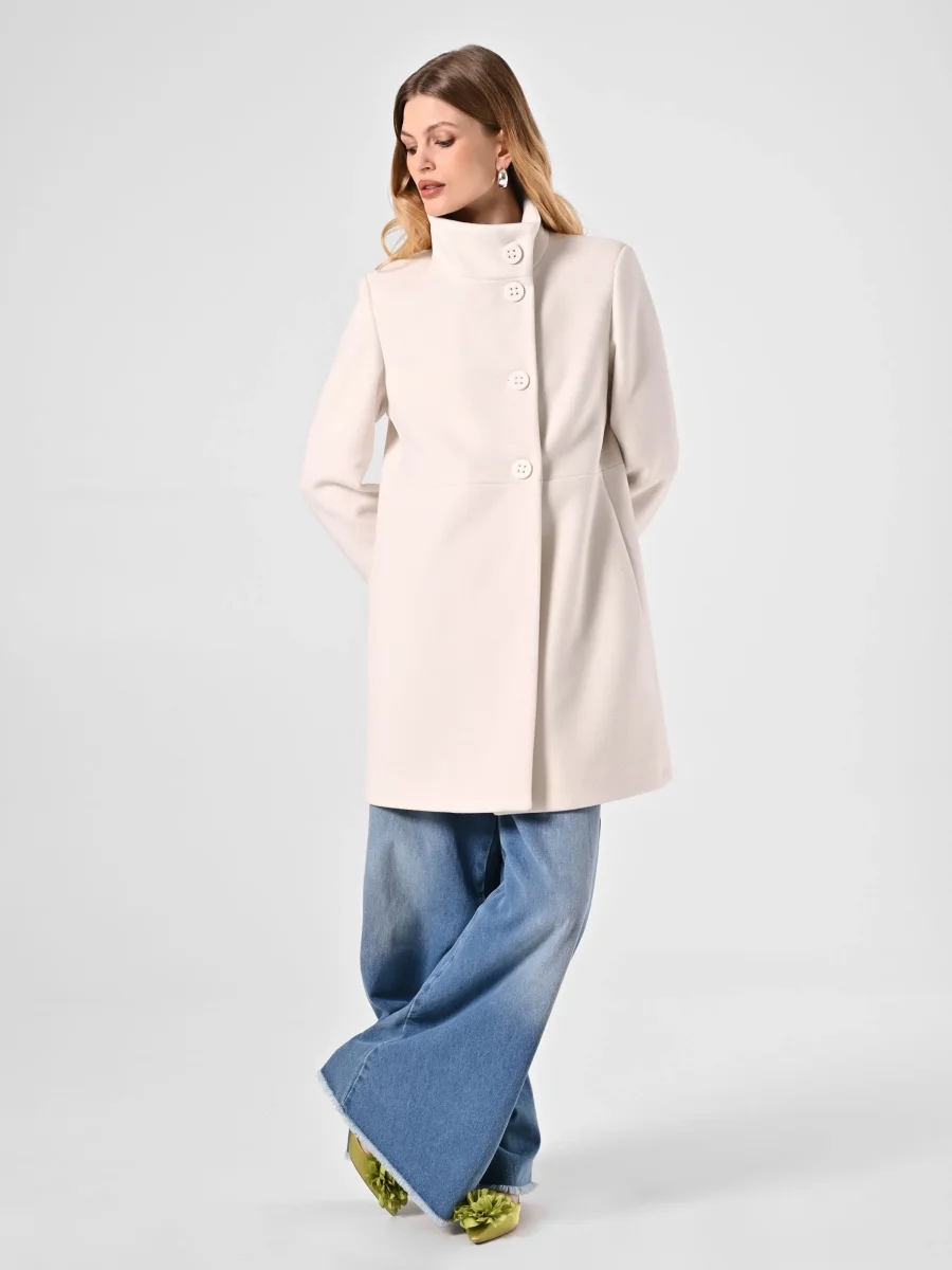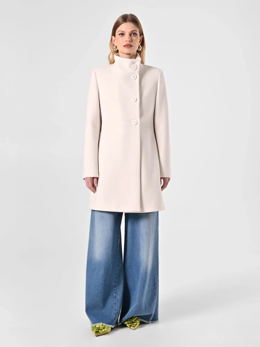 Cappotto con collo in piedi, realizzato in velour con trama diagonale. Il collo in piedi aggiunge un tocco distintivo, mentre l’abbottonatura laterale con bottoni sur-ton regala un dettaglio di stile sobrio ma ricercato. Le tasche e la fodera tono su tono completano il design, garantendo praticità e armonia estetica. Realizzato in Italia, questo cappotto è perfetto per accompagnarti nelle giornate quotidiane, in ufficio o nei momenti di tempo libero. Indossa il cappotto con collo in piedi abbinandolo a capi essenziali del guardaroba per un look senza tempo. Puoi completare l’outfit con calzature e accessori della collezione, sottolineando il tuo stile sofisticato. I bottoni a vista impreziosiscono la chiusura, esaltando la linearità del capo senza risultare eccessivi. Il cappotto con collo in piedi si presta a essere indossato in ogni occasione, dalle giornate di lavoro agli impegni più casual. Il design curato nei dettagli e il tessuto scelto con attenzione lo rendono un capo che si distingue per qualità e stile. Abbinalo alle proposte della collezione per esprimere al meglio la tua personalità, dal look minimalista al più ricercato. La modella è alta 1,71 m.