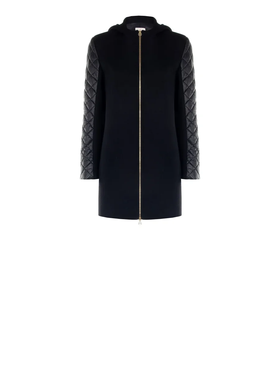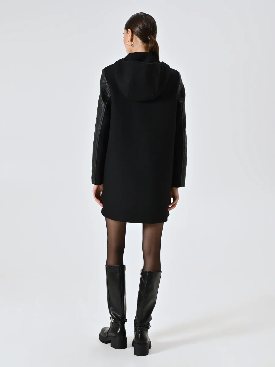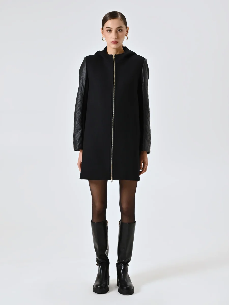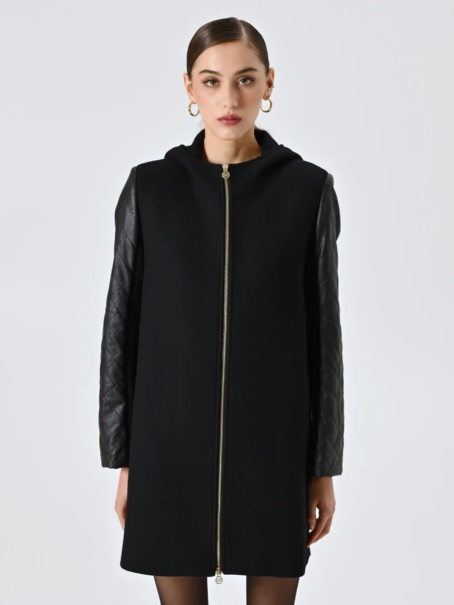 Realizzato in panno diagonale con inserti in similpelle matelassé, il Cappotto con Maniche Similpelle Matelassé si distingue per la presenza del cappuccio e delle pratiche tasche laterali. Le maniche effetto pelle aggiungono un tocco moderno e ricercato, mentre la chiusura frontale con zip dorata a vista conferisce luminosità e carattere.