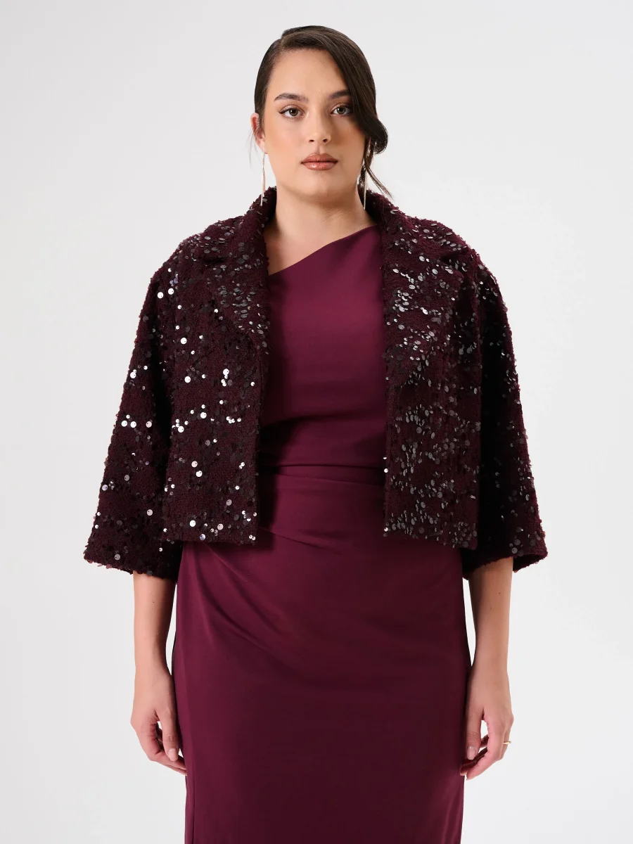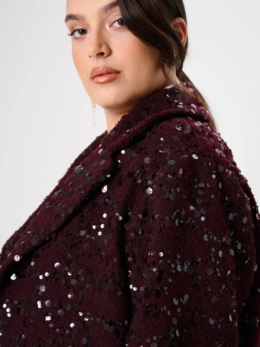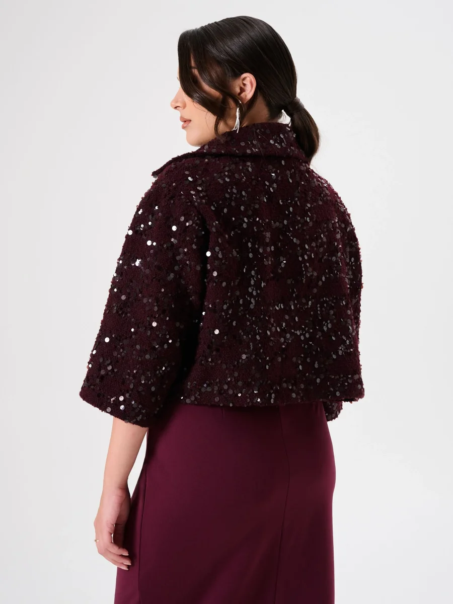 Cappotto Corto Curvy in Panno Bouclé Bordeaux con Paillettes