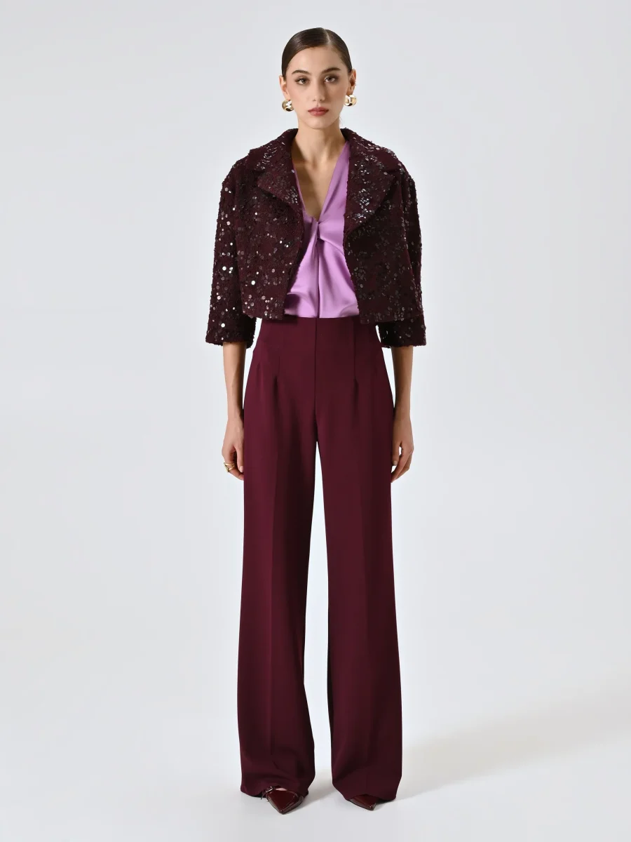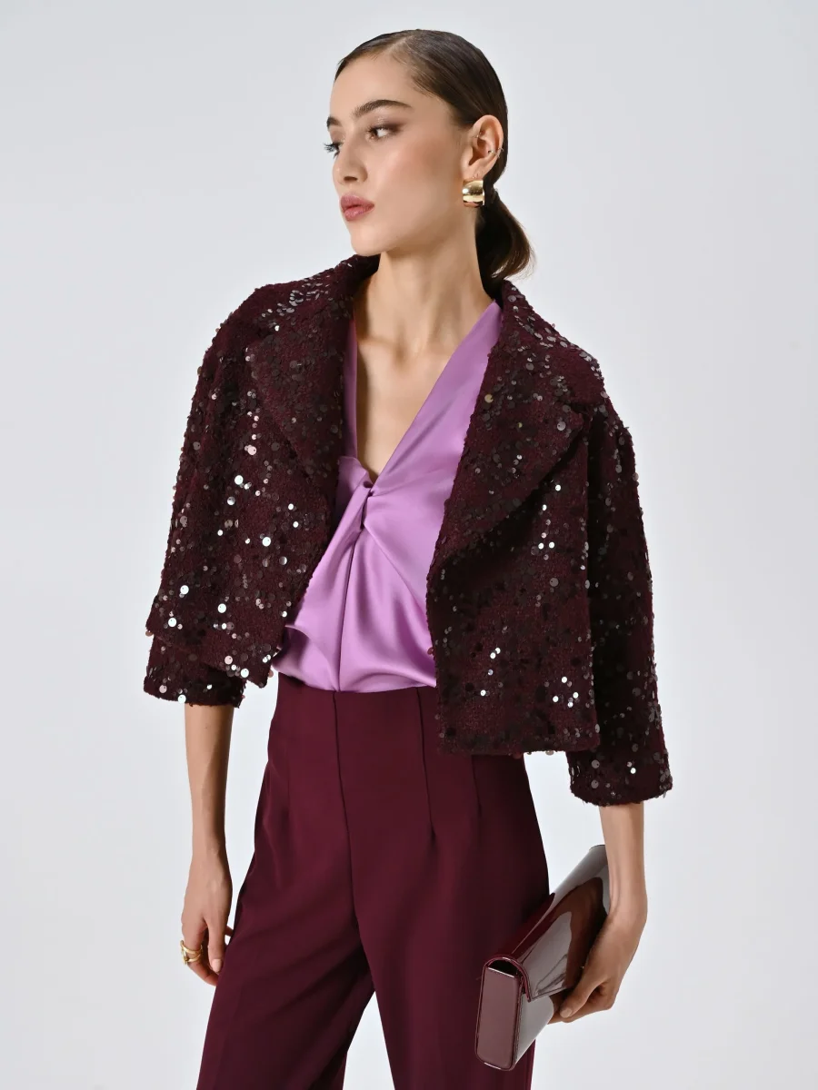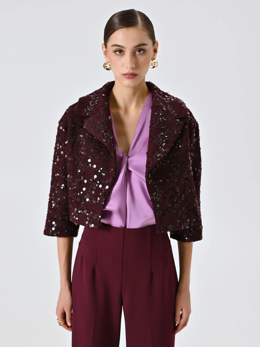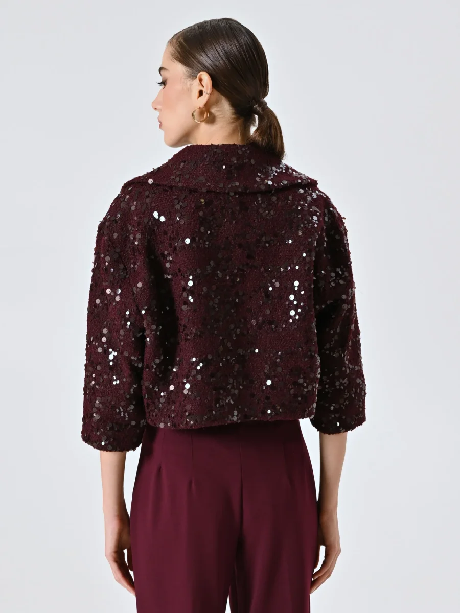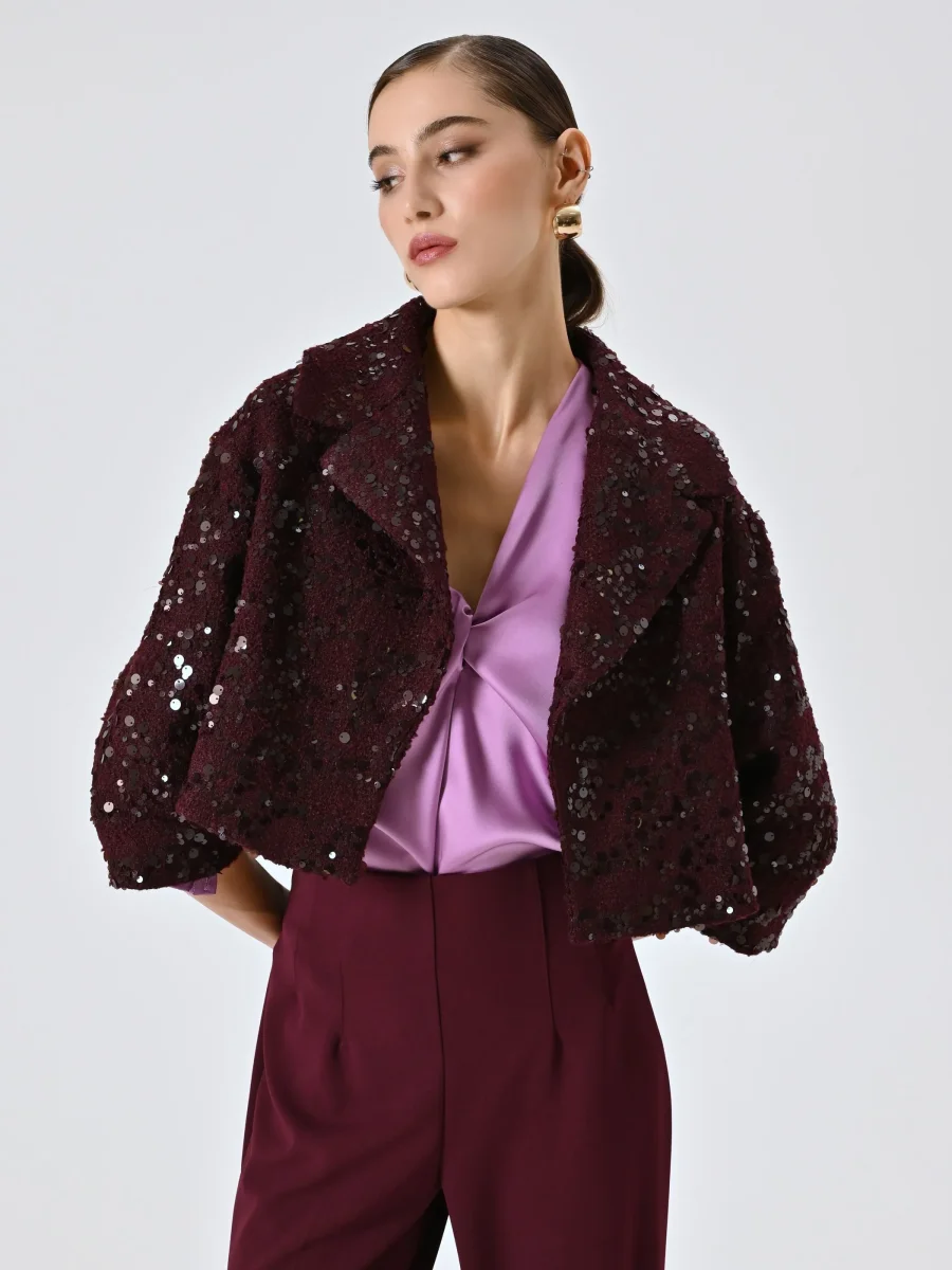 Cappotto Corto in Panno Bouclé Bordeaux con Paillettes