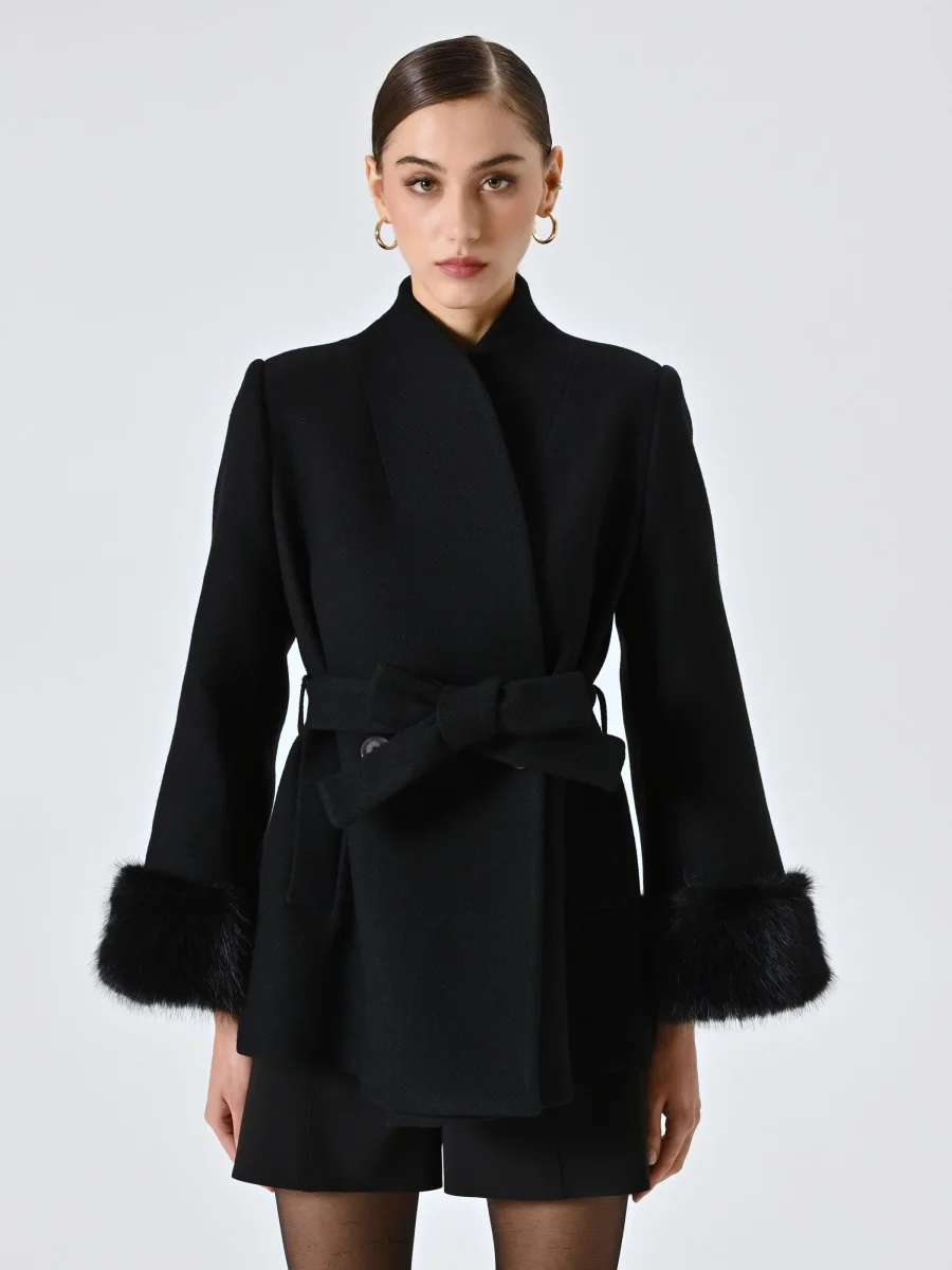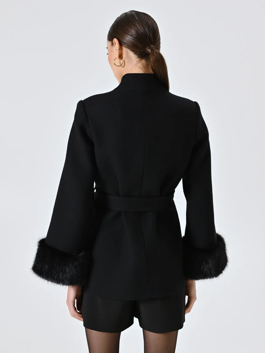 Cappotto Corto Nero con Inserti effetto Pelliccia