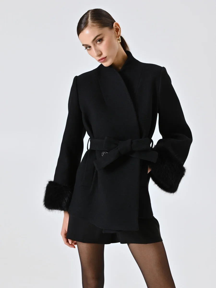 Il Cappotto Corto con Inserti effetto Pelliccia è un capospalla sofisticato che aggiunge un tocco glamour ai tuoi look invernali, unendo comfort e ricercatezza.