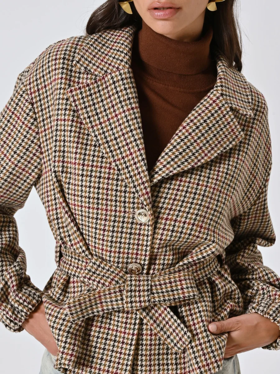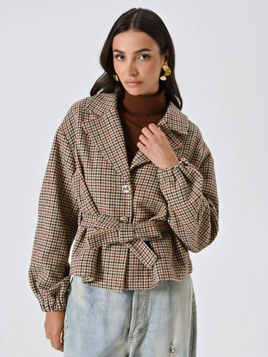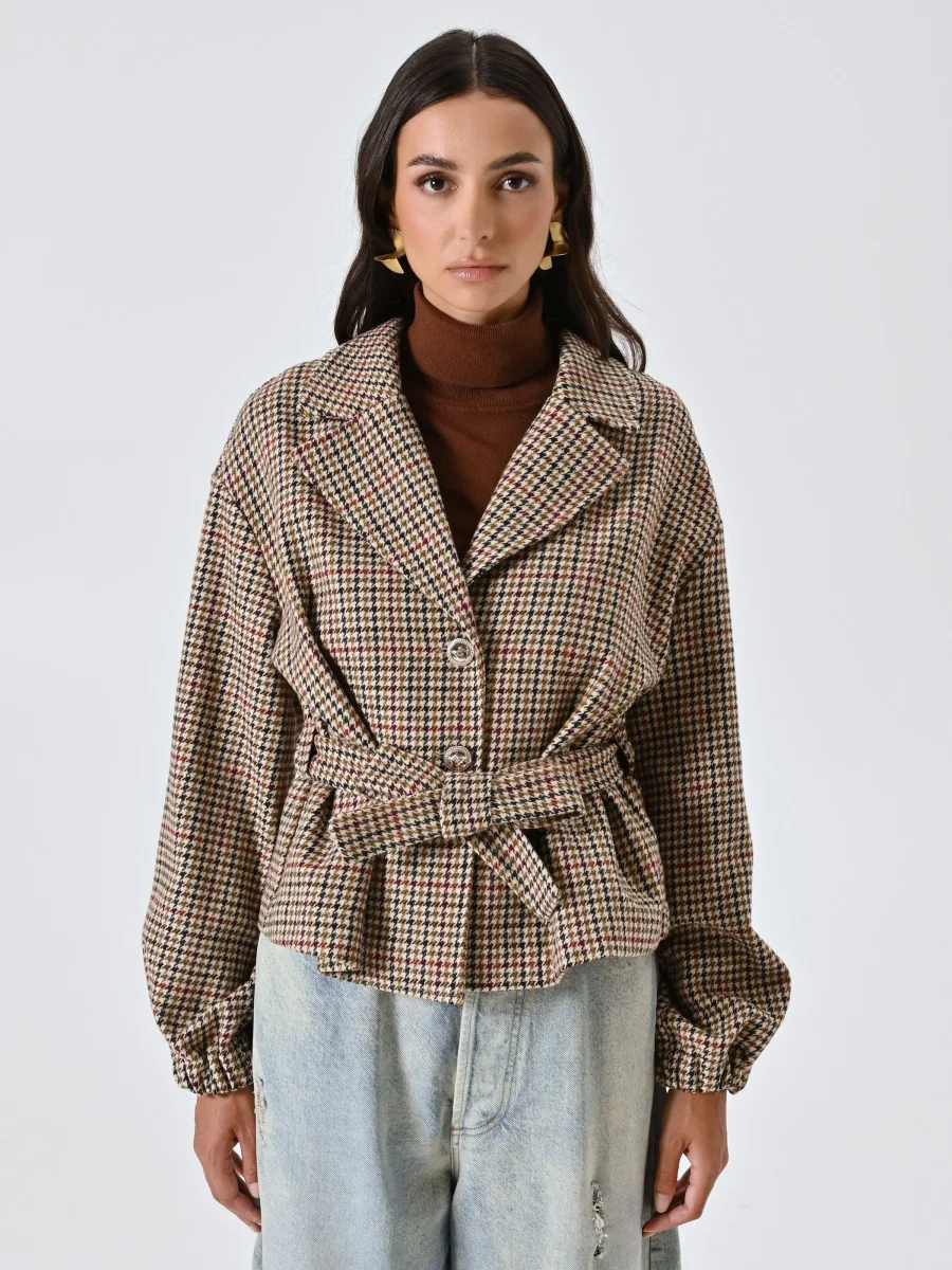 Il Cappotto Corto Pied-de-Poule Multicolor è una proposta raffinata e attuale, perfetta per aggiungere un tocco grafico e femminile ai look da giorno.