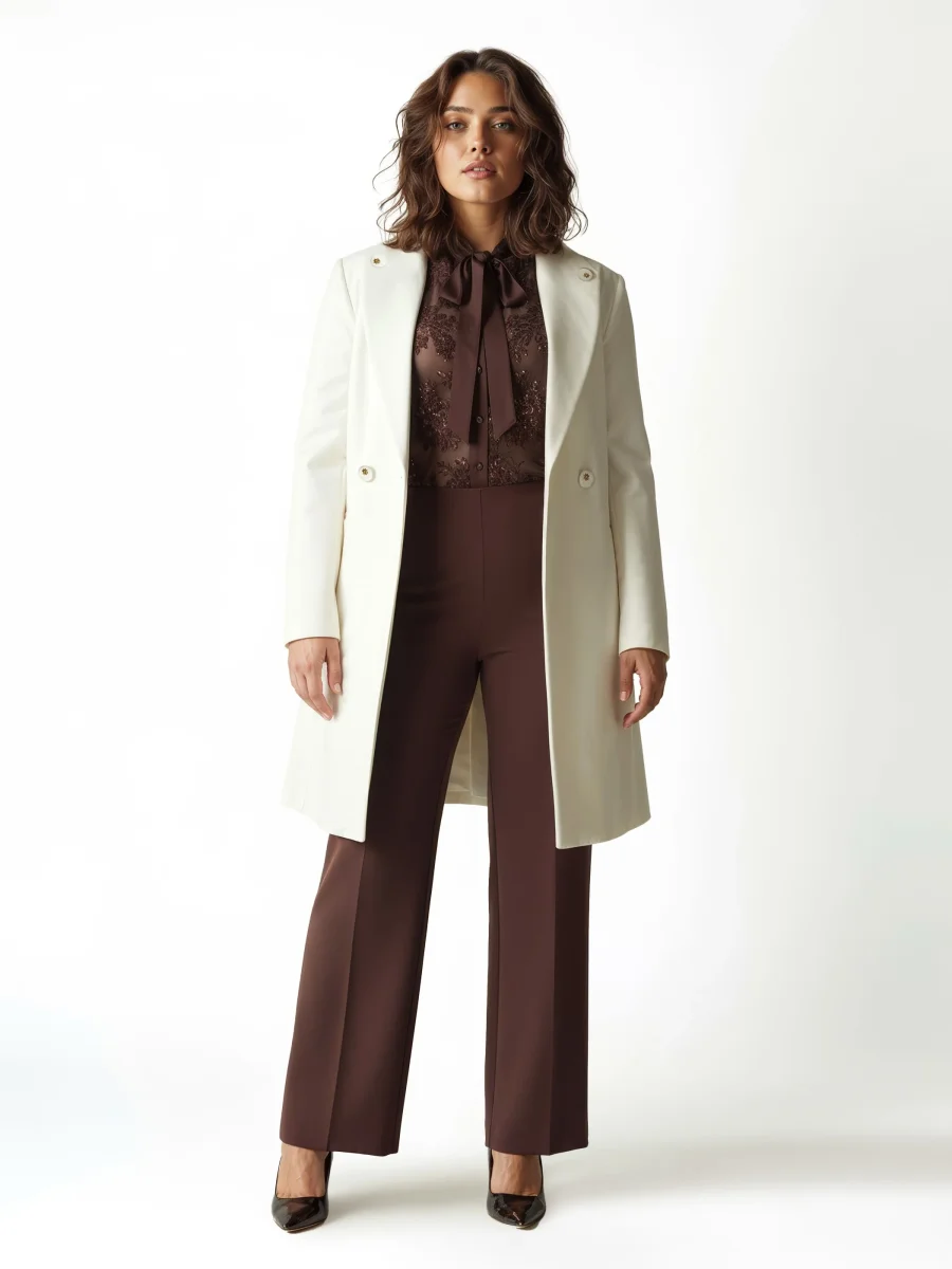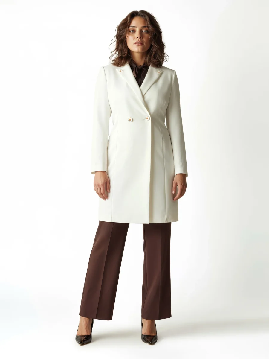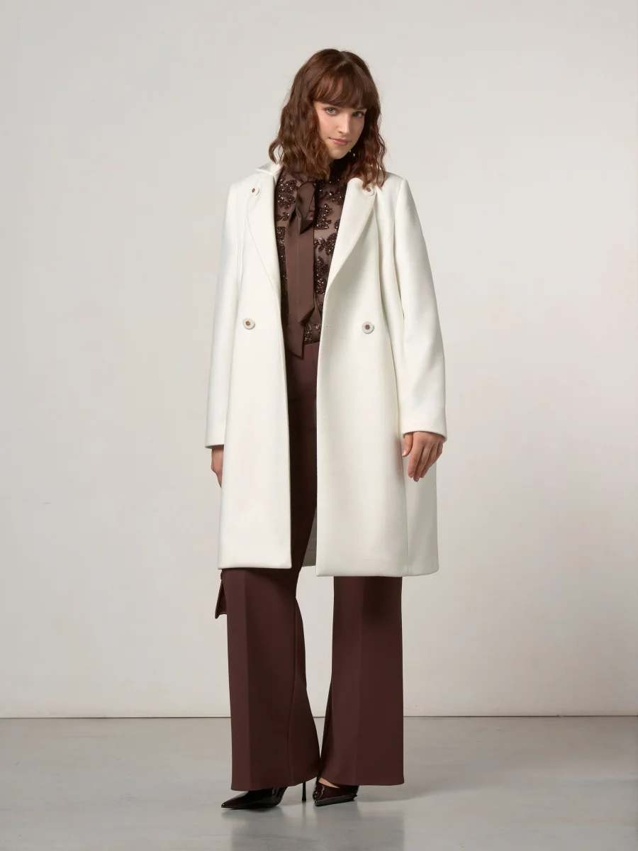 Un’eleganza essenziale definisce questo cappotto doppiopetto bianco, un capo pensato per illuminare con stile il guardaroba della stagione fredda. La sua linea dritta e pulita scivola sulla figura, valorizzandola senza costrizioni. Il design è caratterizzato da rever classici e una chiusura doppiopetto con due bottoni a vista in tinta, resi unici da un dettaglio centrale a contrasto che aggiunge un tocco distintivo. Le cuciture verticali frontali strutturano il modello con precisione, accompagnando lo sguardo lungo la silhouette fino all’orlo a metà coscia.