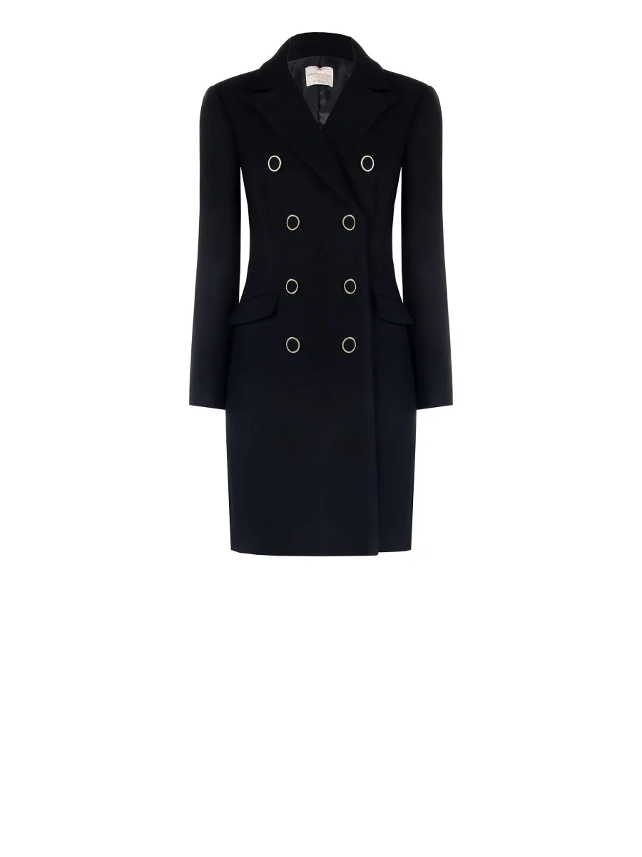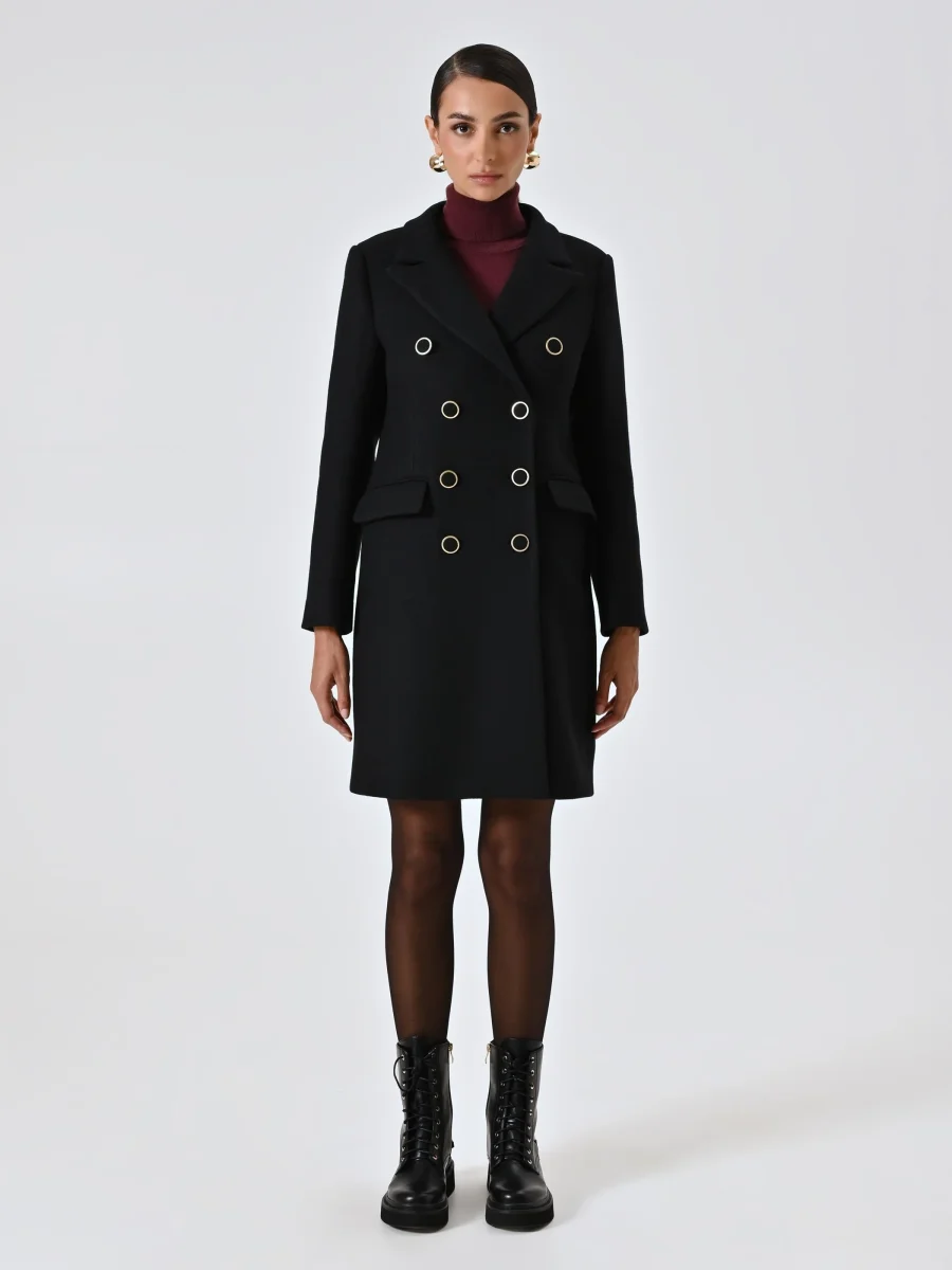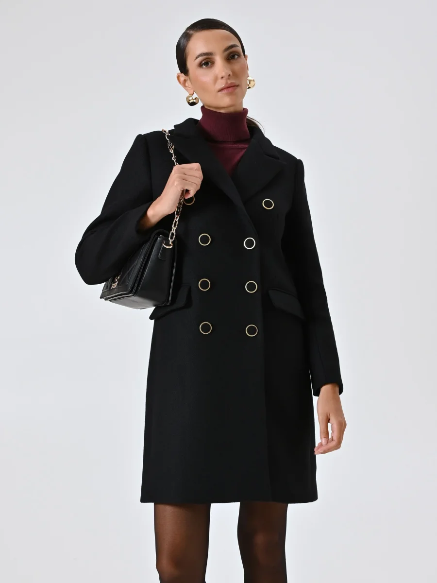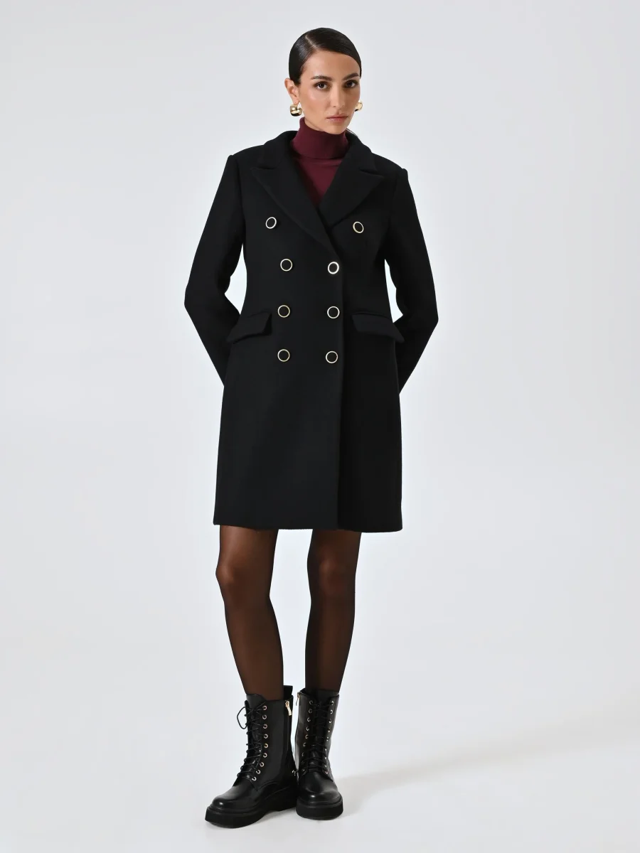 Realizzato in panno diagonale con tessuto parzialmente riciclato, il Cappotto Doppiopetto presenta revers a lancia, tasche con patte e bottoni cerchiati dorati che impreziosiscono il design. Le spalline leggermente imbottite donano struttura alla silhouette, mentre la chiusura doppiopetto assicura un fit femminile e avvolgente.