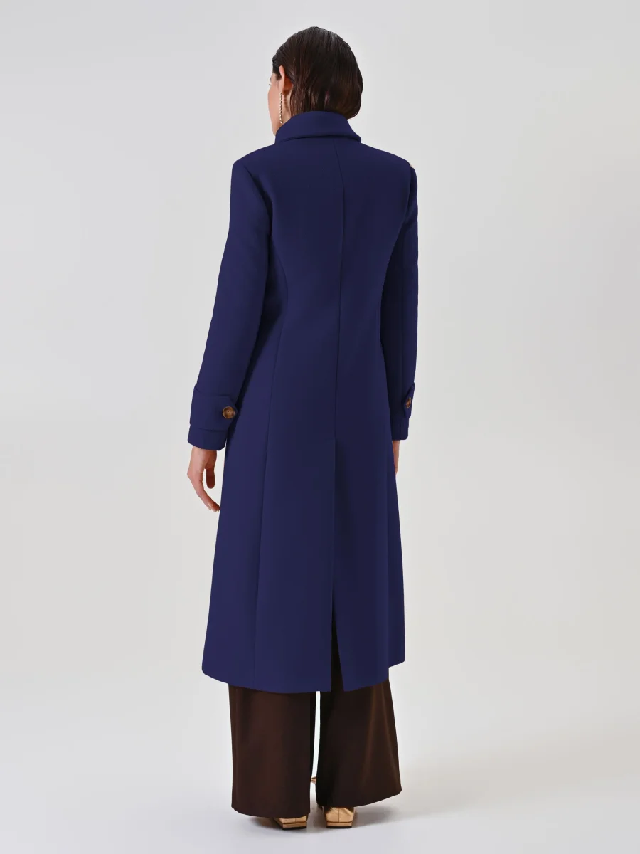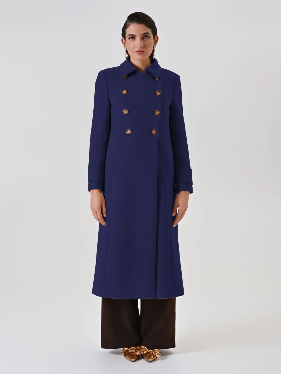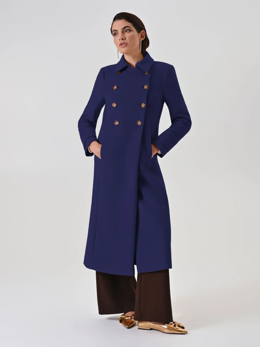 Il cappotto lungo sfiancato blu navy è un capo essenziale e intramontabile del guardaroba femminile, perfetto per chi cerca un’eleganza che dura nel tempo.