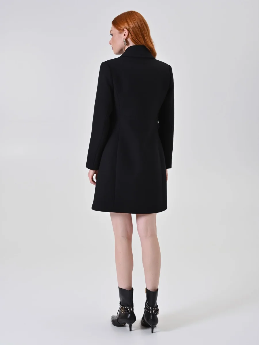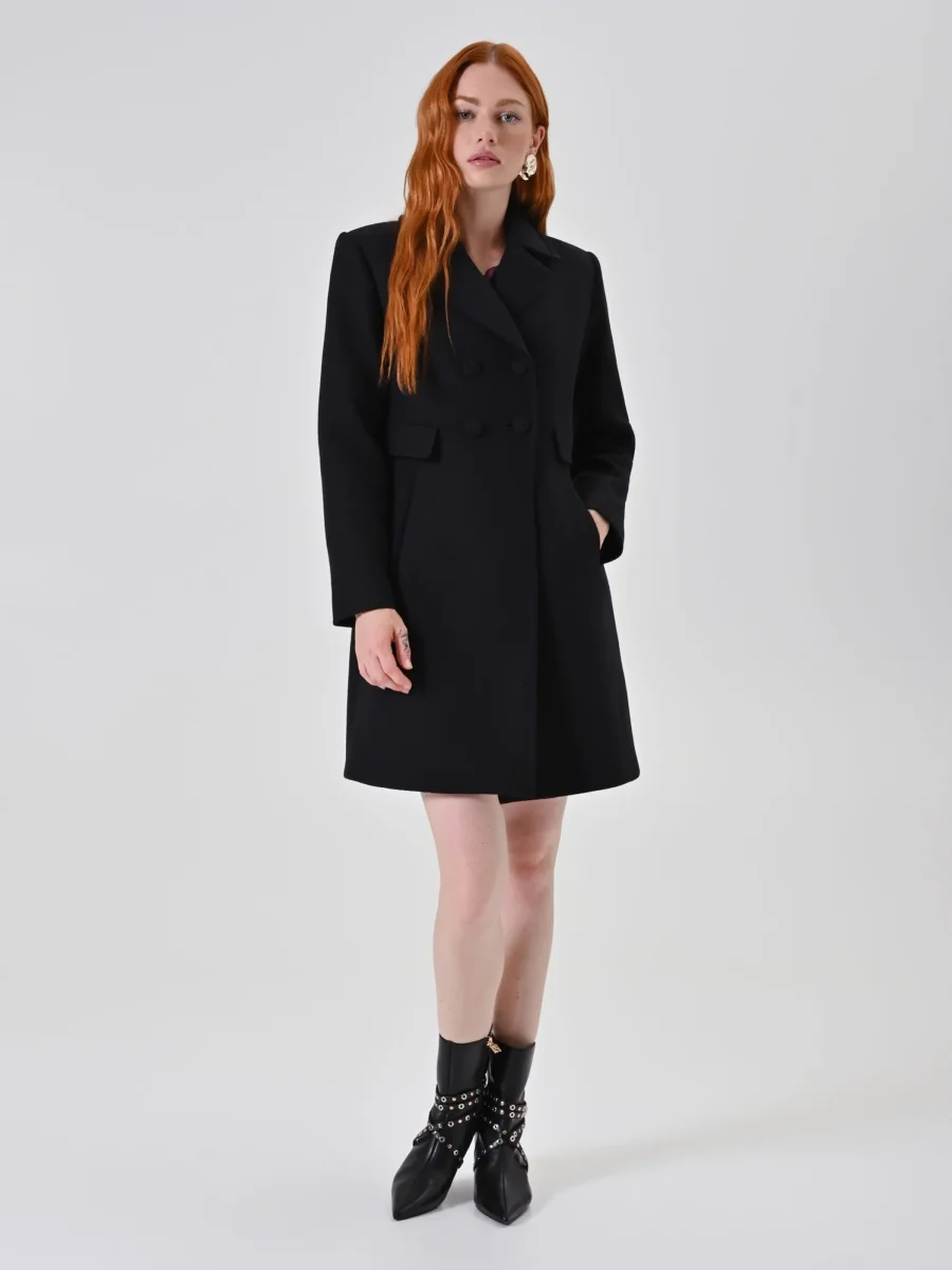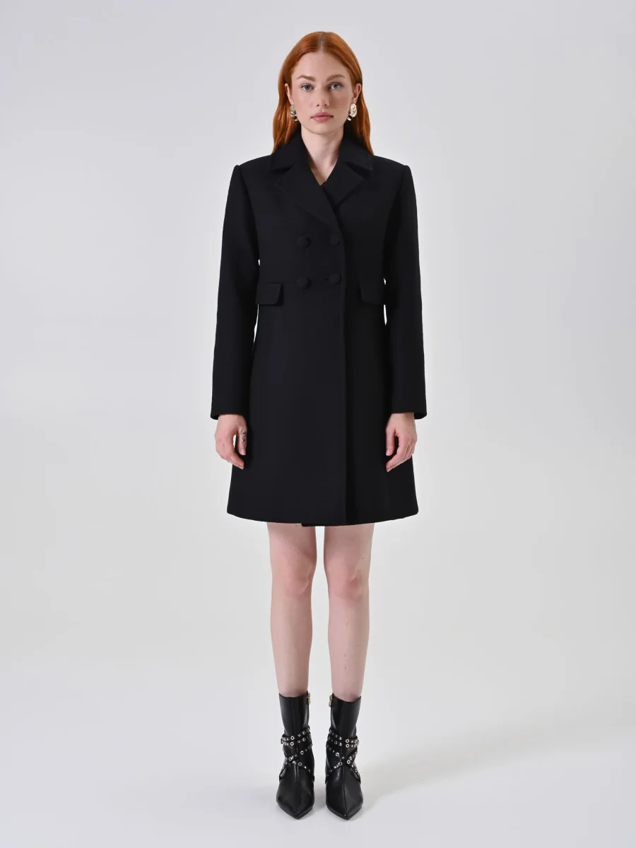 Il Cappotto Doppiopetto con Bottoni Ricoperti si completa con calzature ed accessori di collezione, adattandosi facilmente sia a look formali che più casual. Ideale per una donna che desidera uno stile femminile e moderno, si distingue rispetto ad altri capi per la qualità dei materiali e i dettagli studiati che lo rendono unico.