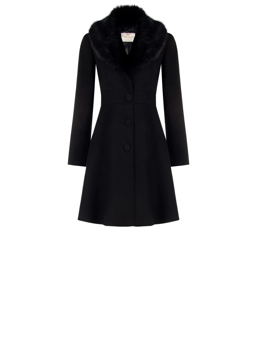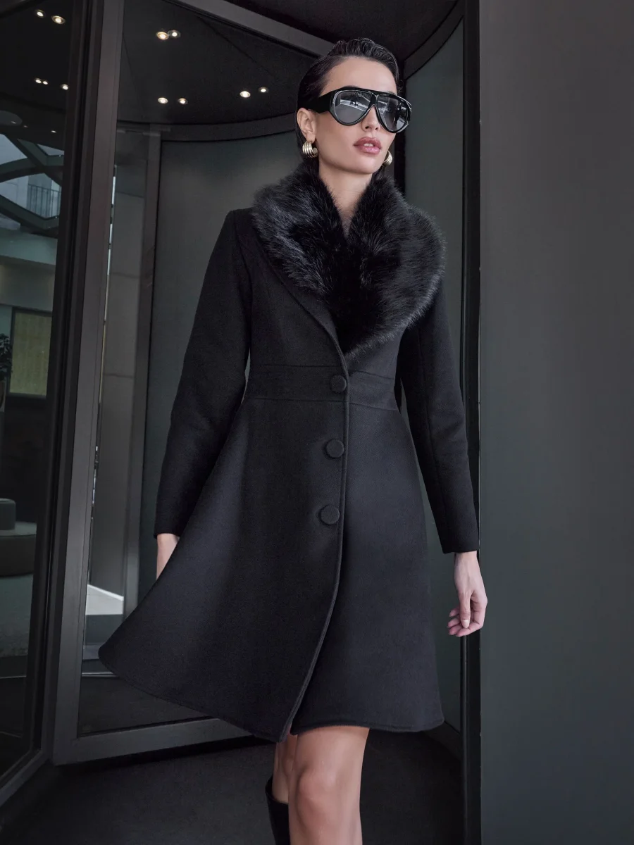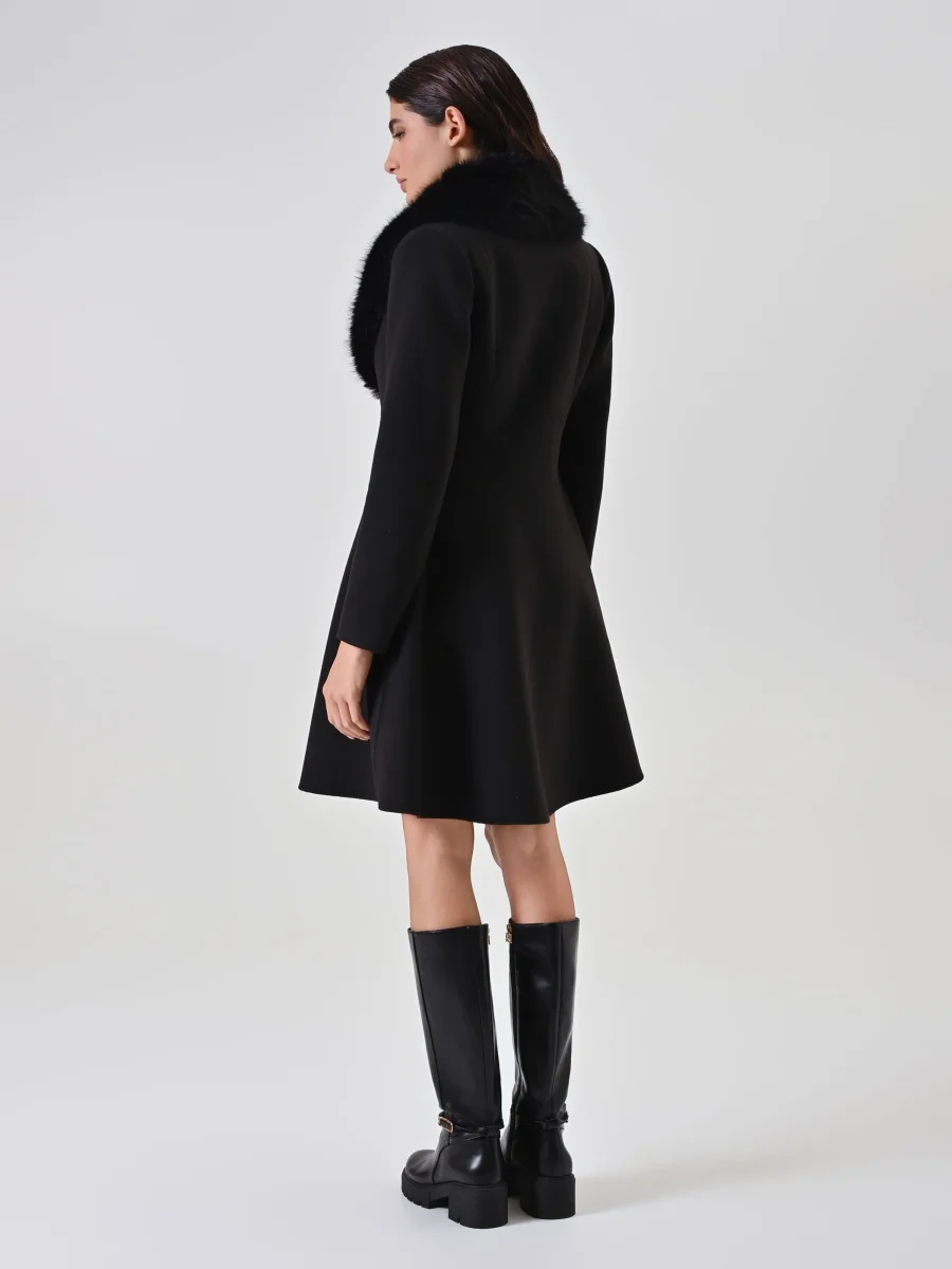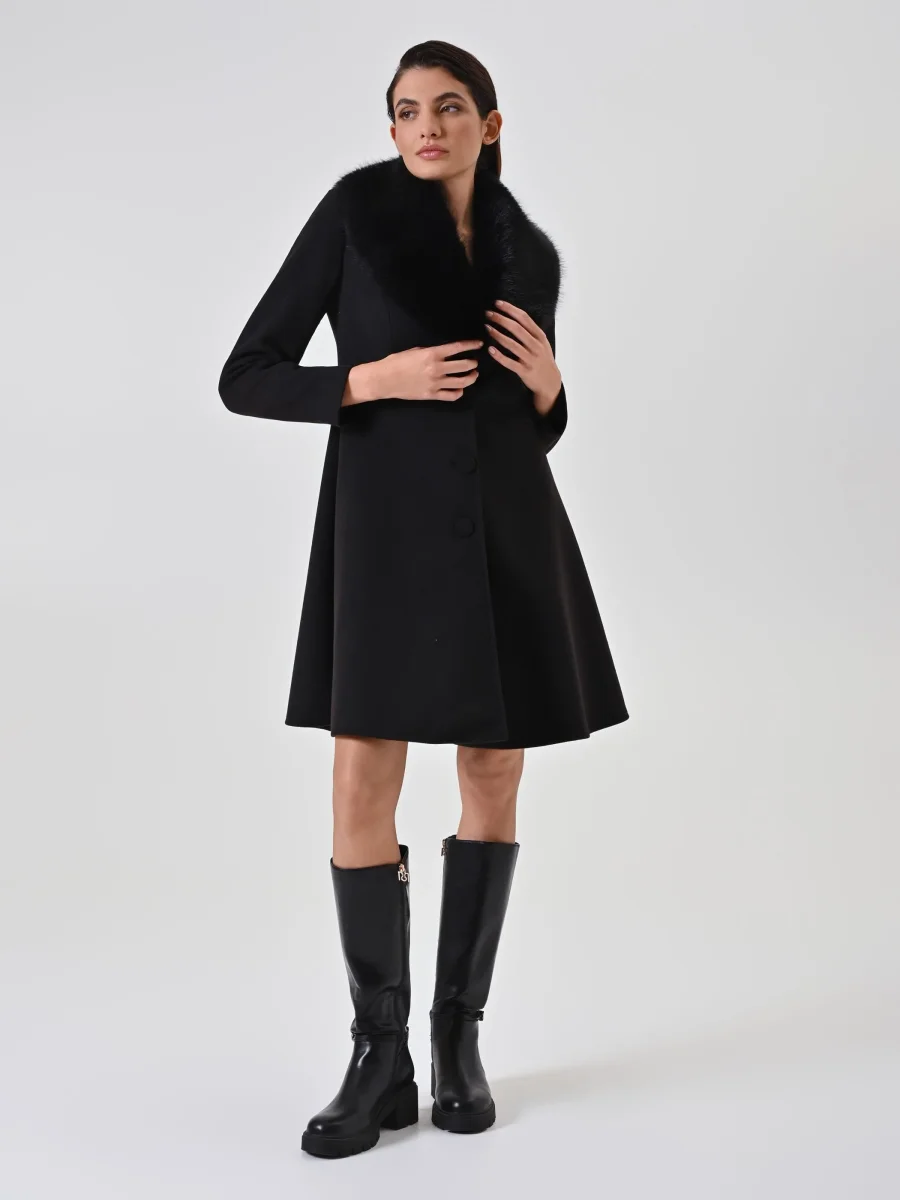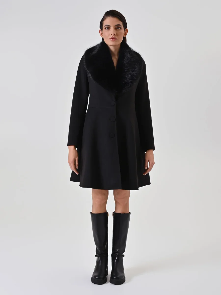La silhouette, leggermente svasata e con un taglio orizzontale in vita, disegna una figura armonica. Il protagonista del capospalla è l’ampio e avvolgente collo a scialle realizzato in morbido tessuto effetto pelliccia, tono su tono, che aggiunge un elemento di raffinatezza e protegge dal freddo. La chiusura è monopetto, con bottoni neri a vista, un dettaglio funzionale che si inserisce con coerenza nel design pulito del capo.