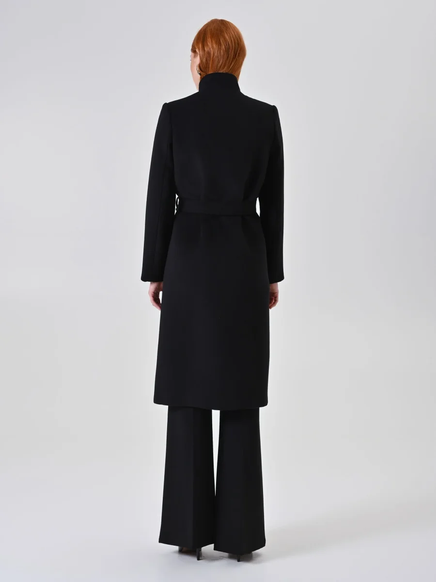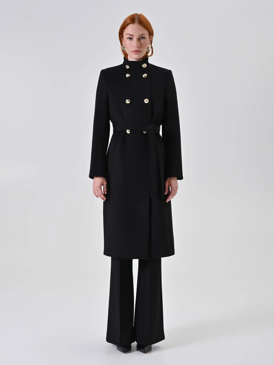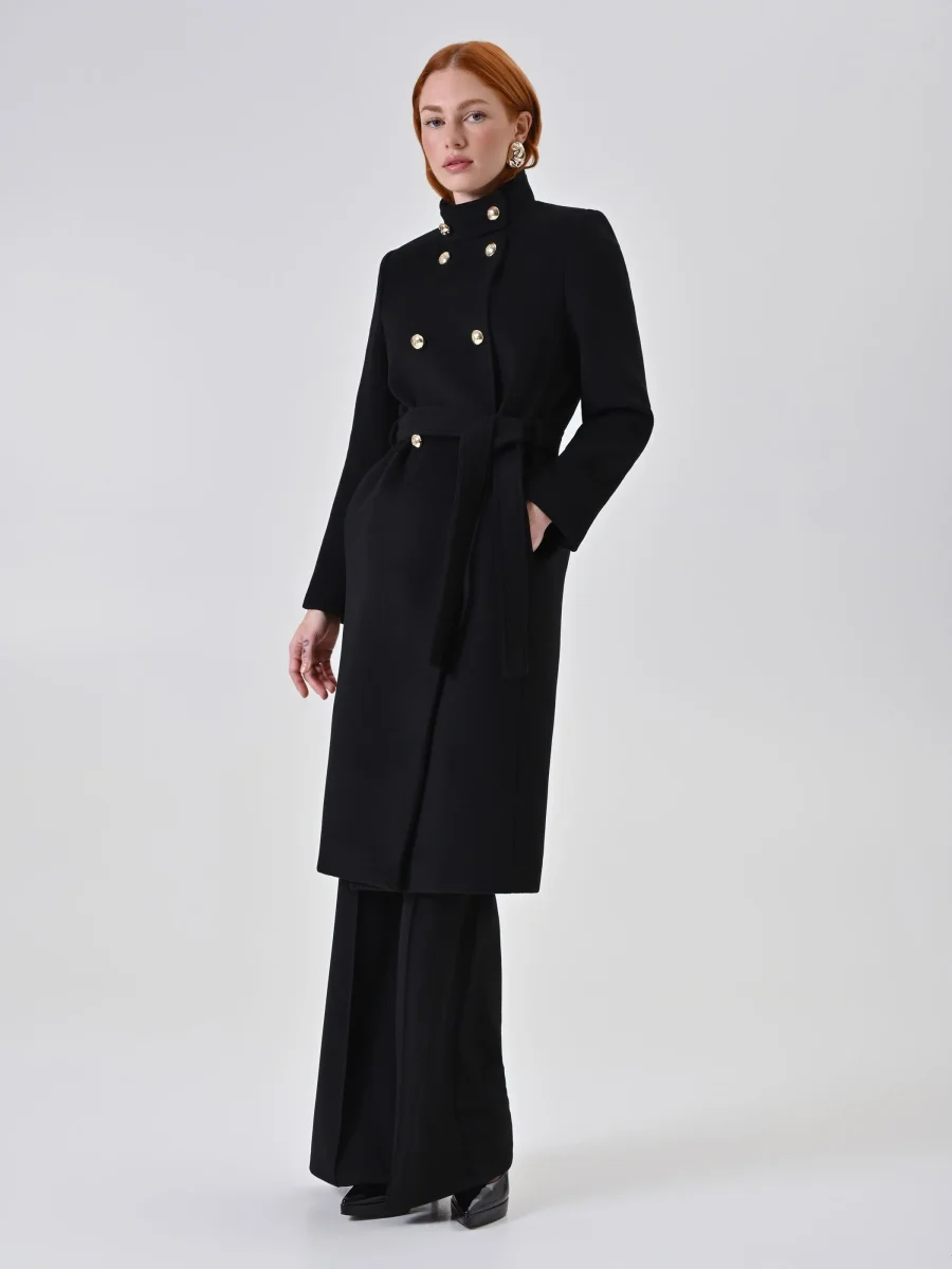 Il Cappotto Nero Doppiopetto con Collo in Piedi si abbina facilmente a look casual o eleganti, completandosi con calzature ed accessori di collezione. Ideale per accompagnare la donna in ogni momento della giornata e in occasioni speciali, è una scelta versatile che unisce funzionalità e raffinatezza.