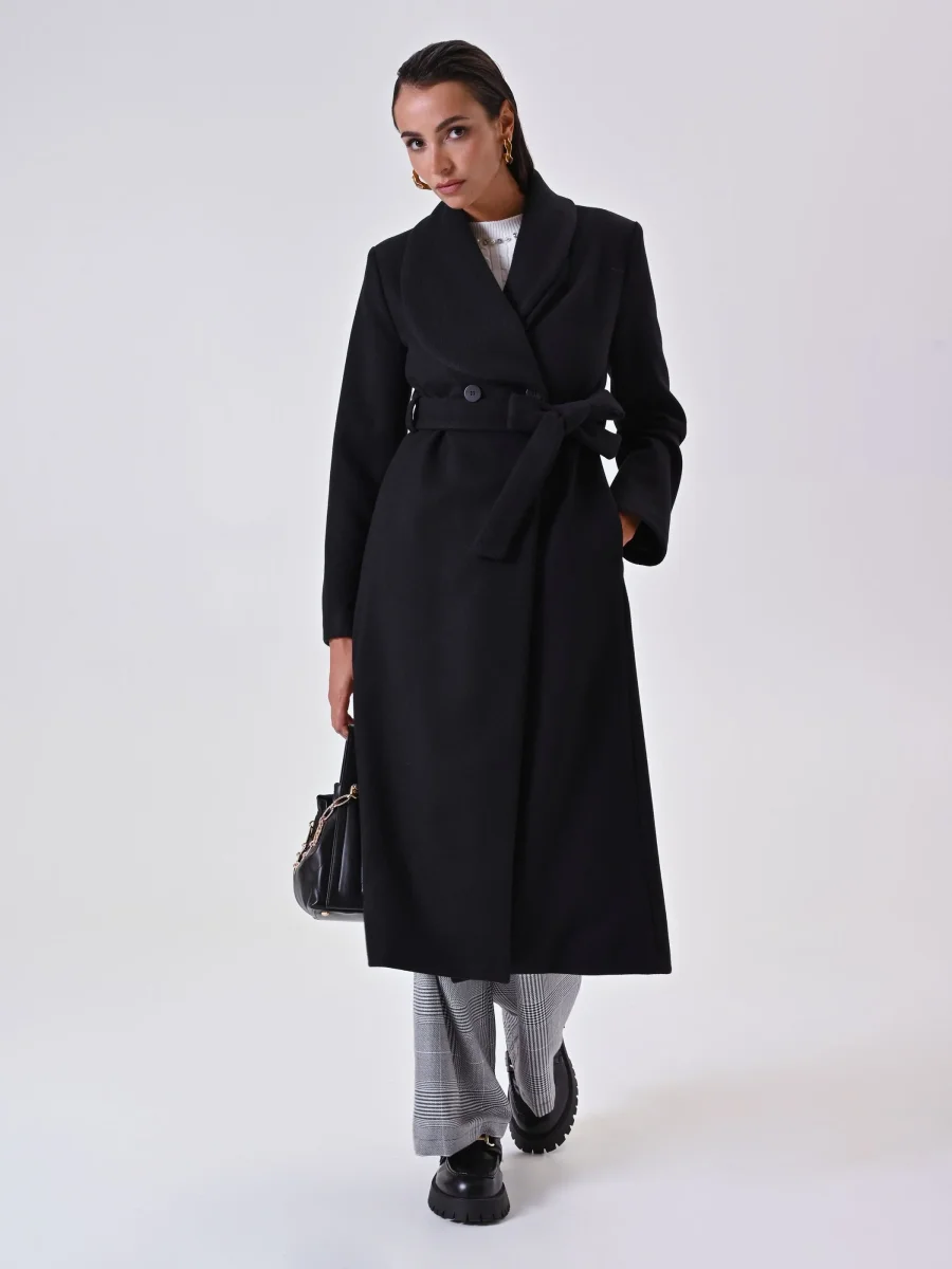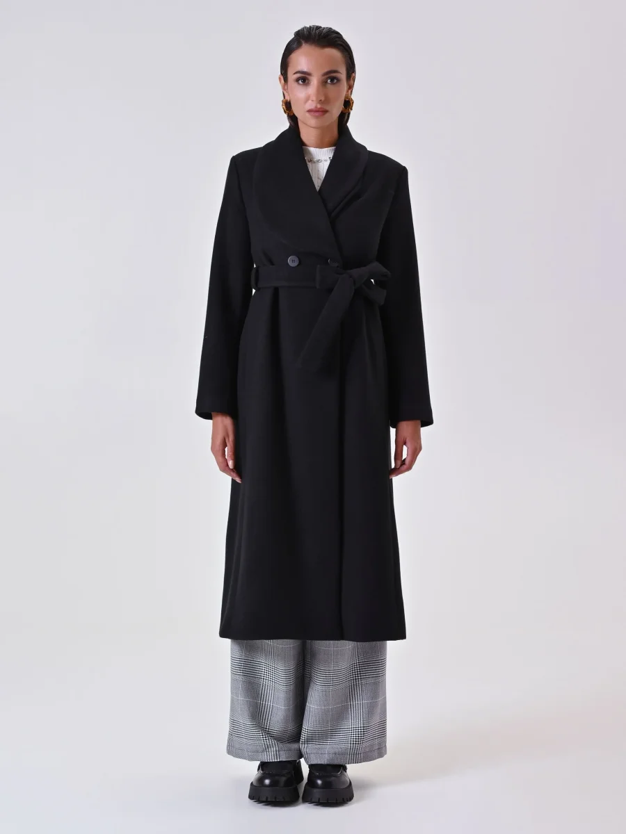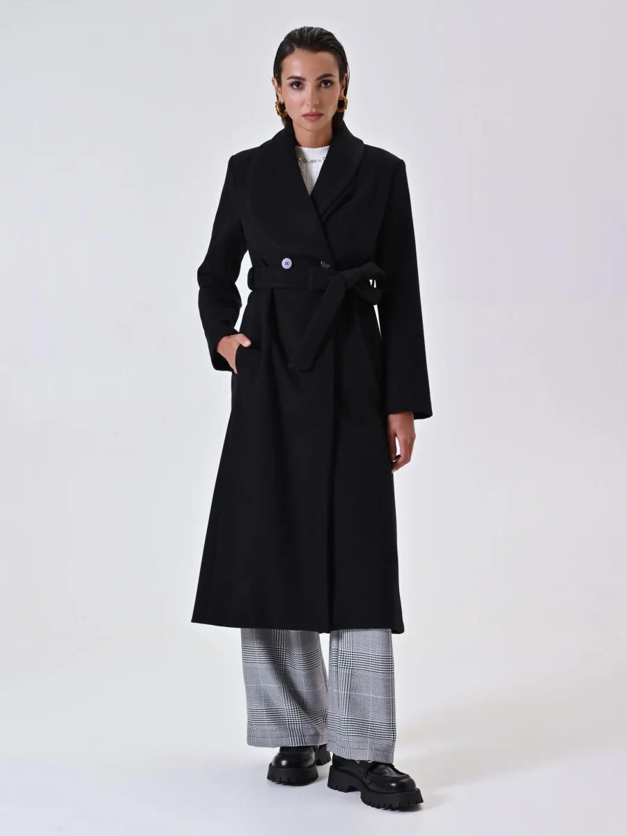 Il Cappotto Doppiopetto Lungo con Rever Ampio è un capospalla di grande impatto, perfetto per completare il guardaroba con un tocco di eleganza moderna.