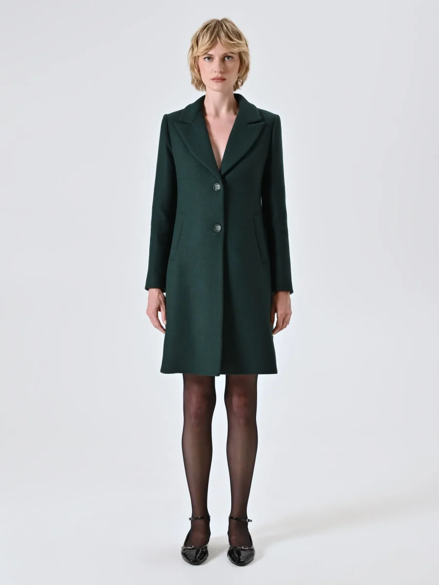 Realizzato in panno operato con disegno diagonale, il Cappotto con Revers a Lancia è caratterizzato da revers a lancia, tasche alla francese, bottoni tono su tono e fodera coordinata. La chiusura con bottoni assicura una vestibilità femminile e una silhouette pulita.