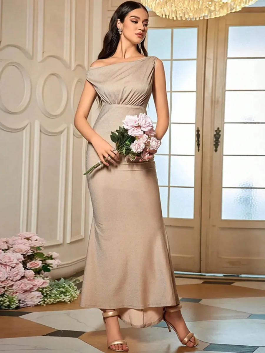 Laissez-vous séduire par notre sublime robe couleur champagne, conçue pour sublimer votre silhouette. Ce modèle d’exception épouse parfaitement vos courbes grâce à sa coupe sirène et son tissu satiné extensible parsemé de délicates paillettes scintillantes. L’asymétrie sophistiquée du décolleté sur une épaule crée un jeu de drapé raffiné qui met en valeur votre buste, tandis que la taille cintrée souligne harmonieusement votre silhouette. Longue jusqu’aux chevilles avec une légère traîne, cette robe allie élégance intemporelle et touche contemporaine, parfaite pour vos événements les plus prestigieux.
