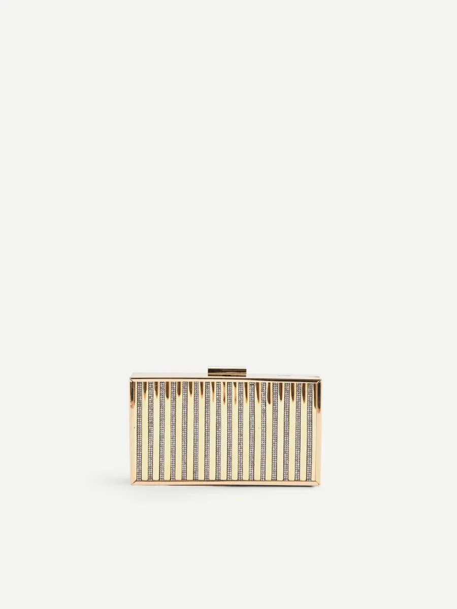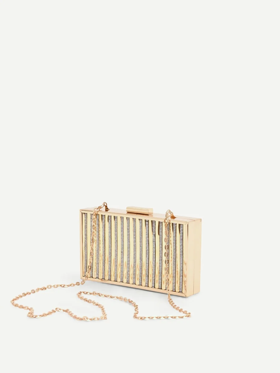 Il suo design rettangolare, modello box clutch, è realizzato in metallo con finitura argento lucido. La superficie è interamente percorsa da un elegante motivo a righe verticali, che alterna fasce di metallo liscio a canali impreziositi da un fitto pavé di strass color cristallo. Questa lavorazione crea un suggestivo gioco di riflessi ad ogni movimento, donando dinamismo all’accessorio. La cornice liscia e la chiusura a scatto superiore, anch’essa rettangolare, completano la struttura con un tocco minimale e contemporaneo.