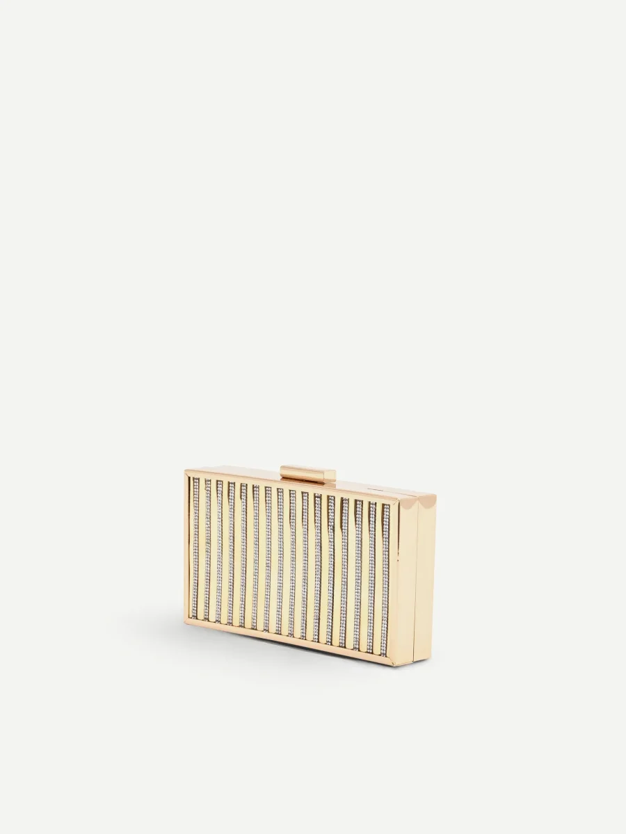 Geometrie luminose e un design compatto per la clutch rigida, l’accessorio pensato per custodire l’essenziale e illuminare i look delle occasioni più speciali. Un vero punto luce che cattura l’attenzione con discrezione e raffinatezza.