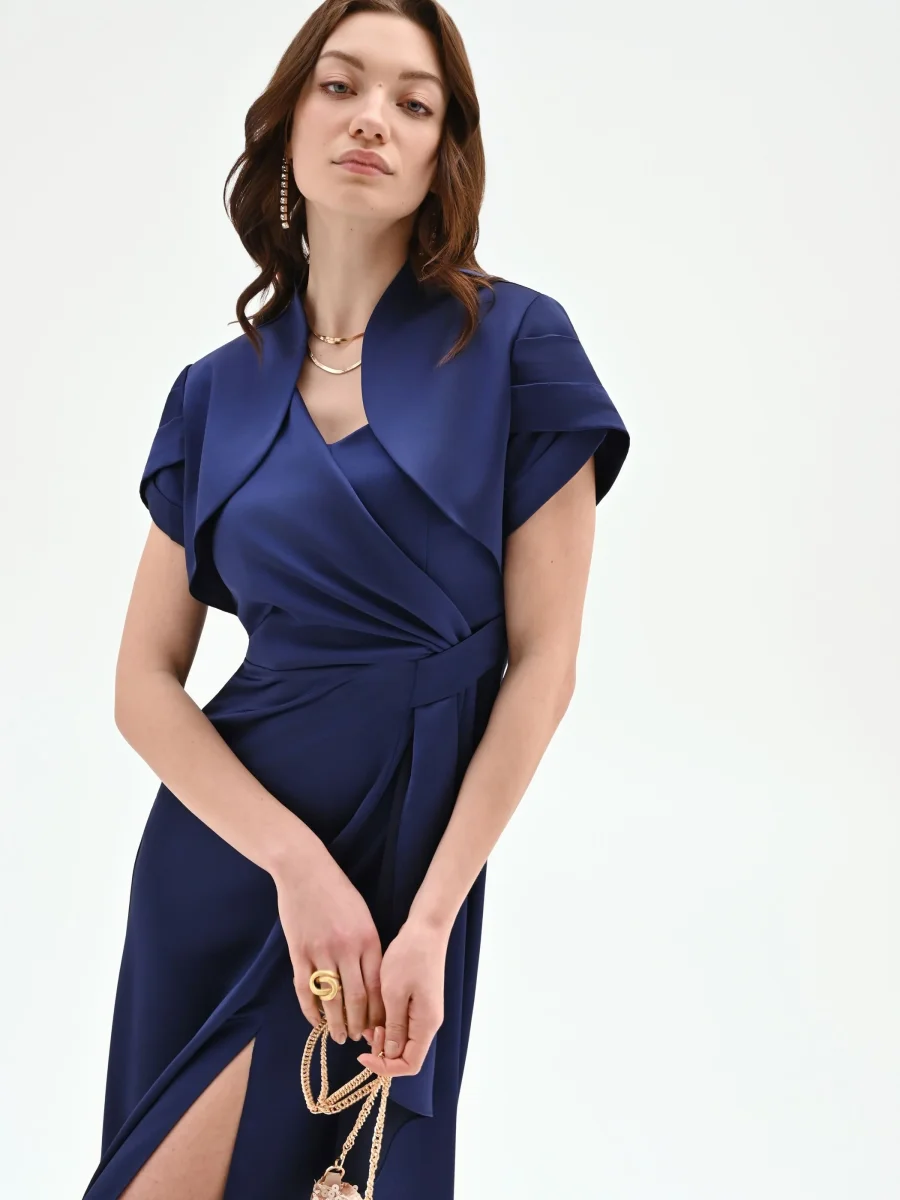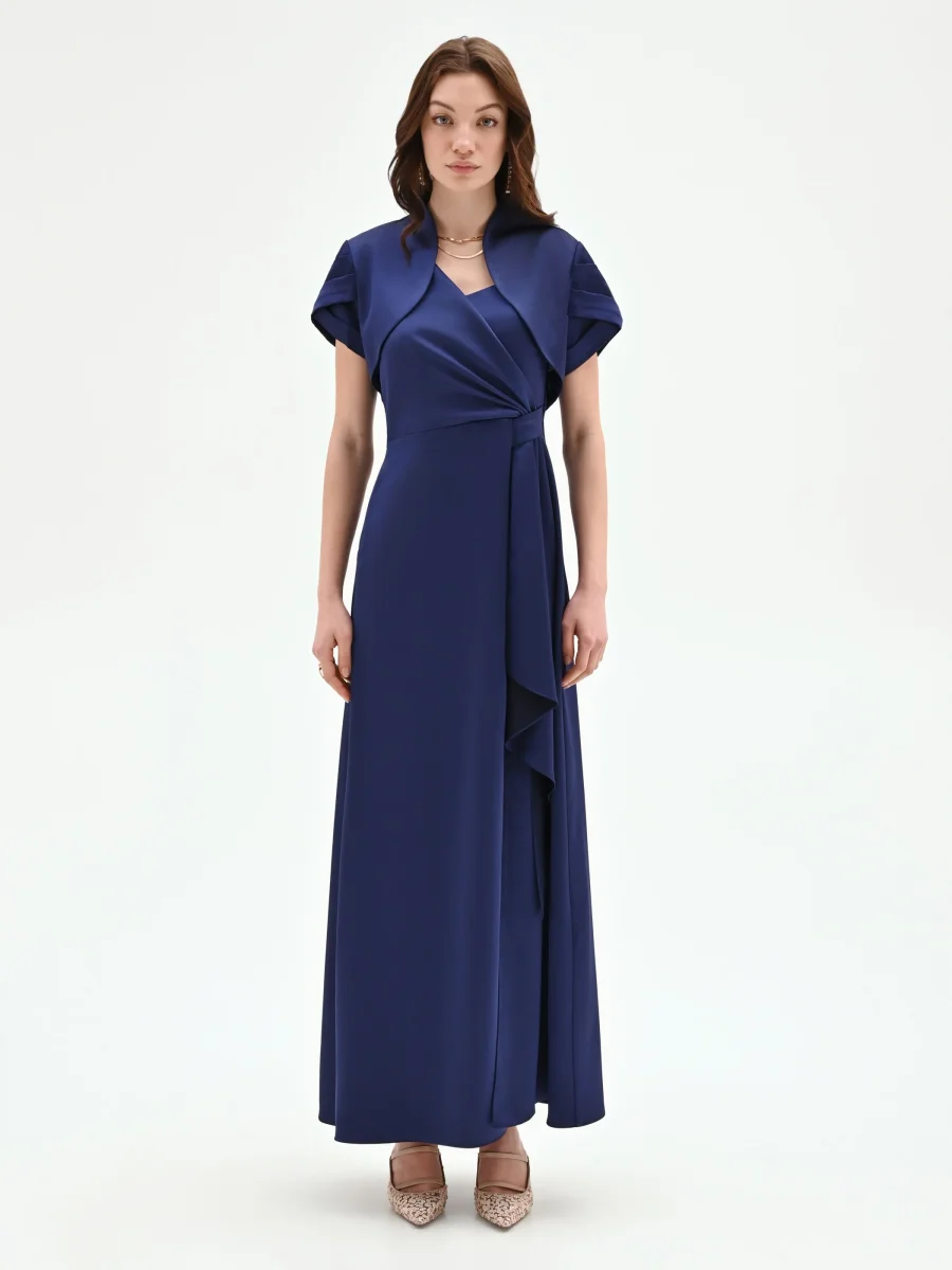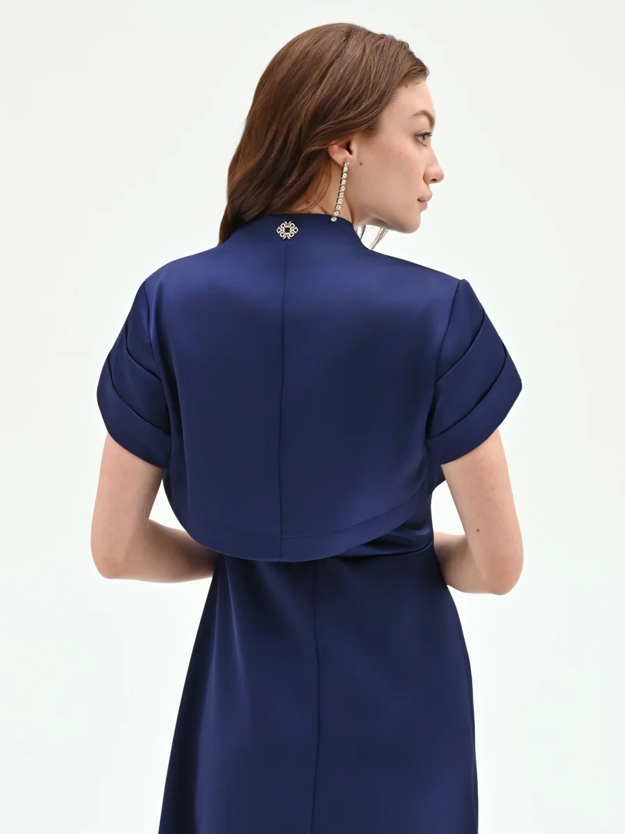 Un’architettura di tessuto che veste le spalle con moderna eleganza. Il coprispalla bolero blu indaco è il capo studiato per completare con un tocco di raffinatezza gli outfit destinati alle occasioni più importanti.