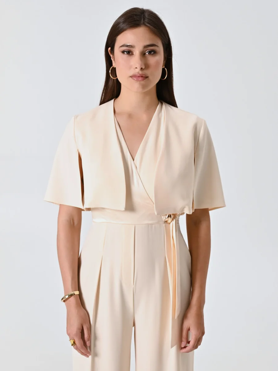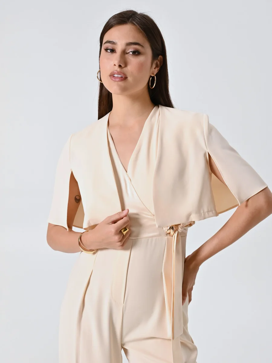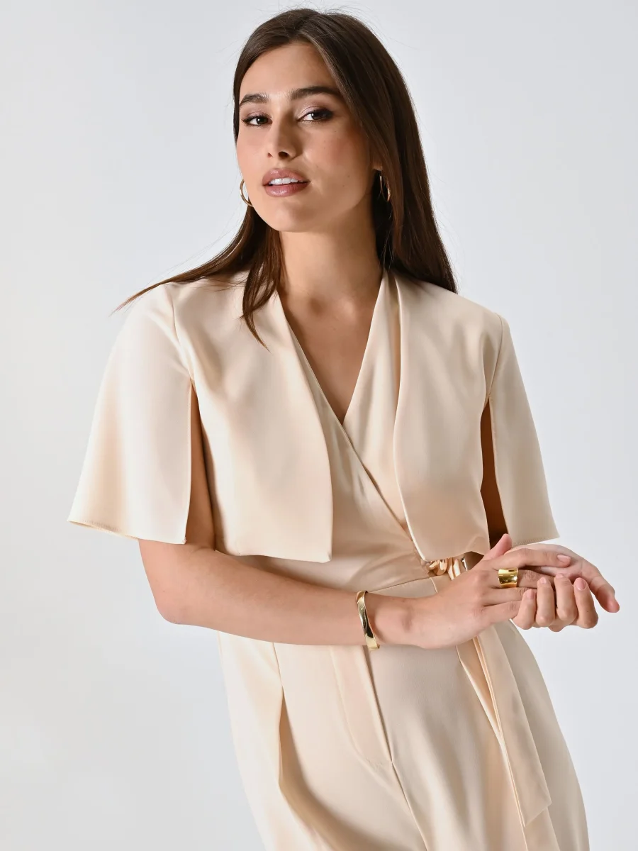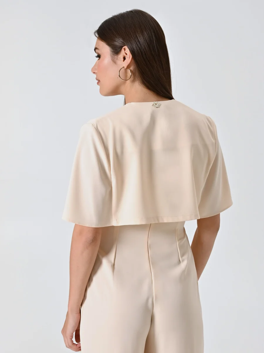 Il Coprispalle Beige in Tessuto Fluido è un capo raffinato e leggero, pensato per accompagnare con grazia gli outfit più eleganti.