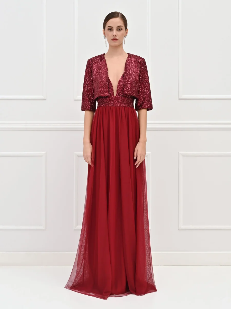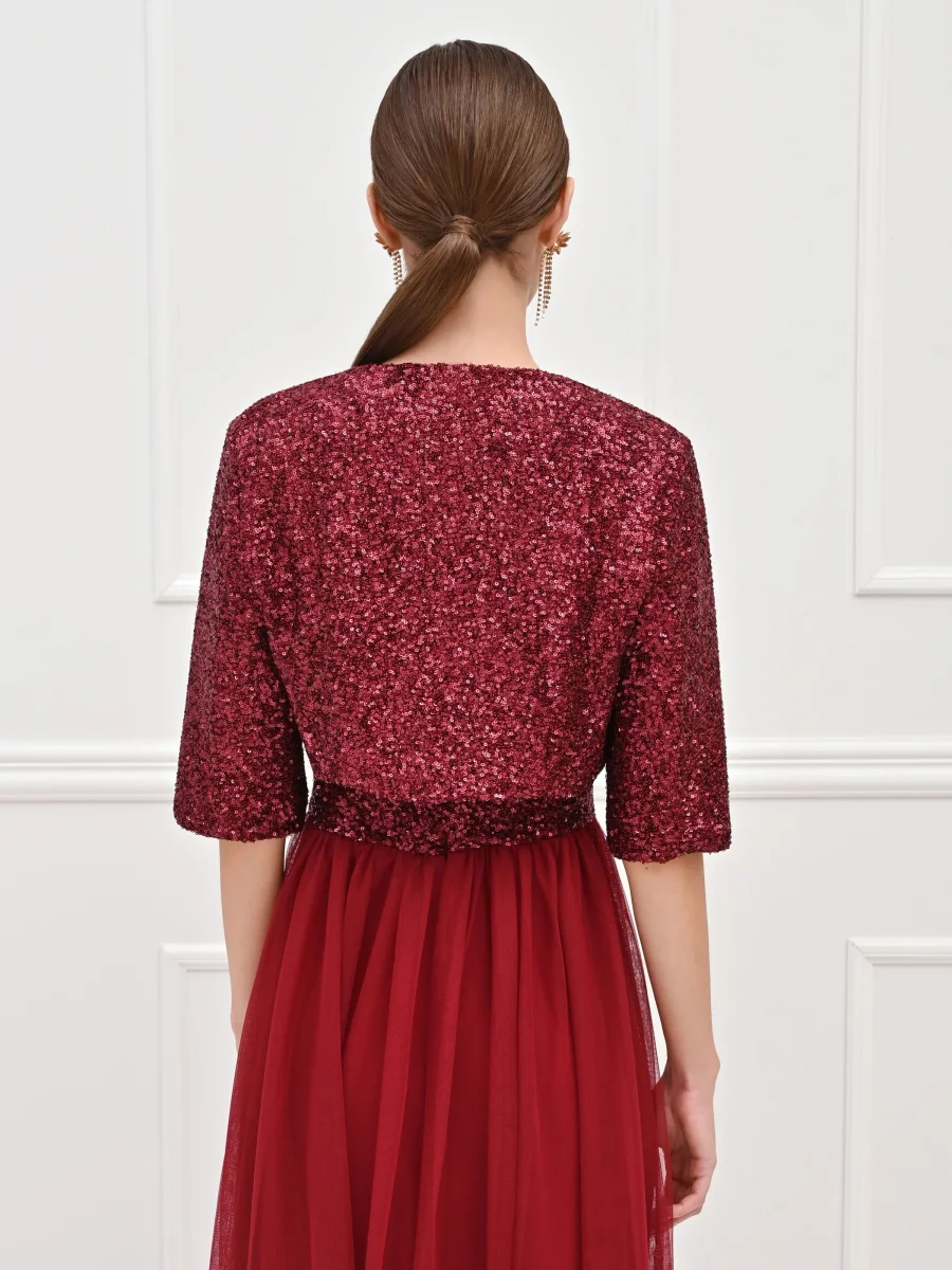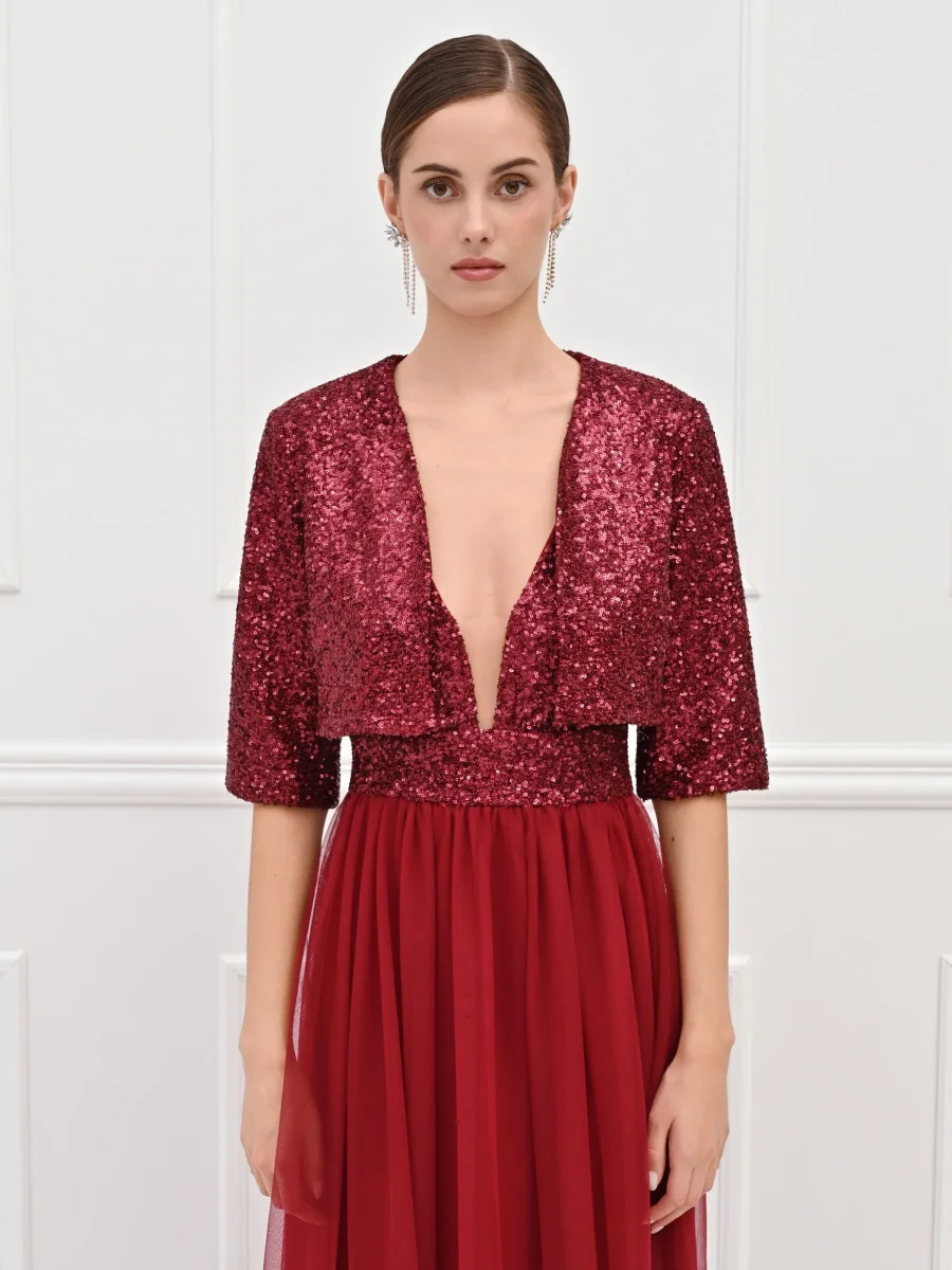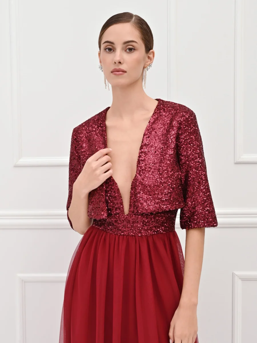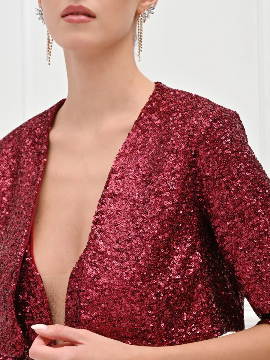 Un bagno di luce che cattura ogni sguardo: il coprispalle bordeaux è il capo gioiello pensato per rendere indimenticabili i tuoi momenti speciali. Interamente ricoperto di luminose paillettes tono su tono, questo modello si distingue per la sua texture scintillante e per la ricca nuance del bordeaux, perfetta per la stagione autunnale. Il design presenta un taglio corto in vita, studiato per valorizzare la silhouette senza nascondere i dettagli dell’abito, un profondo scollo a V che incornicia il décolleté e maniche a tre quarti.