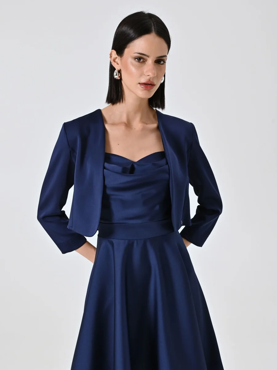 Realizzato in raso, il Coprispalle in Raso presenta una linea aperta, maniche lunghe e bordi stondati che accompagnano delicatamente le forme. La sua costruzione priva di chiusura lo rende pratico da indossare e perfetto per completare outfit eleganti con discrezione.