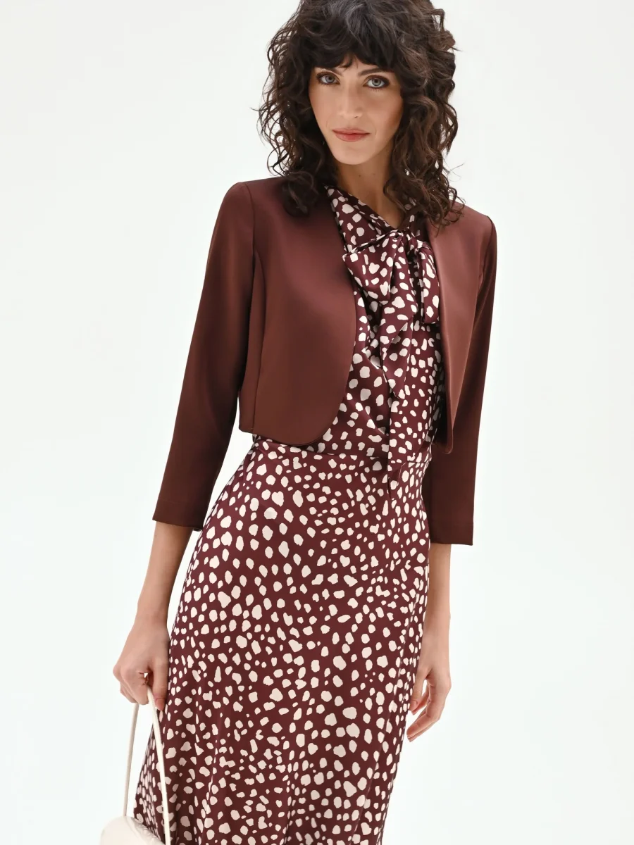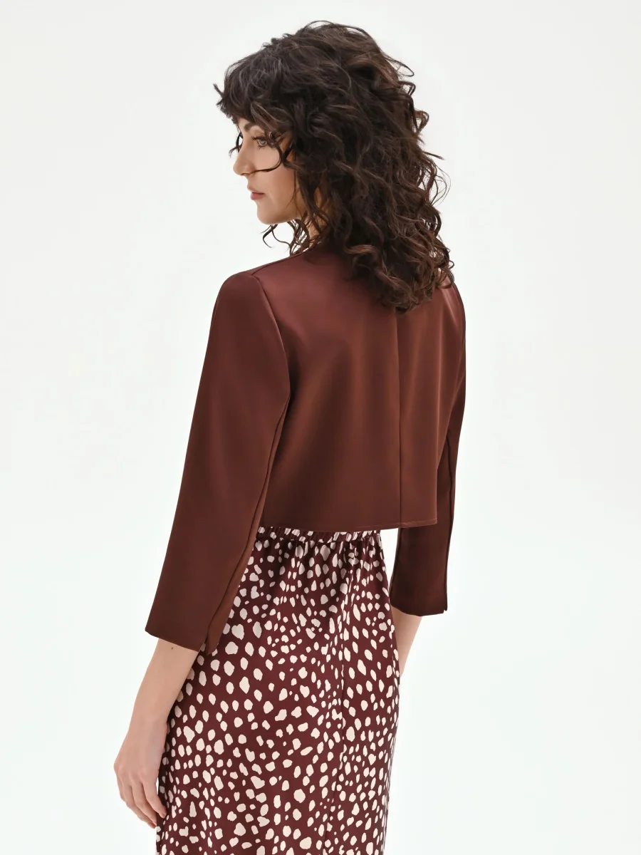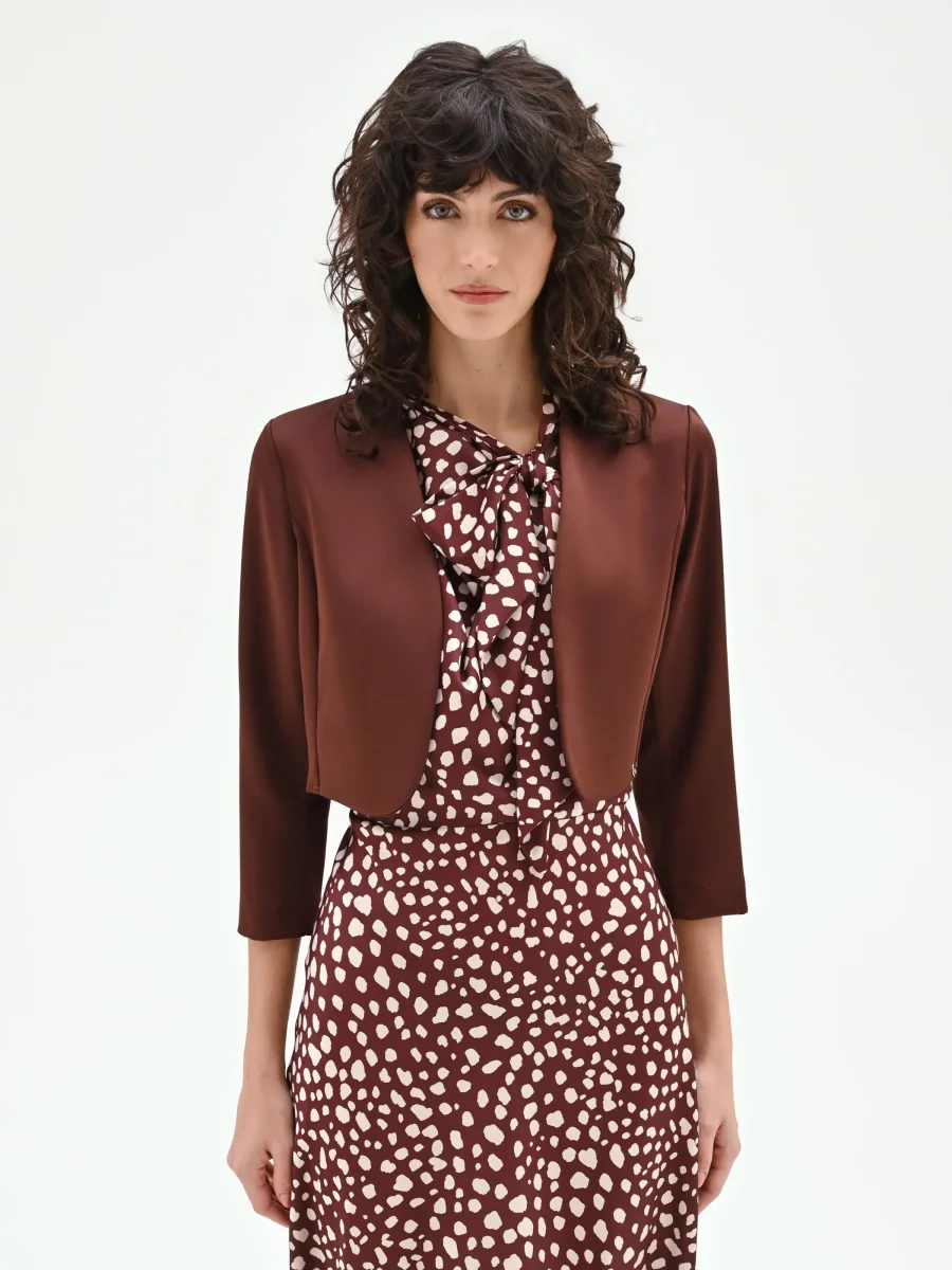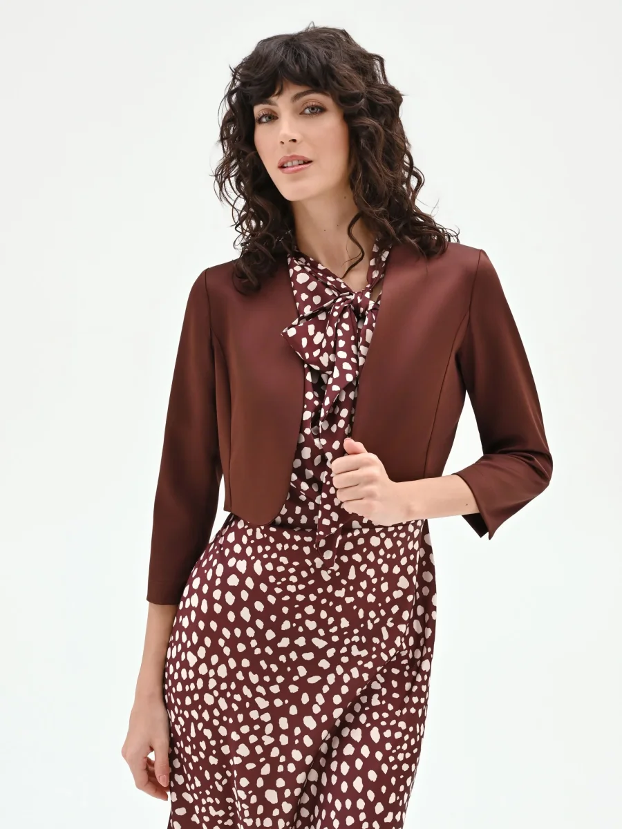Eleganza avvolgente e una nuance intensa: il coprispalla è il complemento perfetto per gli abiti da cerimonia e da sera. Realizzato in raso liscio dalla finitura luminosa, questo modello bolero è disegnato con una linea corta che si ferma strategicamente sopra il punto vita, valorizzando la silhouette senza appesantirla. Le spalle definite conferiscono una postura elegante, Il design aperto sul davanti, con bordi anteriori arrotondati, disegna una cornice morbida che accompagna le linee dell’abito indossato. Perfetto per completare un look per un evento importante, si abbina con armonia ai capi in tessuto coordinato, creando un total look sofisticato. Indossalo a un matrimonio o a una serata speciale per aggiungere una nota di colore decisa e raffinata.